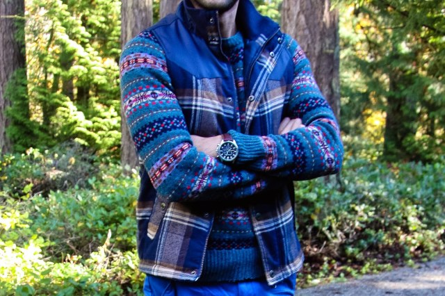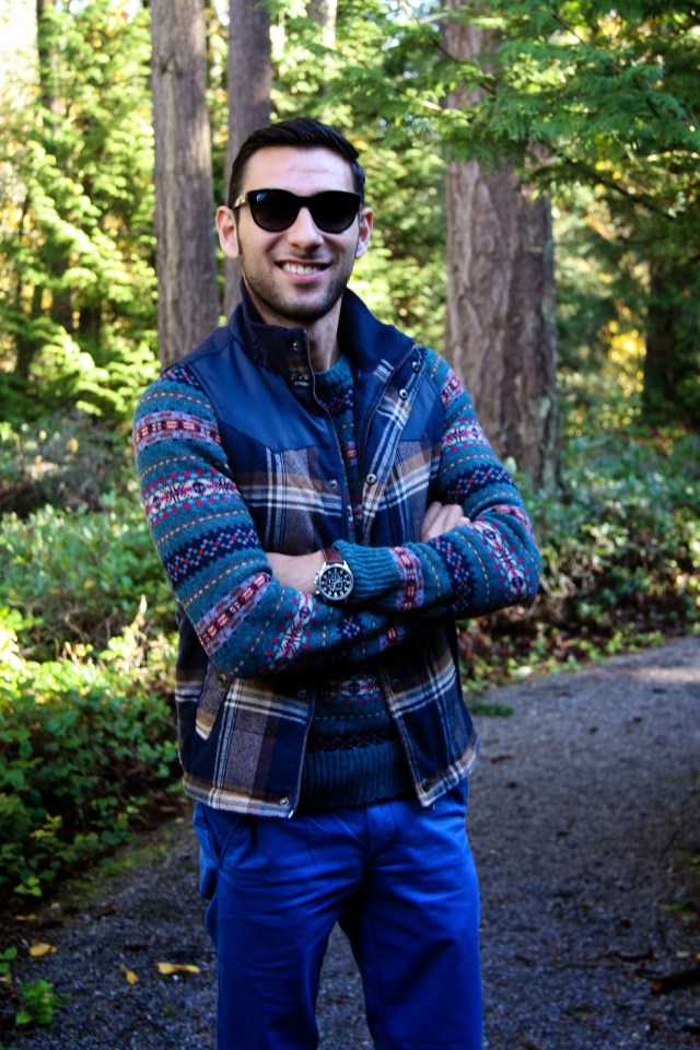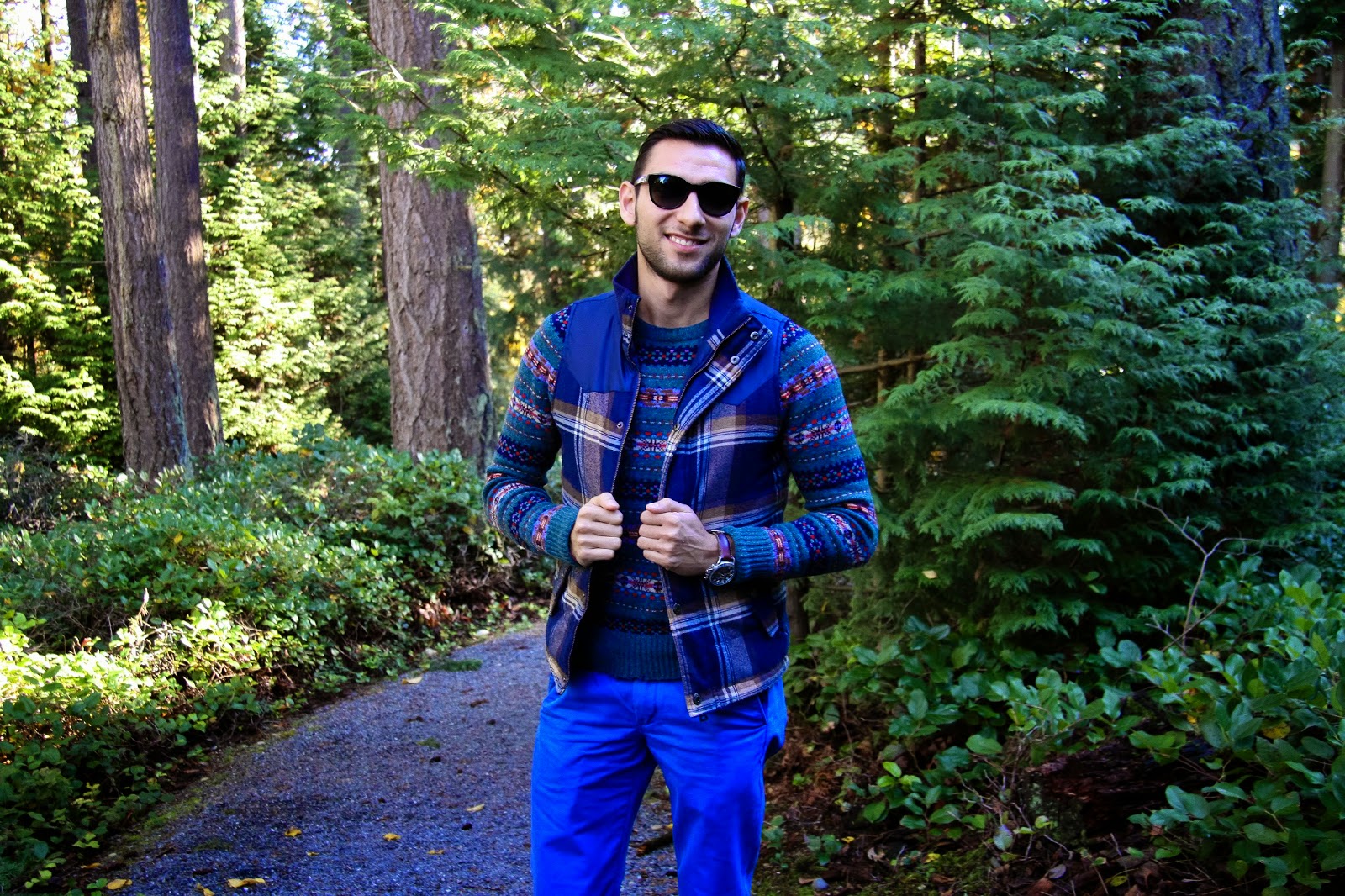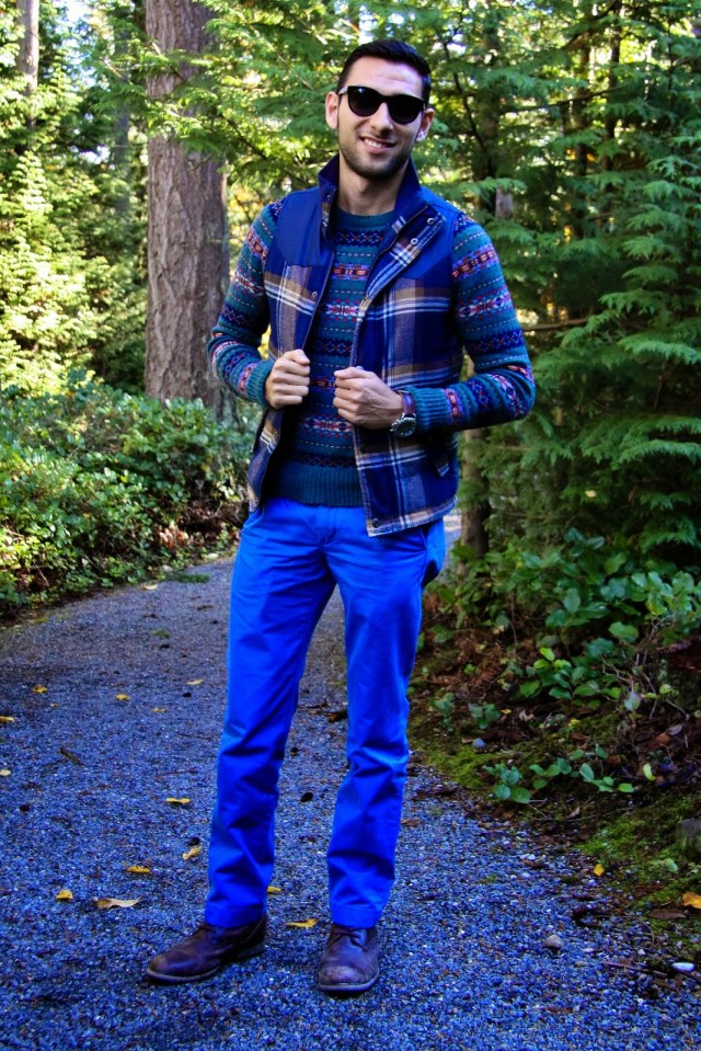 Take a look at this combination of winter prints. Each piece by itself is already pretty colorful, but it’s not until you put them together that magic happens. The key here is to know how to overlay the patterns. The vest has a square pattern, while the sweater has a horizontal one. This works well because the horizontal lines blend in, creating a sense of continuation. The vertical lines of the vest though still stand out, and it gives it the pop that just takes it to the next level. Then I just paired the mix with light blue chinos and my favorite shades.