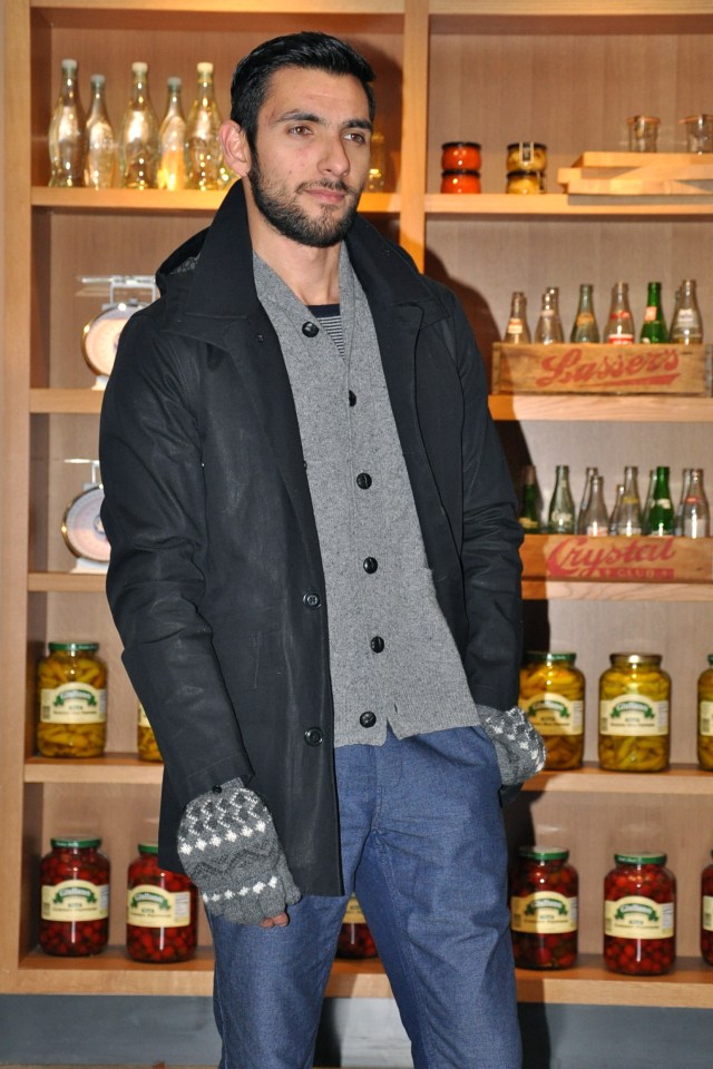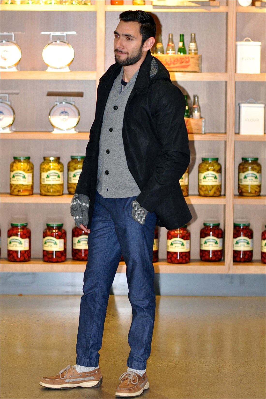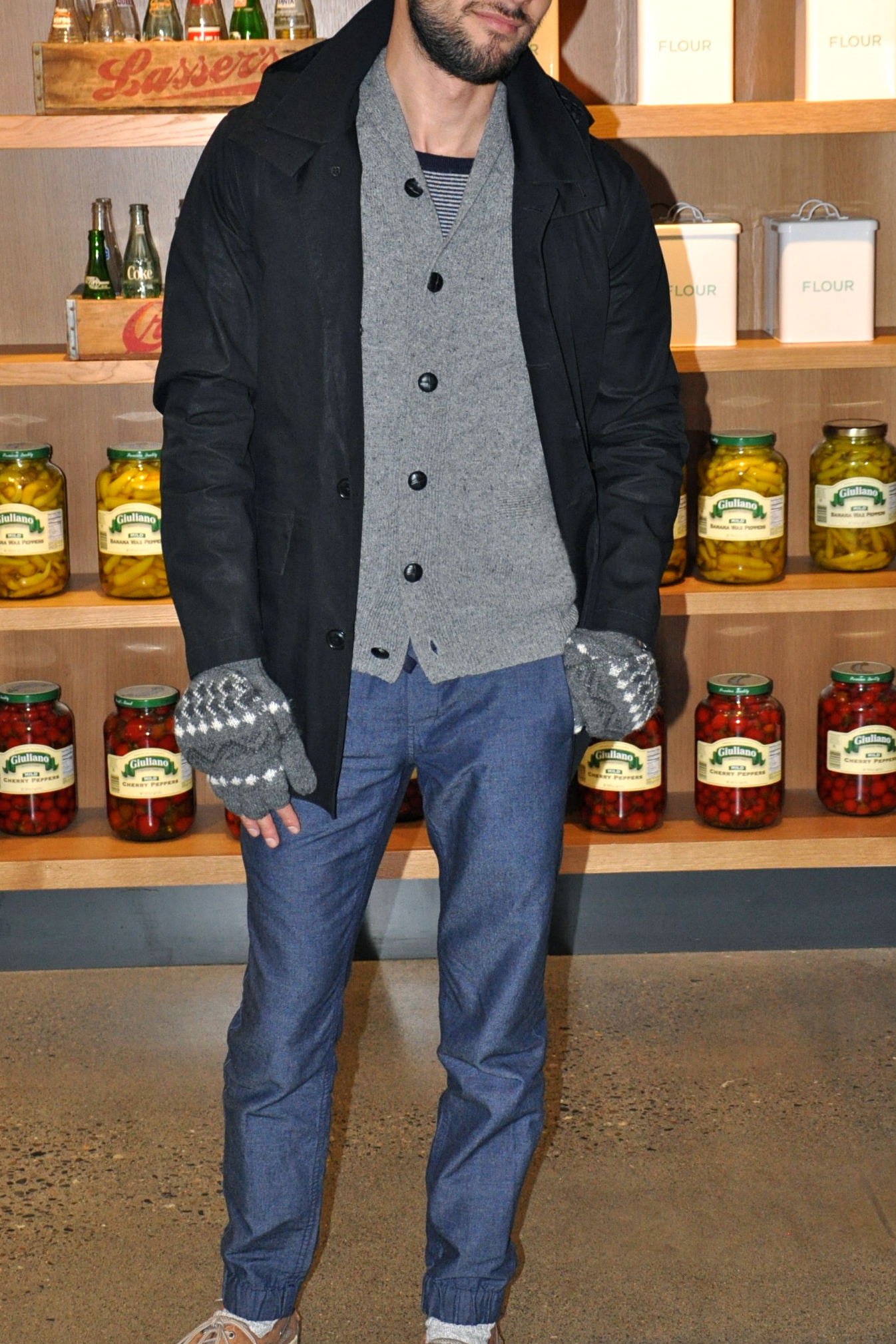 Detachable-hood Mac Club Monaco, Cardigan (Similar from J Crew), Italian Cashmere Sweater (Similar from J Crew), Joggers J Crew, Convertible Mittens Club Monaco, Shoes Sperry Top-Sider
