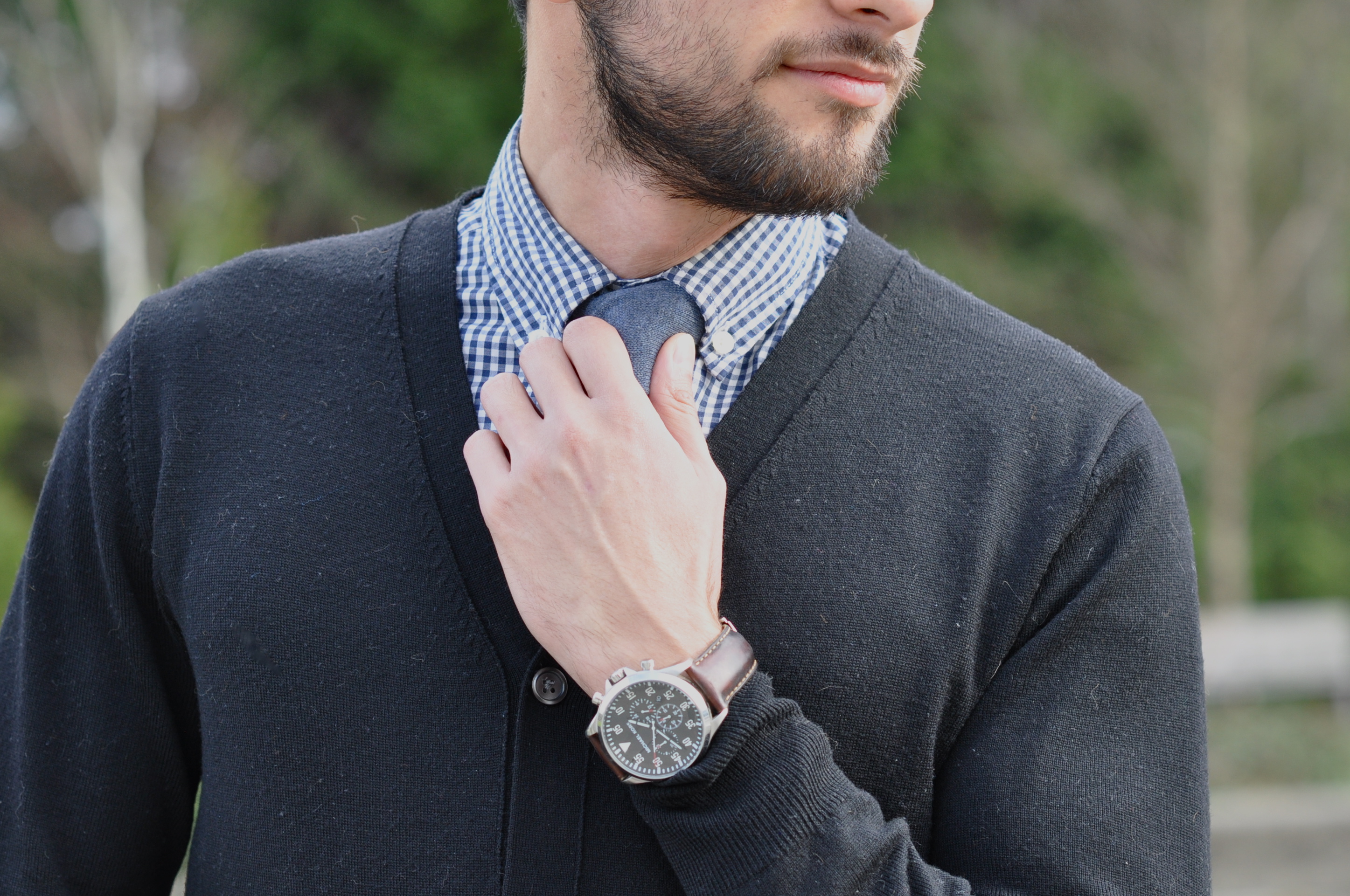 Here I’m turning the volume up a little bit with a more uptown guy look. There’s just something I really like about wearing ties: they are classy, extremely fashionable, and they lift up casual outfits a lot. Pair a nice tie with a simple button-down, say a checkered plaid shirt, and you will notice the big difference it can make. For instance this blue tie, which is one of my favorites, gives the shirt the punch it needed to become a statement piece. Even though it hasn’t been too cold lately it’s still good to wear some layers, especially during the morning, so a wool cardigan and jacket will do the trick to keep you warm during the day. I’m also showing you guys my phone case. When I saw it in the store the other day it was love at first sight, and I just feel it’s really me (you can never wear to much plaid right?) For the bottom part I’m wearing joggers and tennis shoes. See how you don’t need to dress super formal to be able to pull off a tie in your look? It looks preppy, hip, and it is way more comfortable. Do you guys agree with me? Are you digging this look?