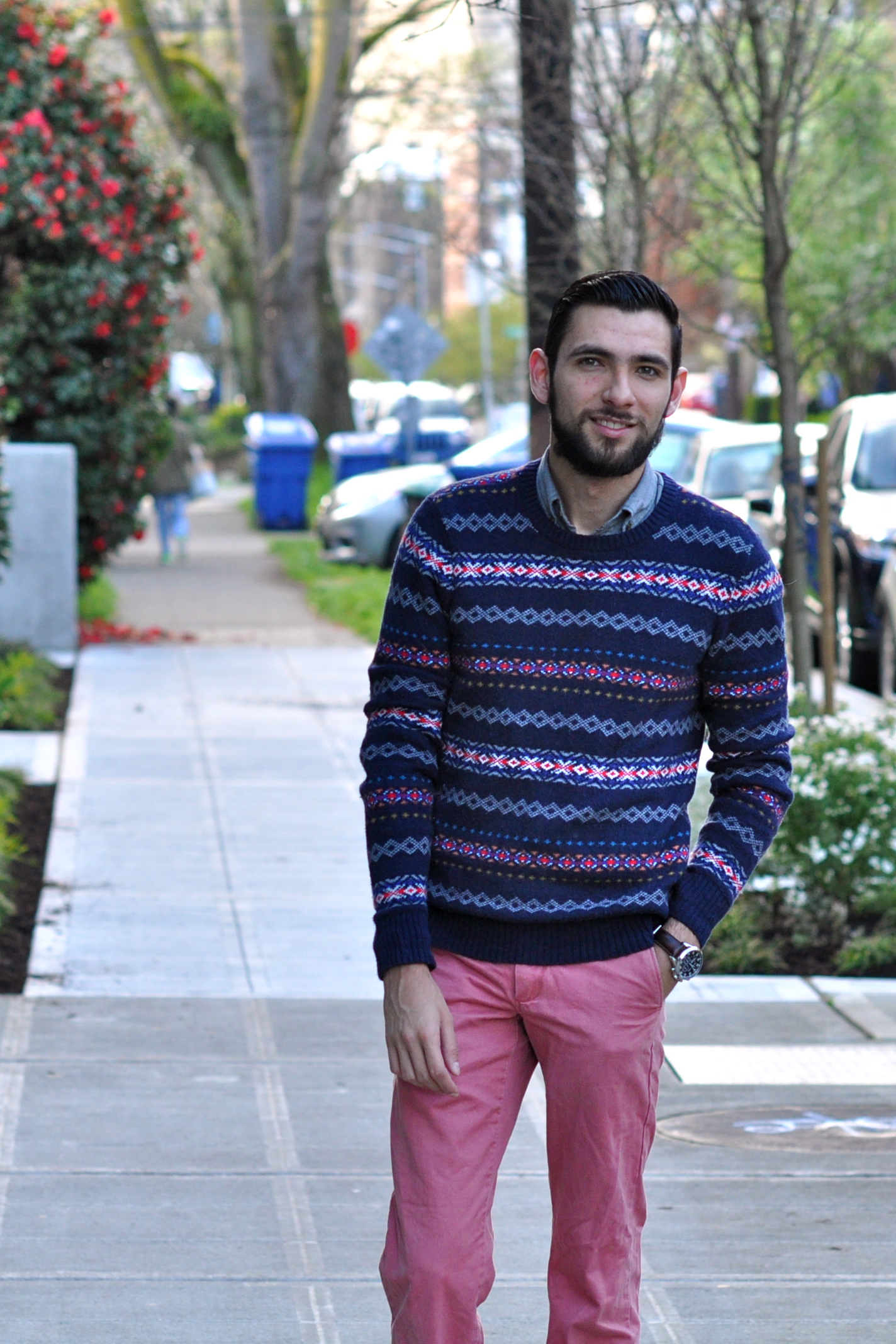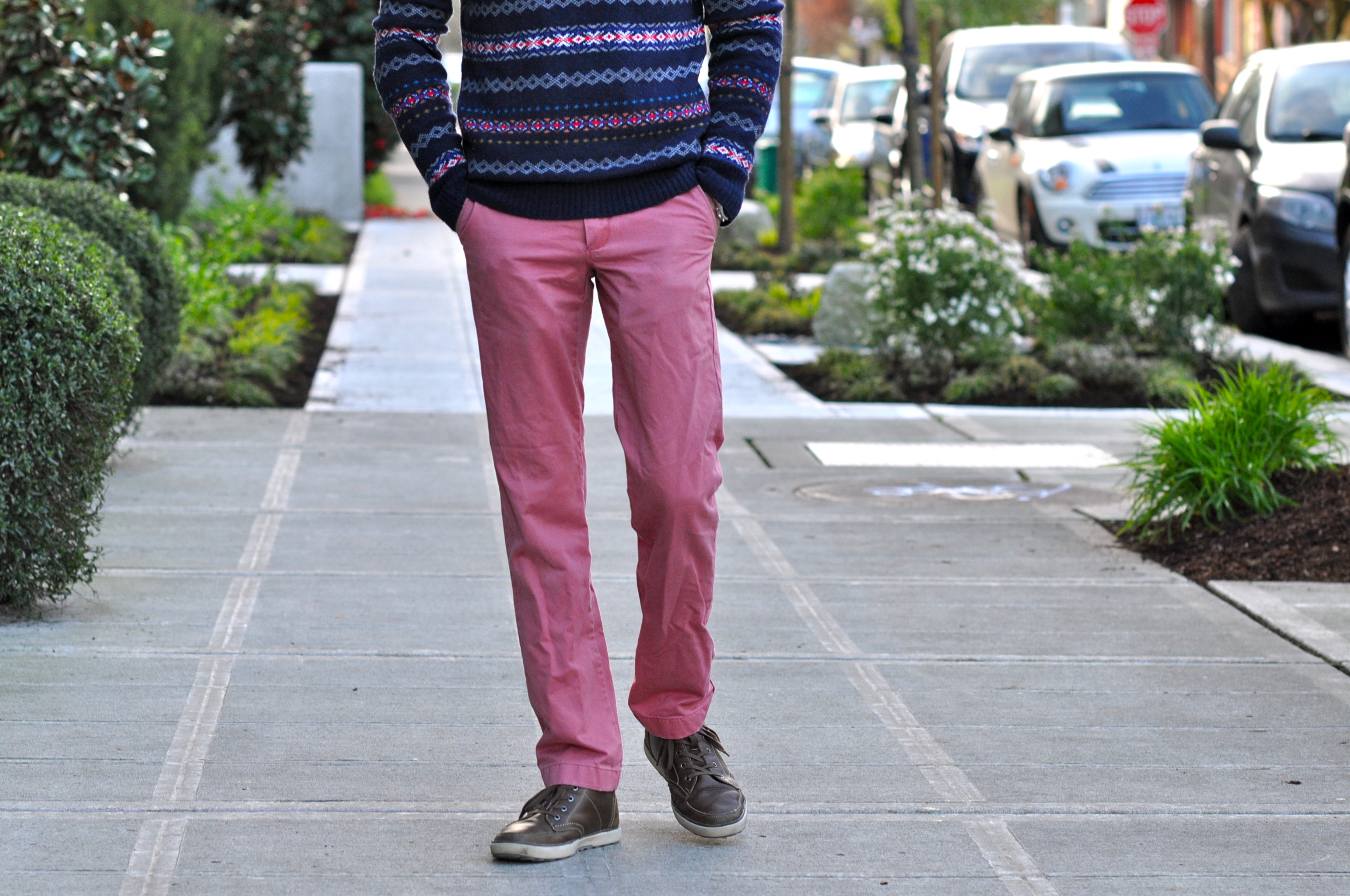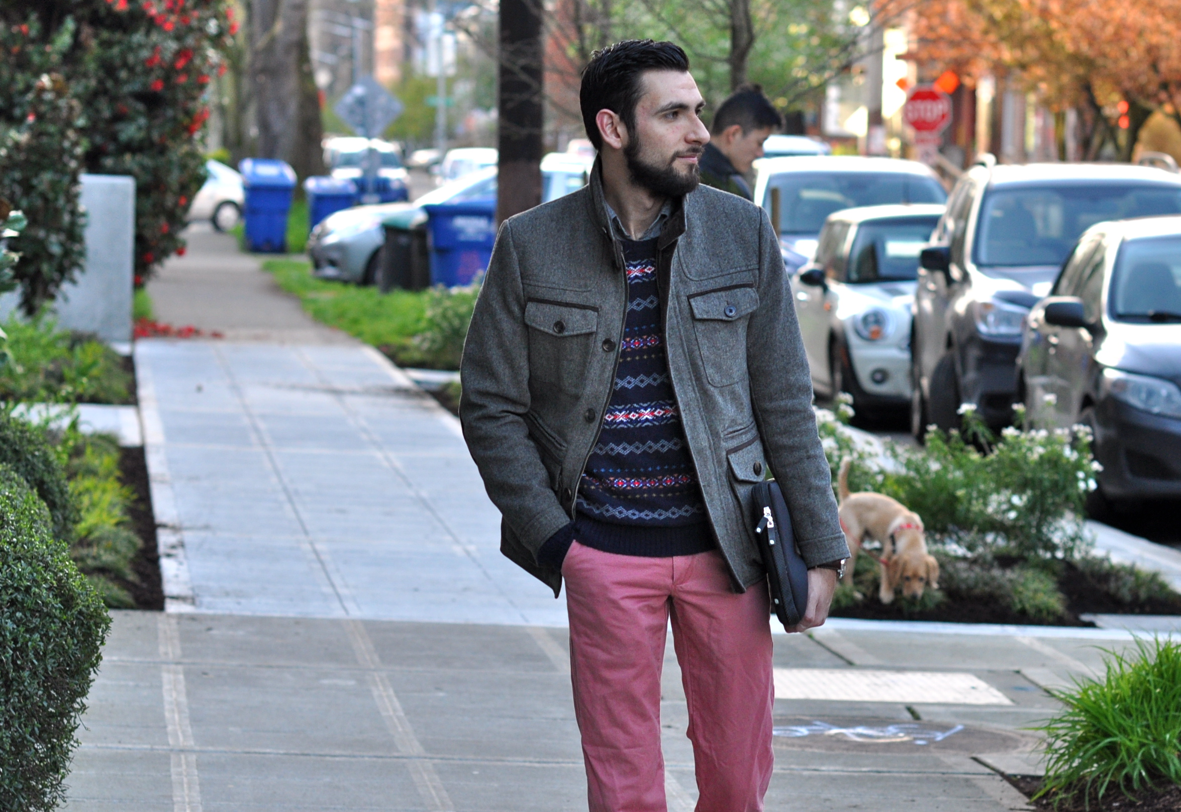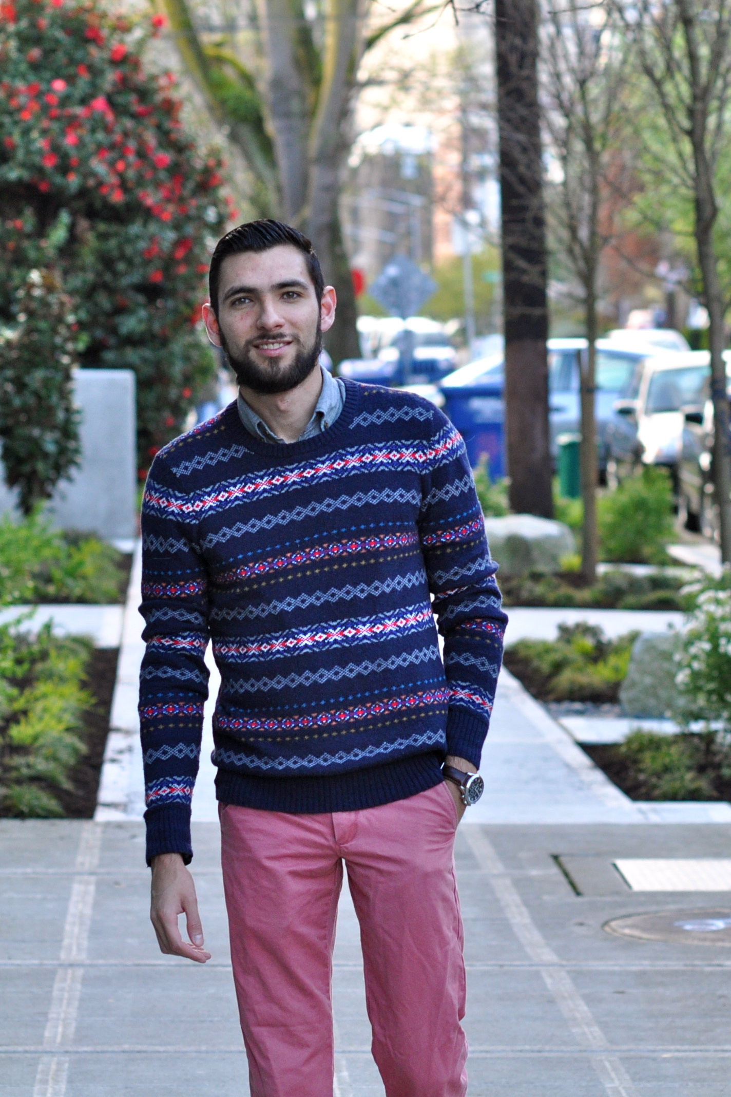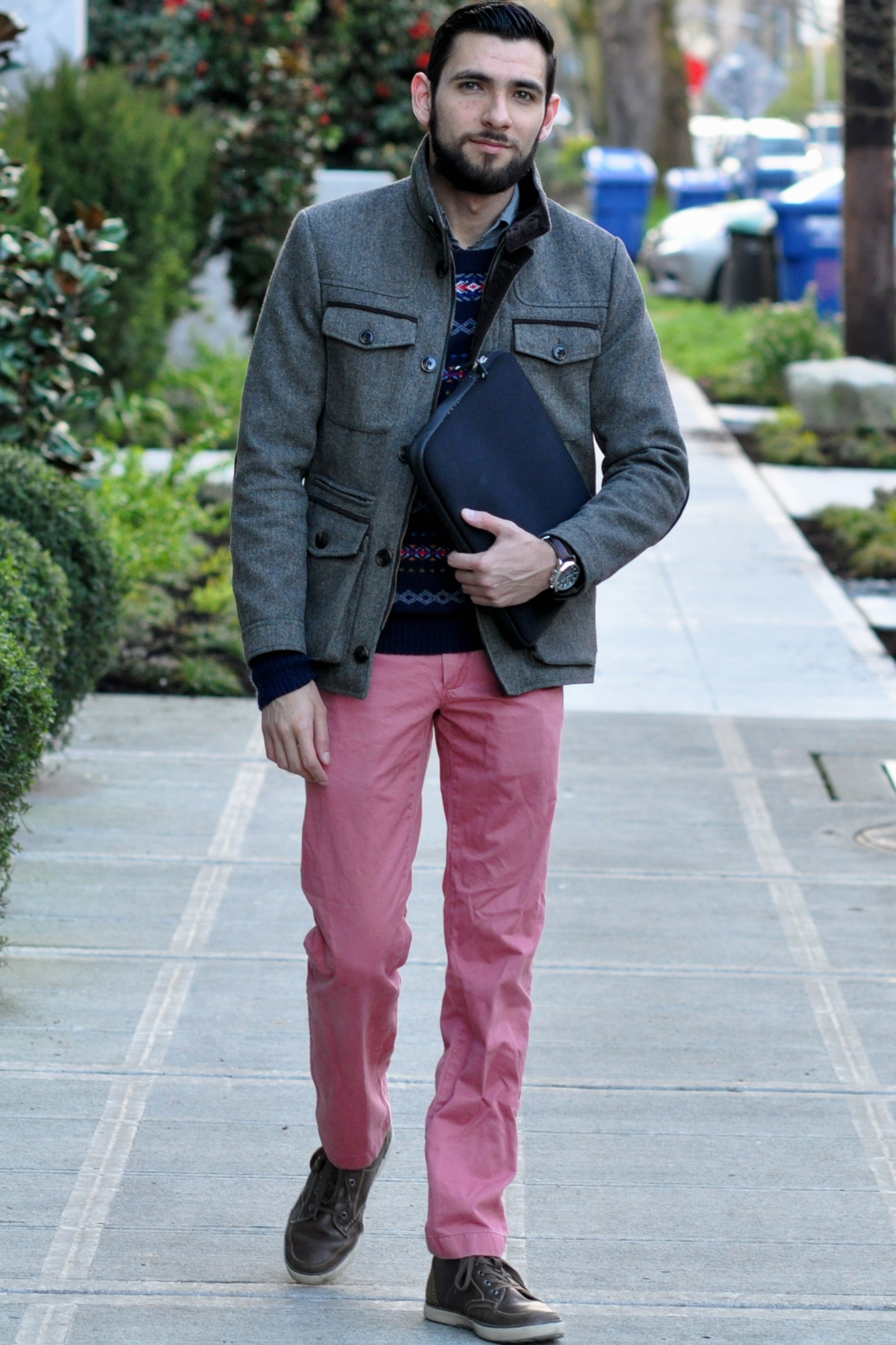 Jacket by H&M (Similar by Kane and Unke), Patterned sweater by American Eagle (Similar by J Crew), Pink washed chinos by J Crew (Similar by H&M), Button-down by J Crew (Similar by 21 Men), Boots by Aldo (Similar also by Aldo)