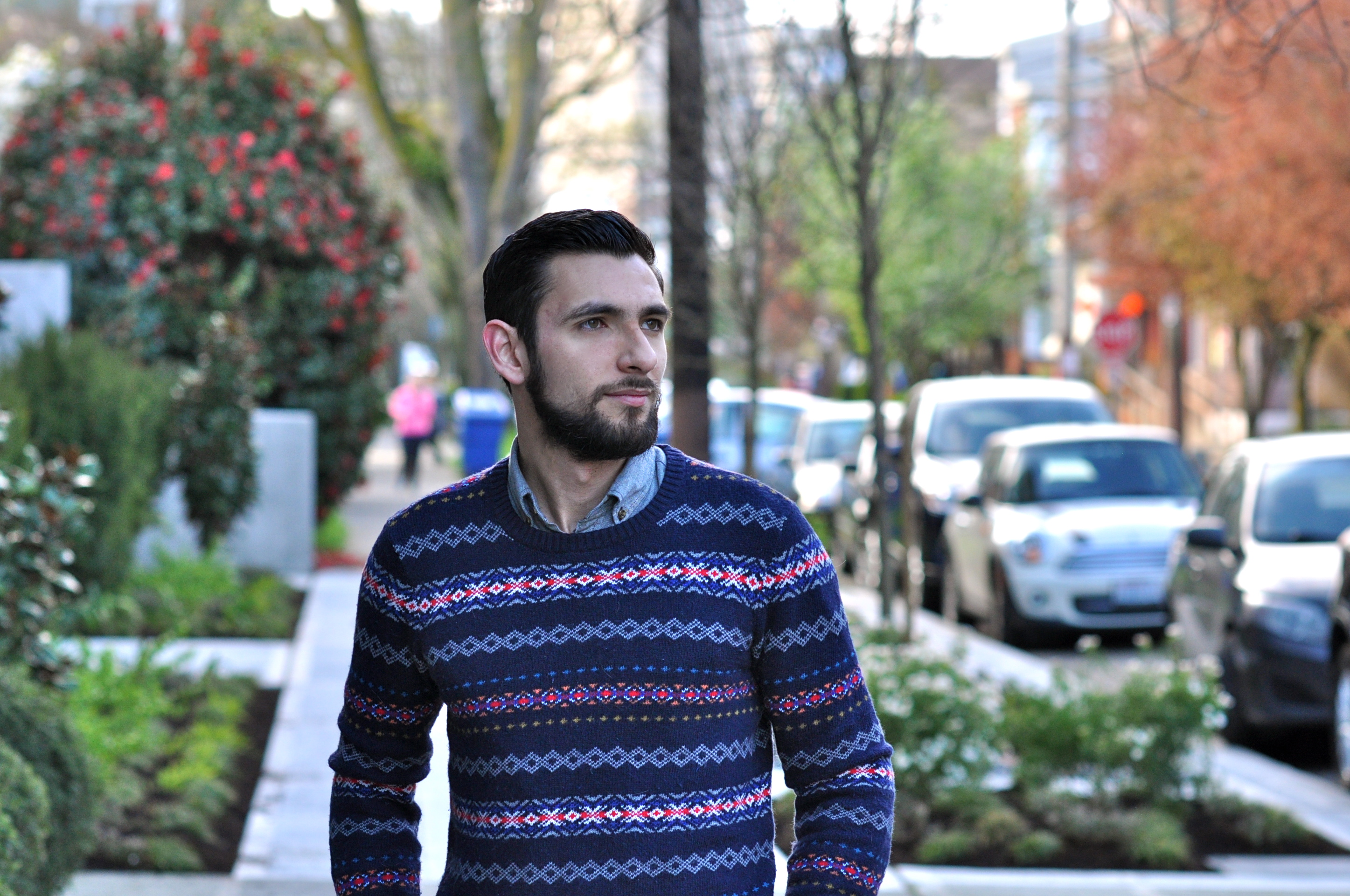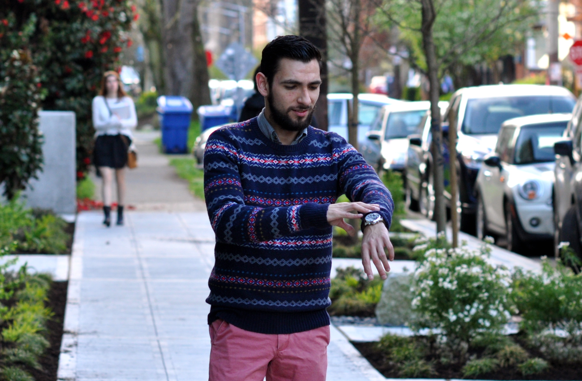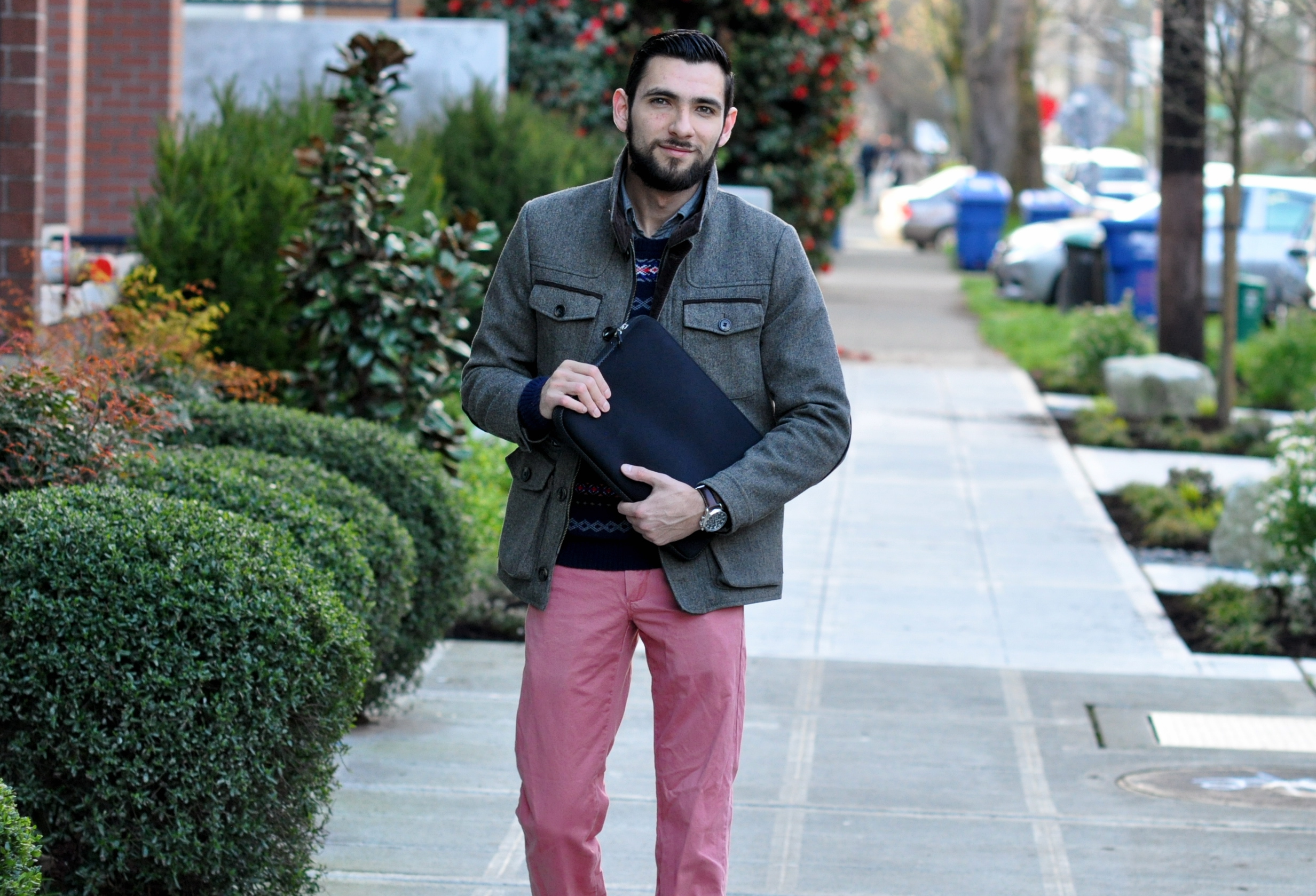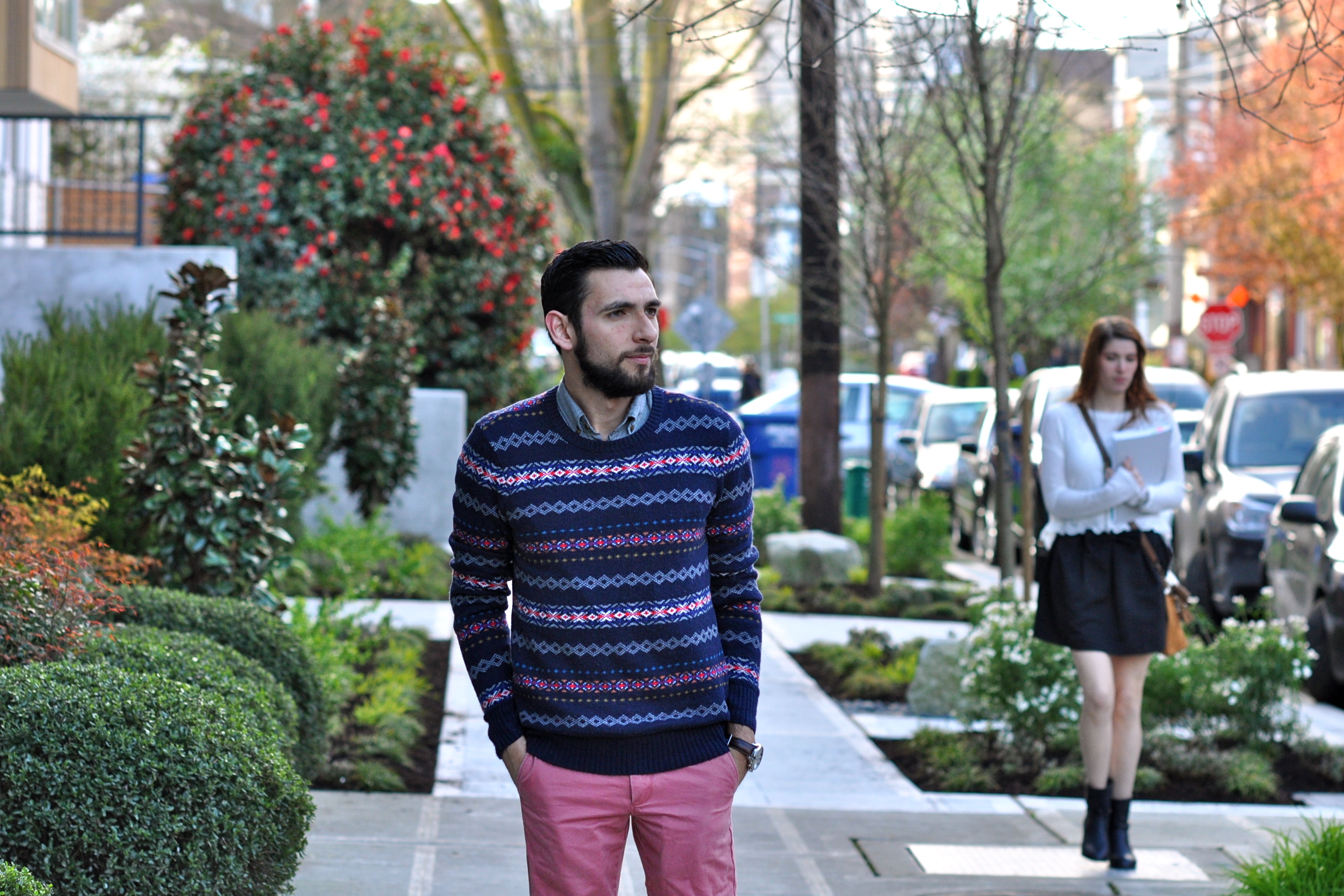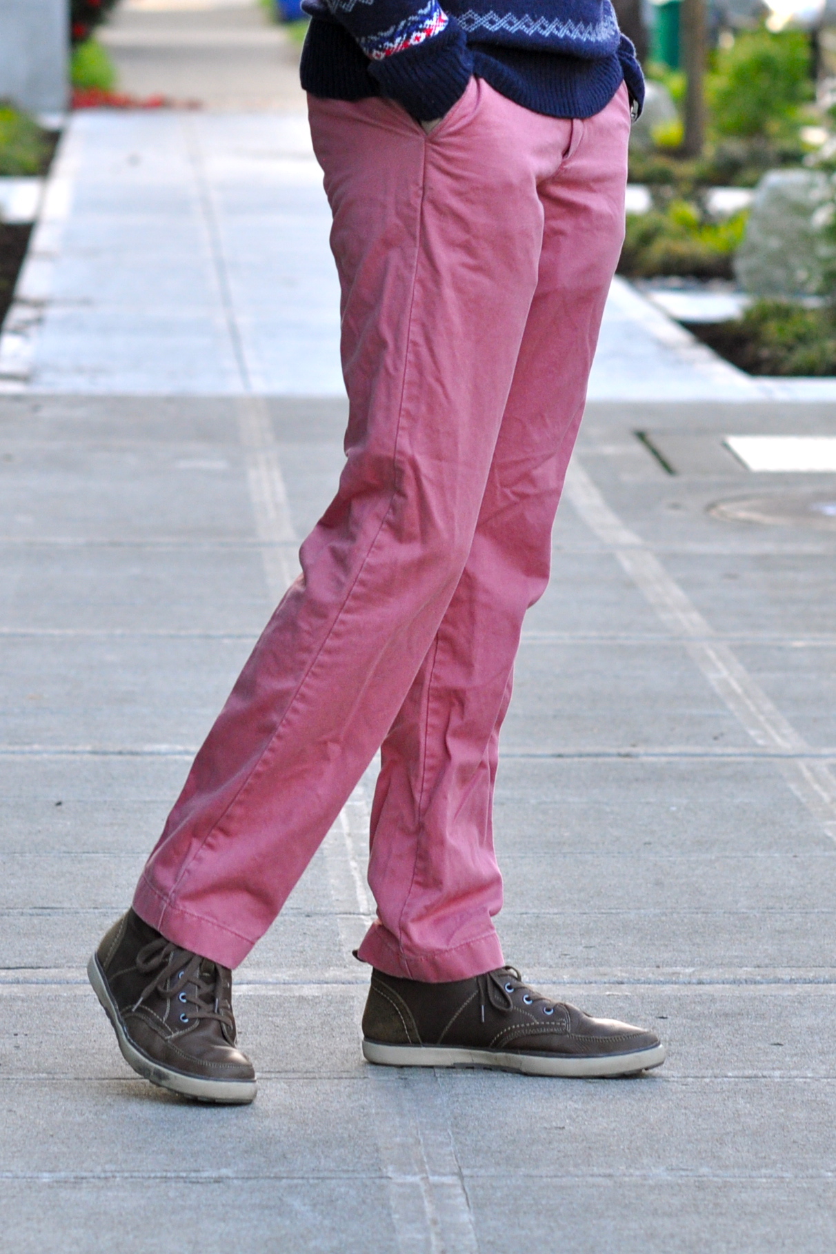 Jacket by H&M (Similar by Kane and Unke), Patterned sweater by American Eagle (Similar by J Crew), Pink washed chinos by J Crew (Similar by H&M), Button-down by J Crew (Similar by 21 Men), Boots by Aldo (Similar also by Aldo)
