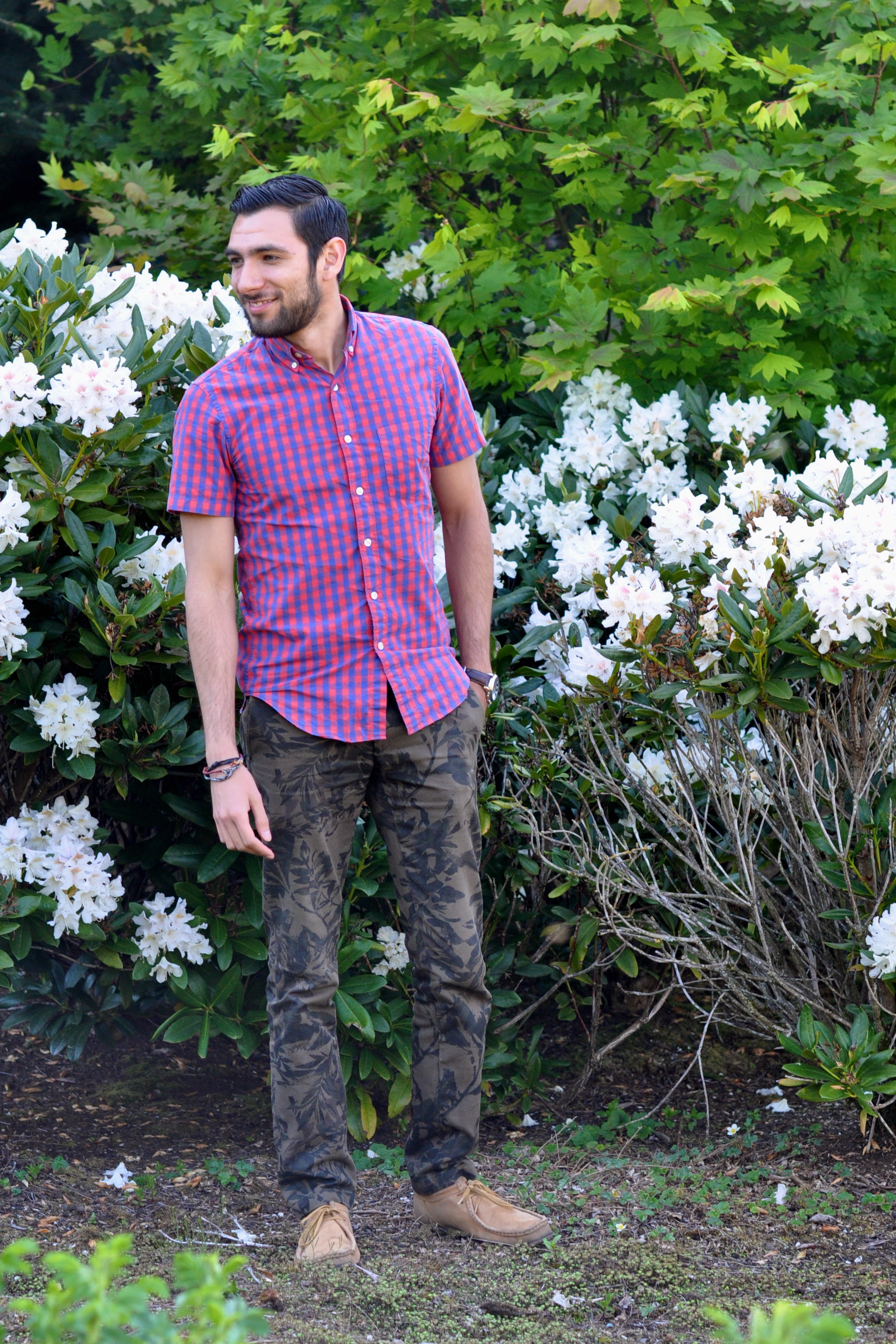 Checkered short-sleeve button down by J Crew (Similar by Topman), Camouflage pants by Club Monaco (Similar also by Club Monaco), Watch by Michael Kors, Shoes by Clarks