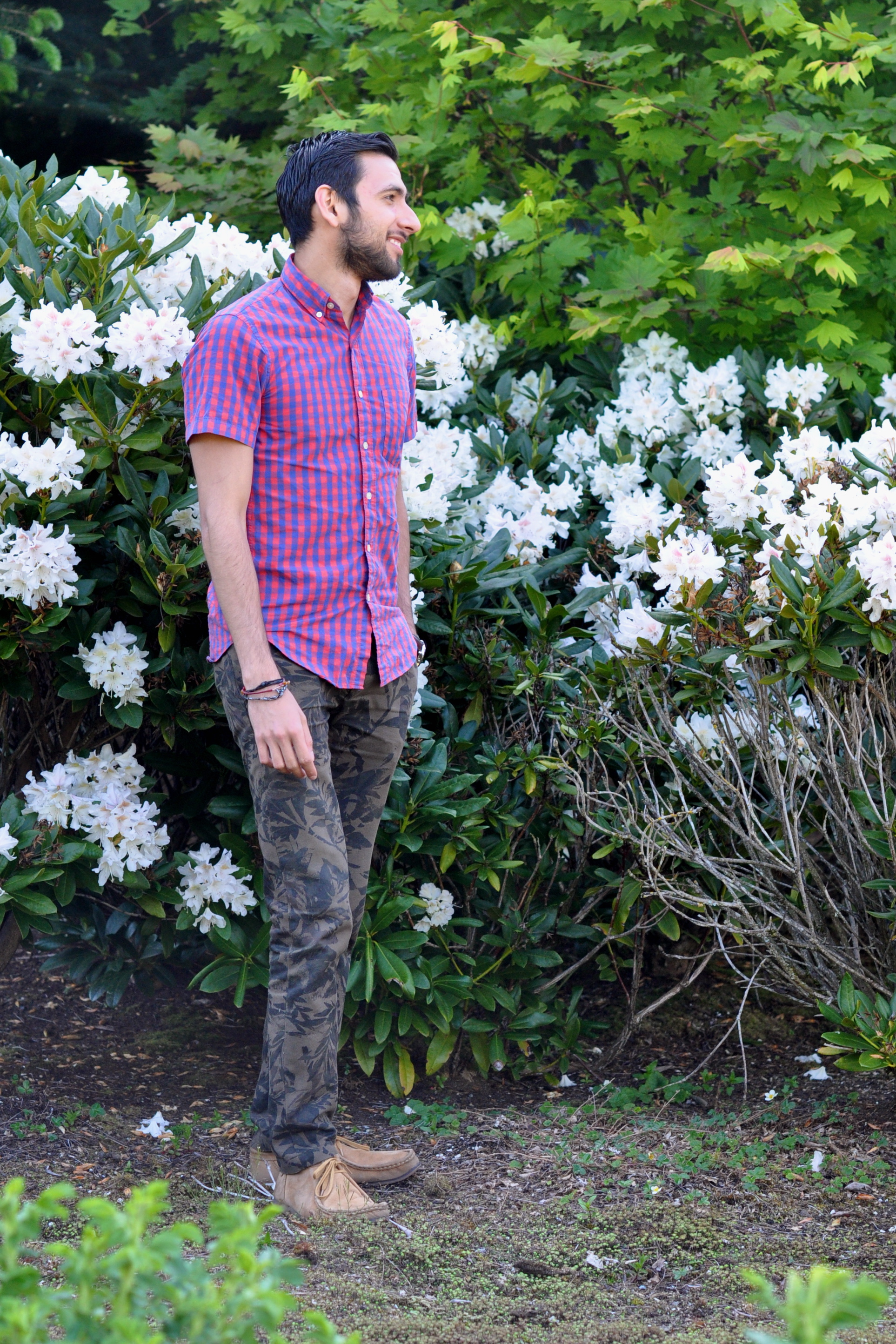 Back to my outfit shots with Kim, we were wandering around campus the other day and we found this pretty spot with flowers and a nice green patch right by the soccer fields. For this occasion I decided to wear a double print combination, because I’m a big fan of color and they are particularly in this season. I really dig the print on these camo pants. It looks like a regular camo, but it’s actually leaves. Then I went for a very bright, checkered button down for the top. You have to think about color balance here. A shirt this bright would not look so good with very bright, colorful pants. That’s why they look just great with these more discrete pants. Finally I completed the look with my Clarks boots. Does it work for you? Don’t be afraid to play with prints, it’s totally fine to wear different prints as long as the color balance is there. Thank you Kim for these photos and for a very relaxed afternoon. I love that you picked this location!