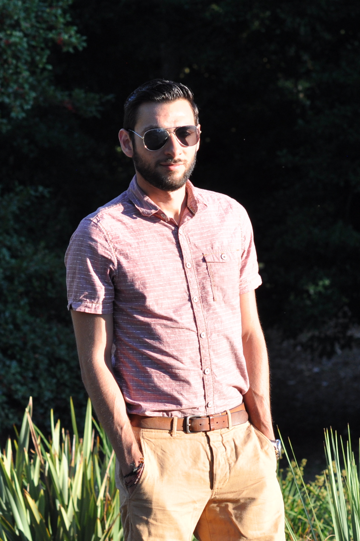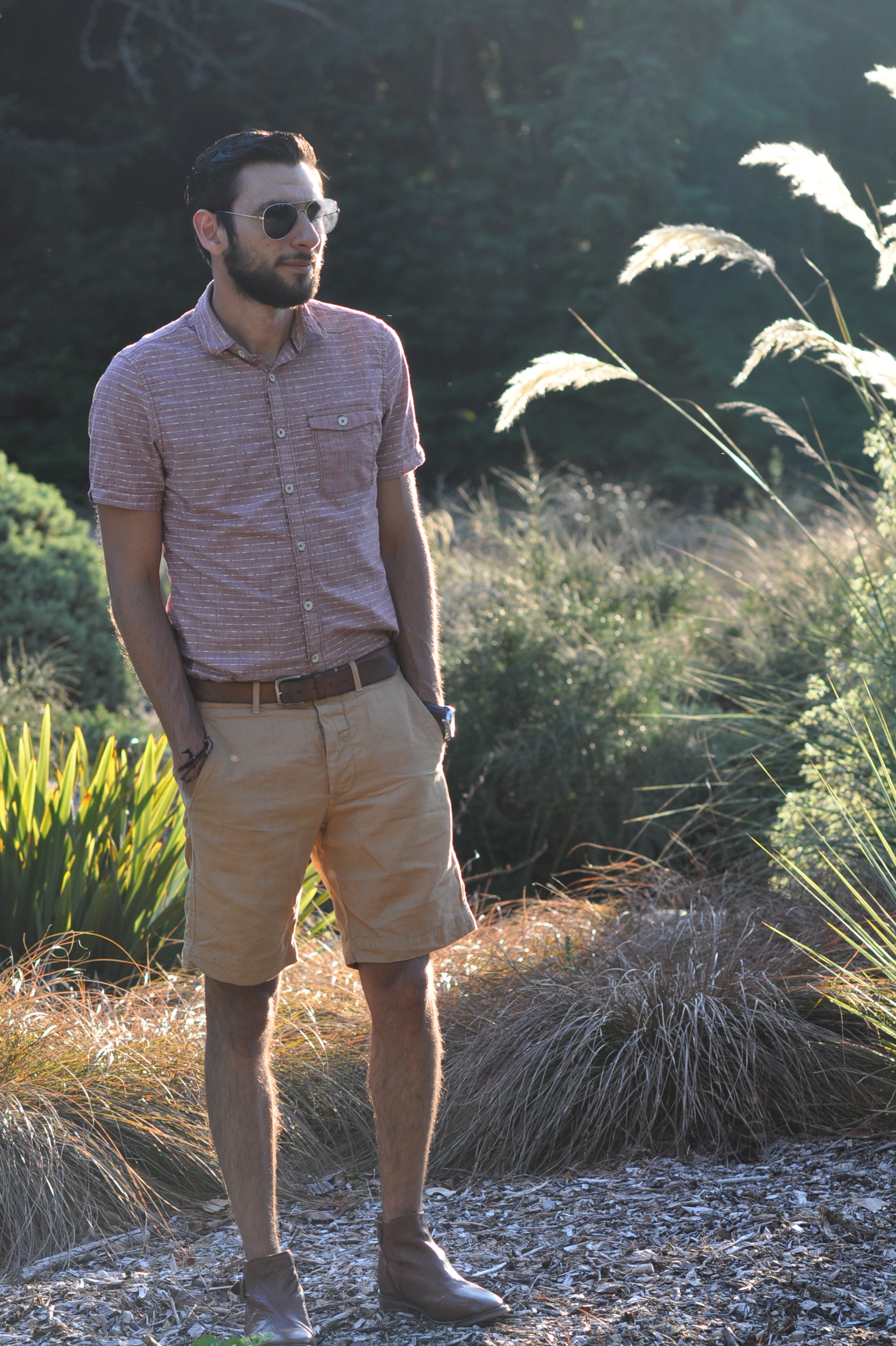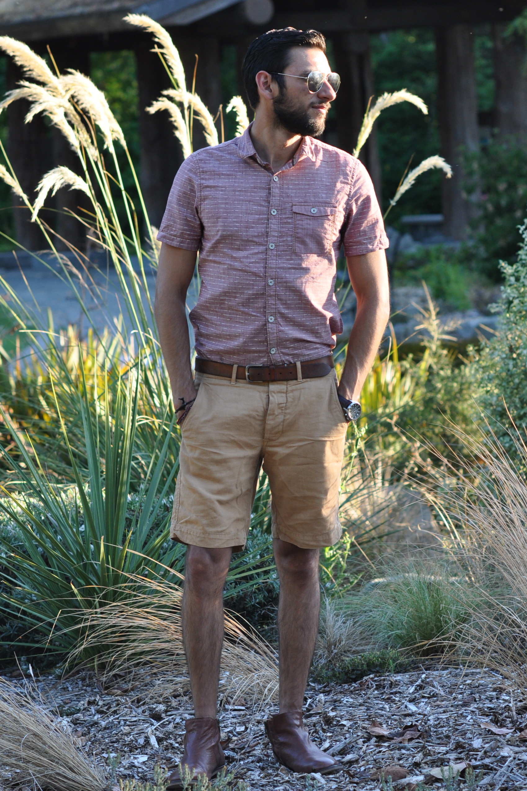 Short-sleeved shirt by Jeremiah Clothing, Brown khaki shorts by J. Crew, Belt by Club Monaco, Leather desert boots from Aldo (Similar also from Aldo), Shades from Express