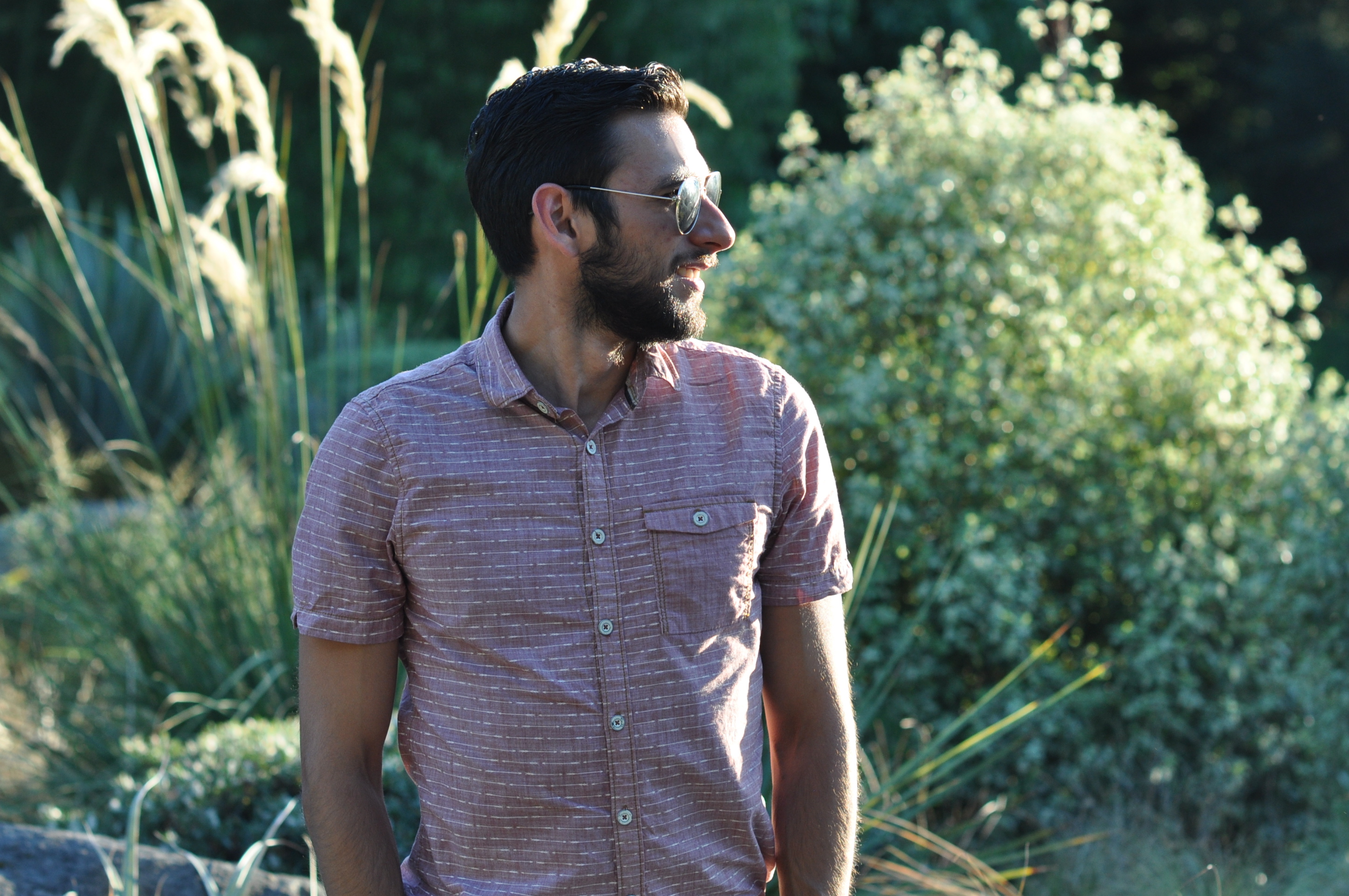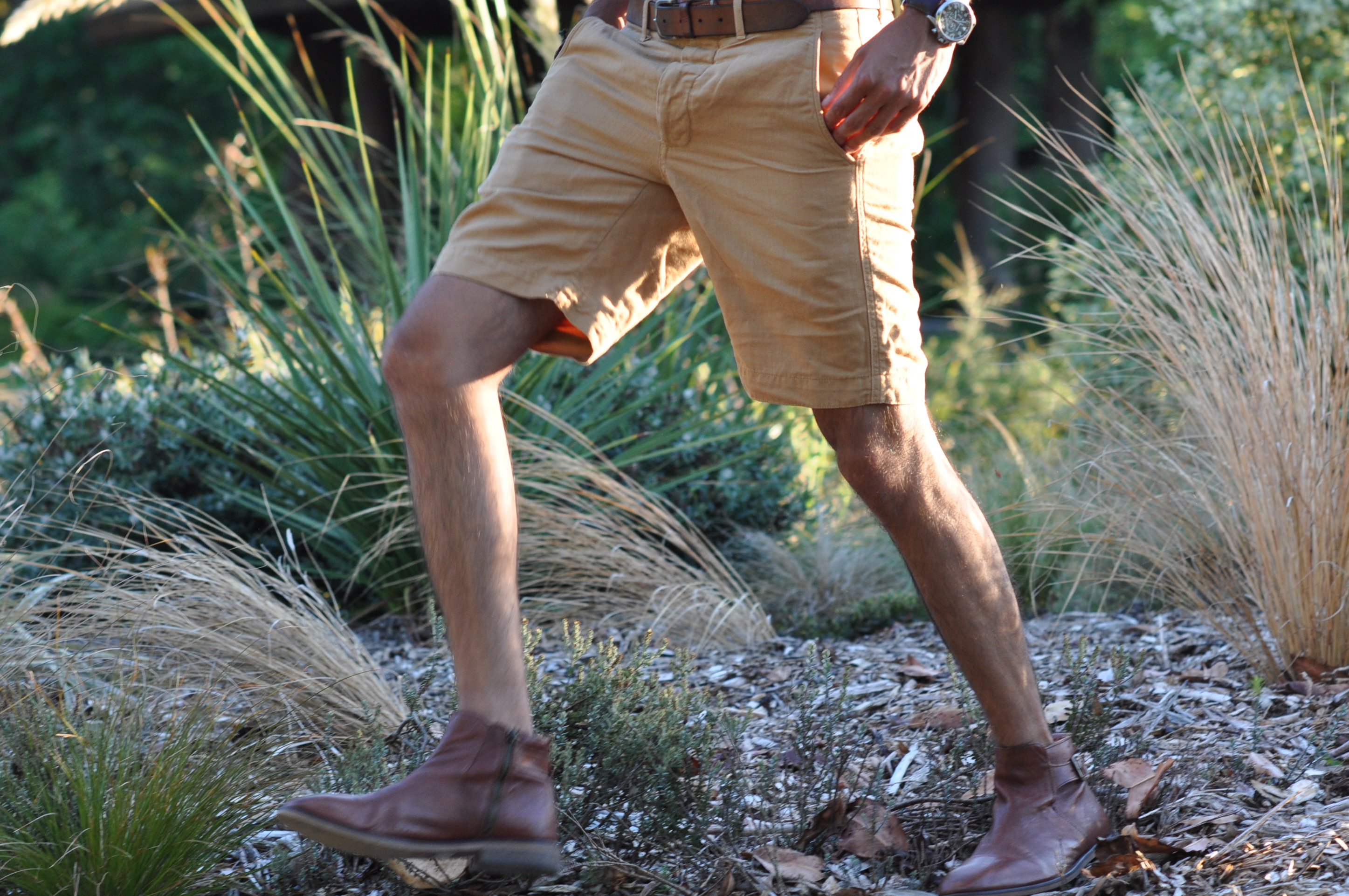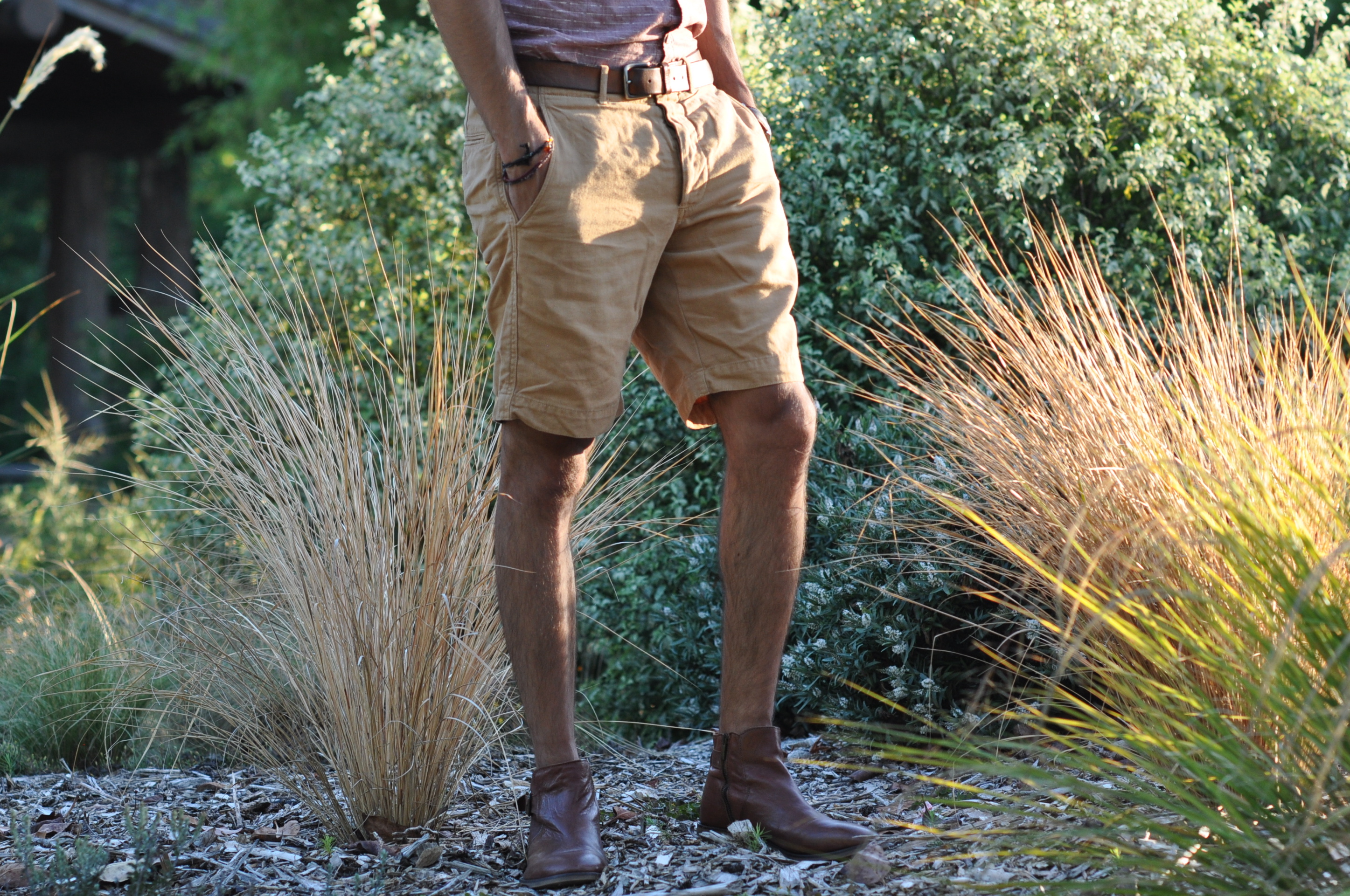 For this post, I wanted to show you some pics I shot the other day in the Seattle Arboretum. This place is absolutely amazing, and it’s just a few blocks away from my new house. The Arboretum is a park that lies right in the heart of Madison Valley and Capitol Hill. It’s so beautiful and diverse; there are both really tall, green pine trees and some drier grounds with grasslands and trails as well. I was gallivanting the other day and I spotted this nice place with wheat stalks and spiky long grasses that really inspired me to take pictures bathed in the summer sunlight. I decided to wear my t-shirt once more from Jeremiah Clothing and these brown, khaki shorts from J. Crew. Pairing those with some nice leather desert boots and a leather belt made me feel like a real ranger. I mean, look at these pics, this is one of my favorite combinations from my latter posts. What do you guys think? Do you agree? I want to thank my roommate Carlos for taking these pics for me.