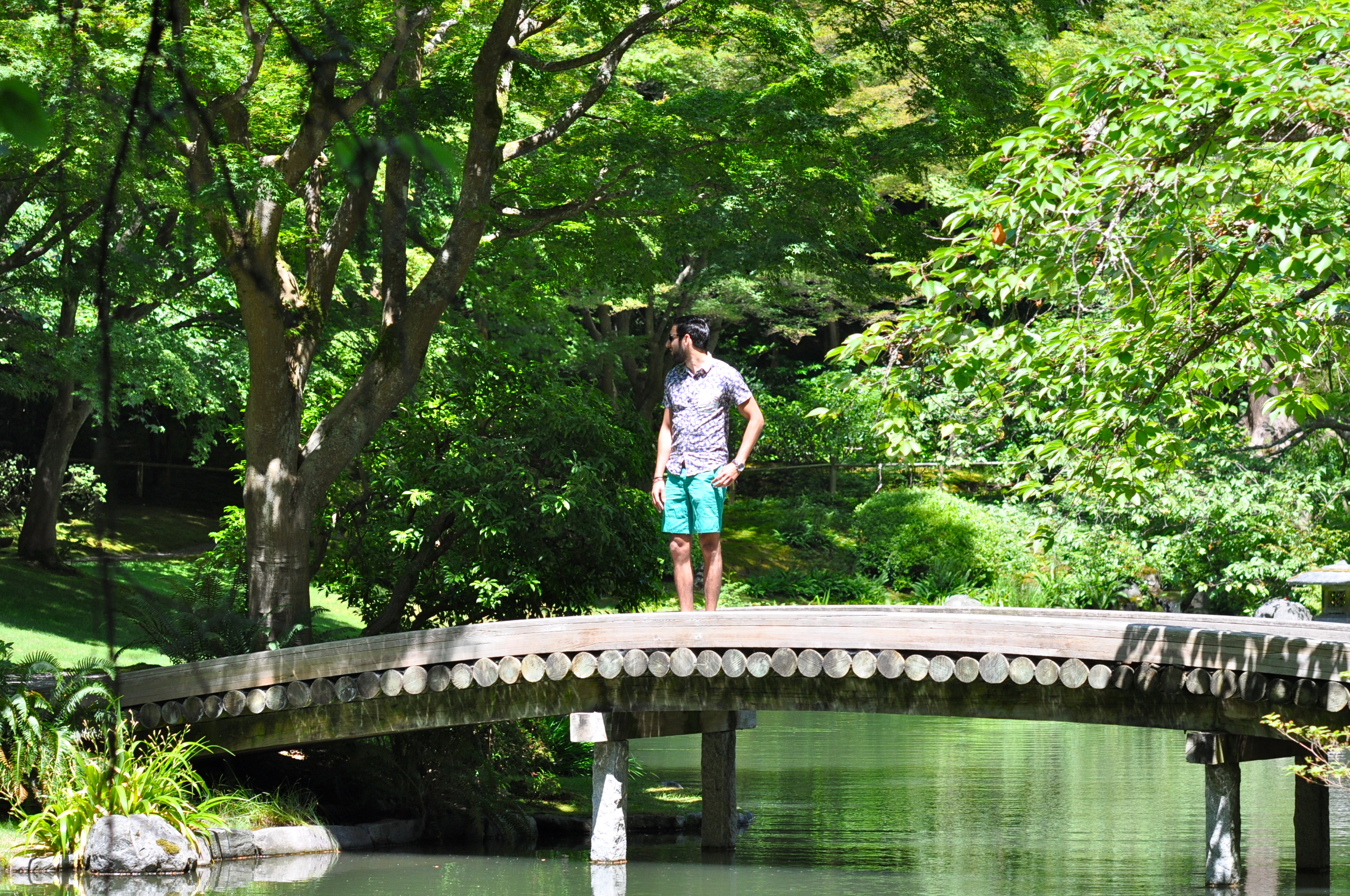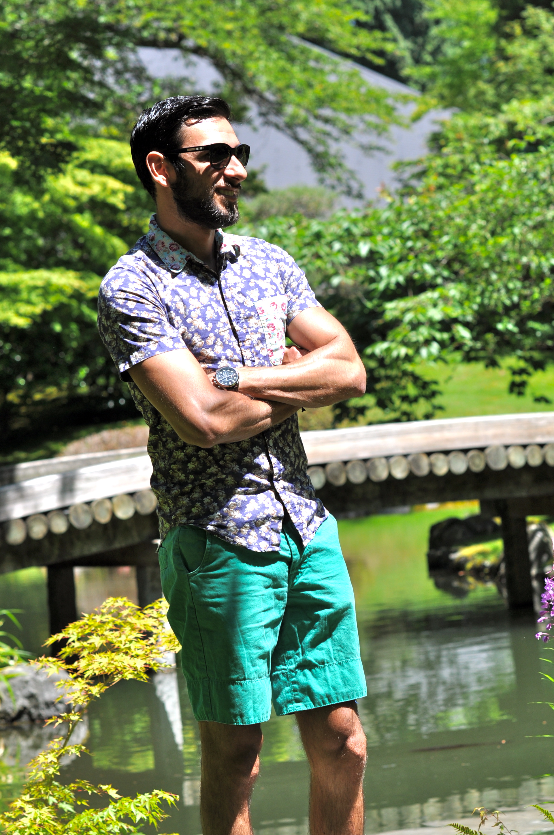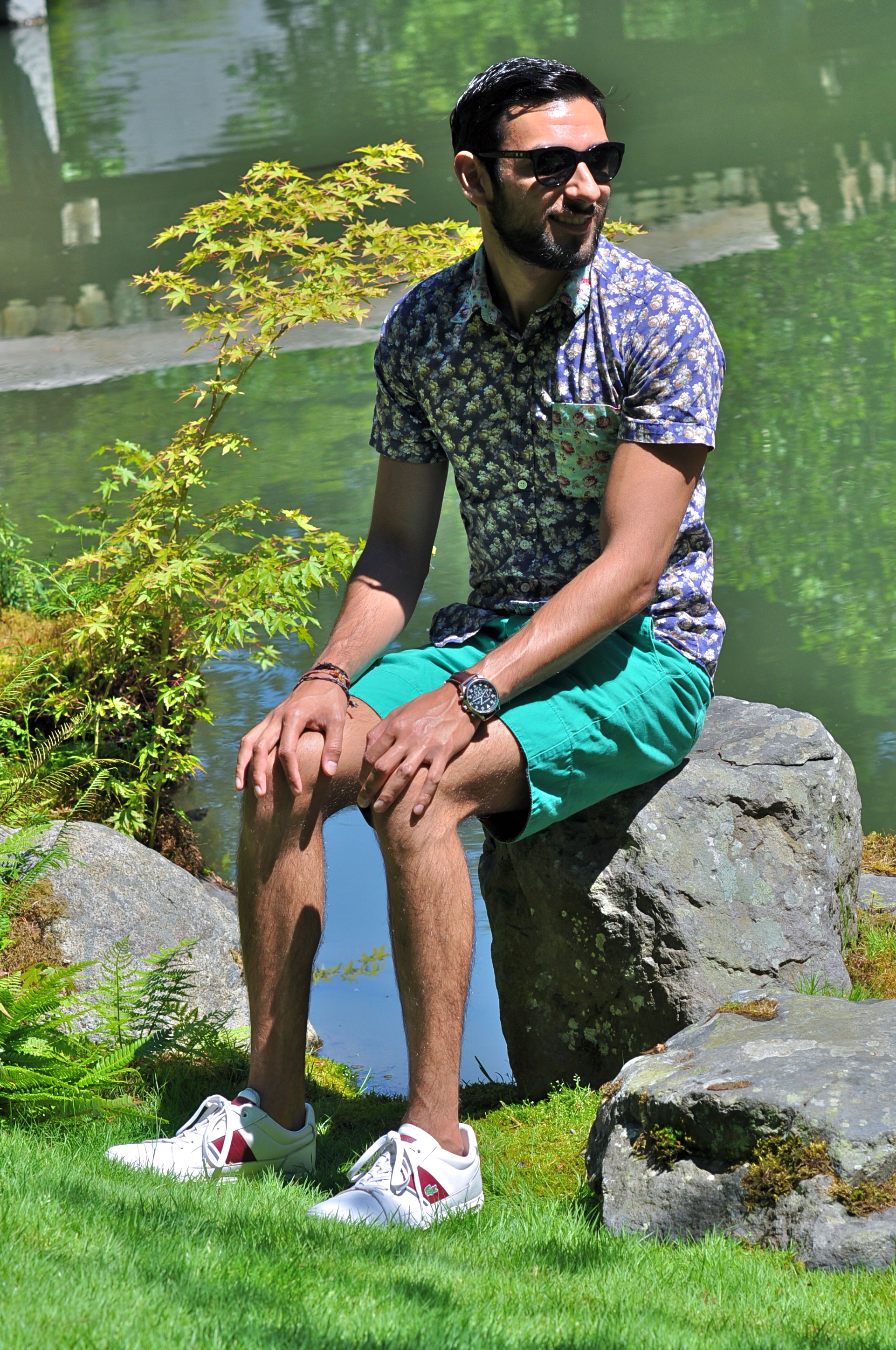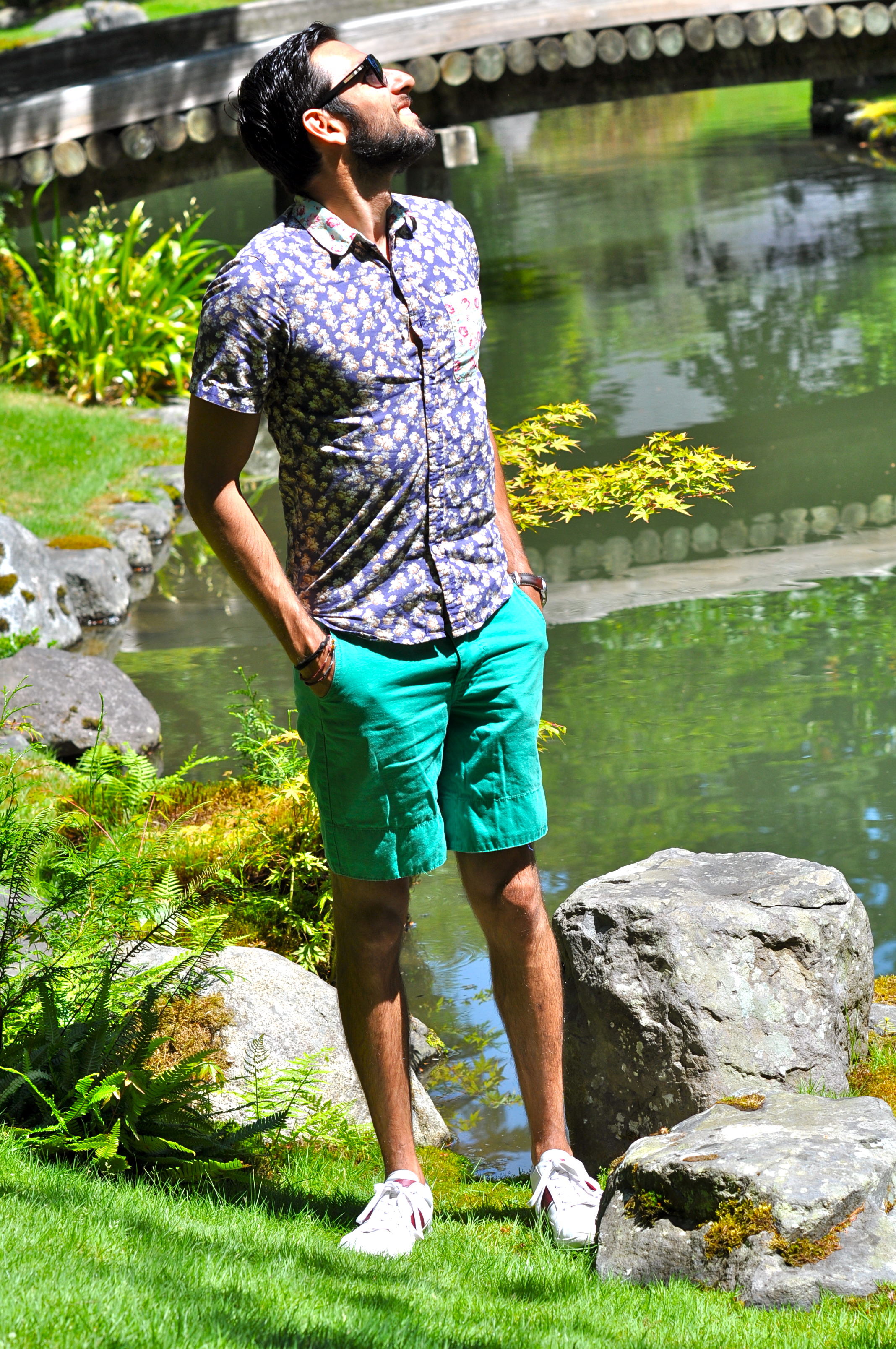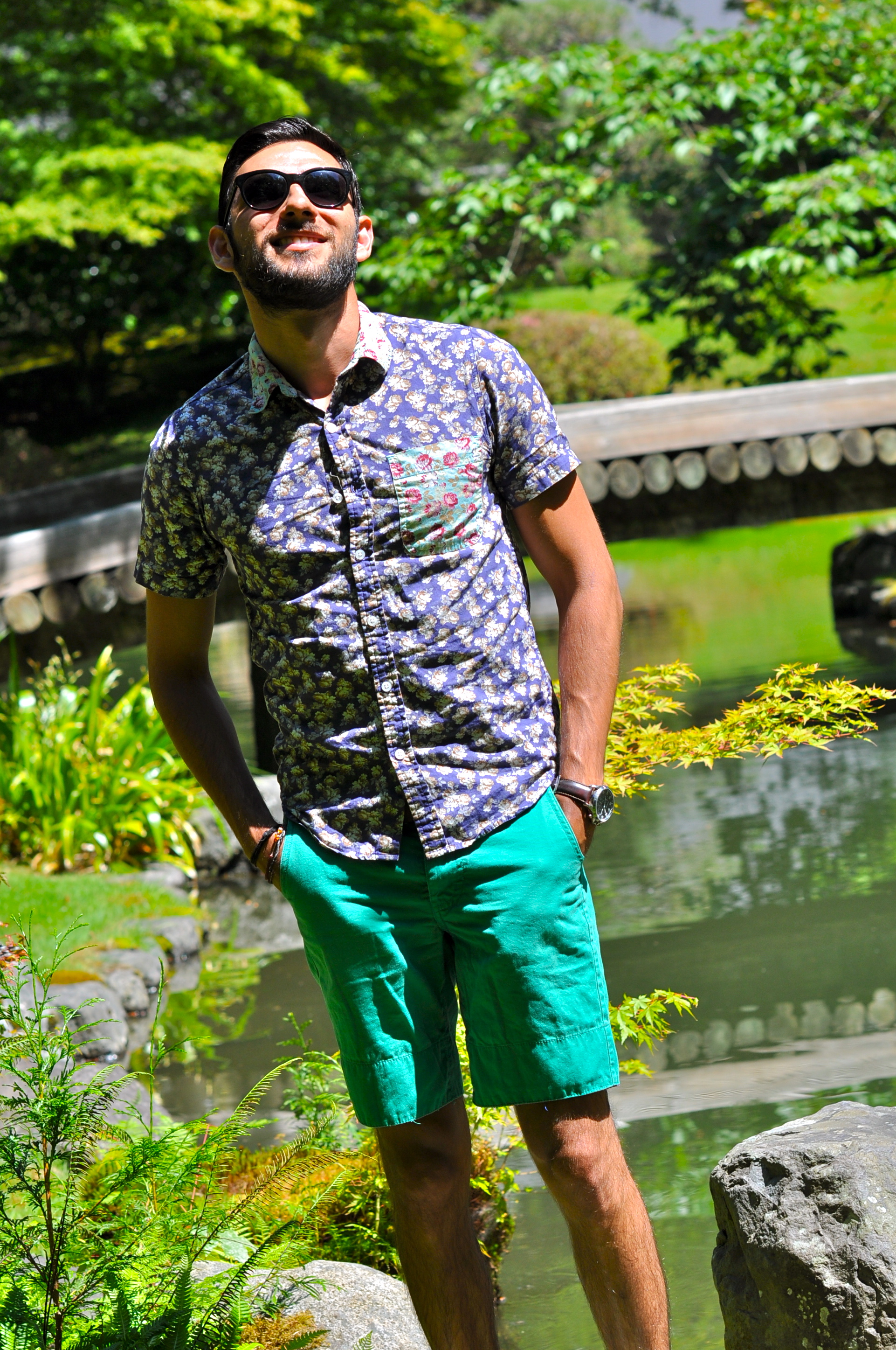For my visit to the Nitobe Garden, I decided to wear this combination of floral shirt with teal shorts. There are some pretty neat details about this shirt, but what I like the most is the pop of color in the front pocket. It’s been really hot in the West coast lately, even in Seattle and Vancouver (we tied the record of most 90-degree consecutive days just this past week with 5 days over 90). That’s why shorts and short sleeves have become a staple in my wardrobe during this season (usually it would be around 70 degrees this time of the year so I would be wearing more jeans and denim). I complimented the look with my white pair of tennis shoes and my favorite sunglasses. I think the pictures came out really well, even though you can see how hard the sun was hitting this particular day. What’s your take? Like the combination of color and prints here? How did you spend the 4th of July? I want to especially thank my roommate Carlos for taking these pics for me this time.