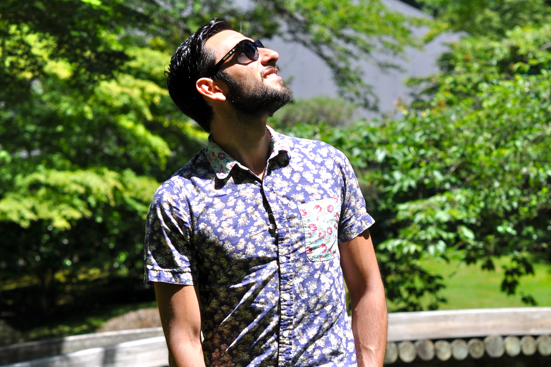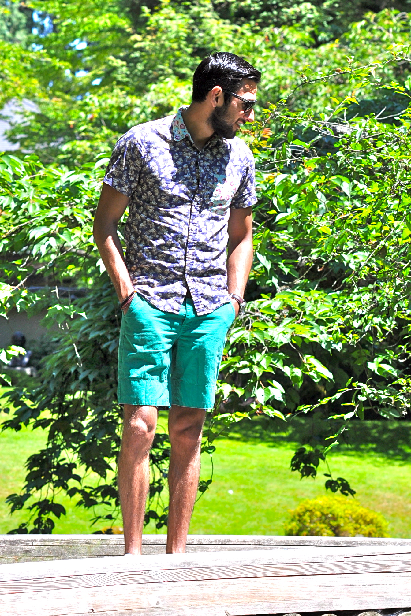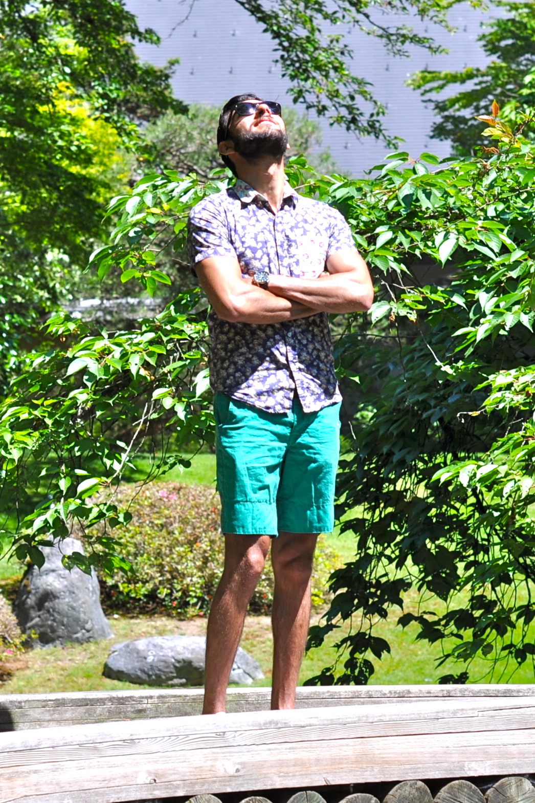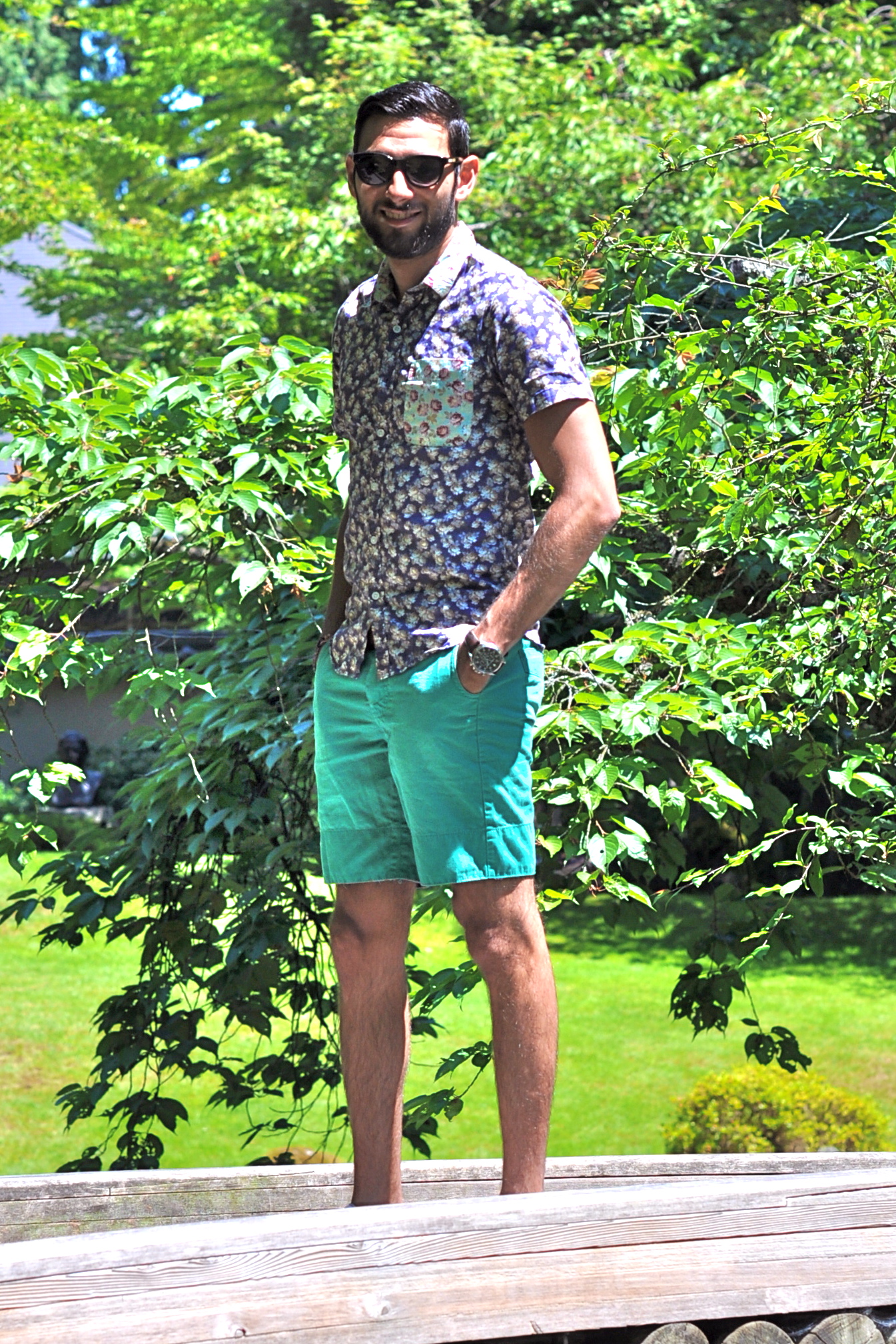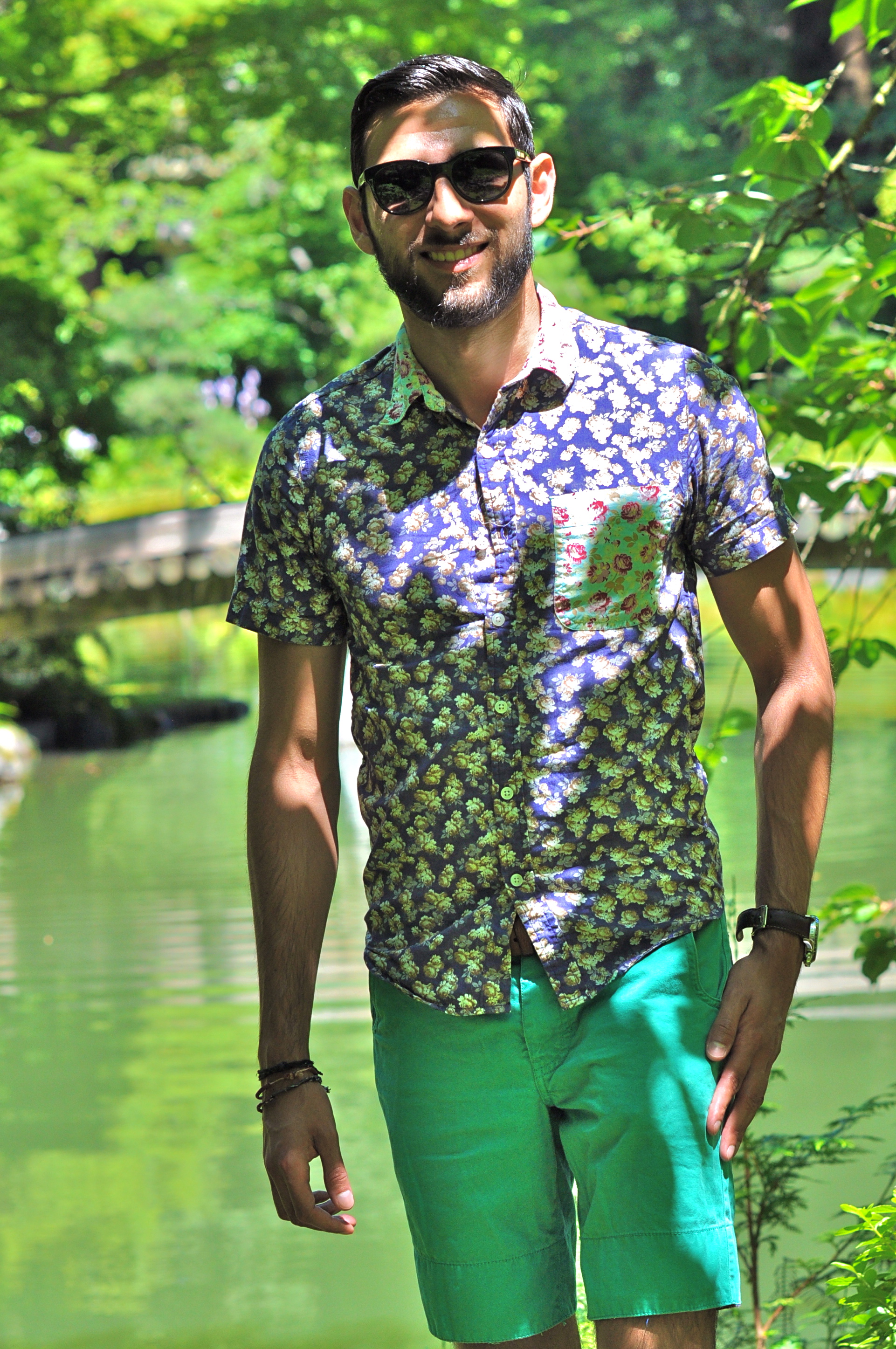 For my visit to the Nitobe Garden, I decided to wear this combination of floral shirt with teal shorts. There are some pretty neat details about this shirt, but what I like the most is the pop of color in the front pocket. It’s been really hot in the West coast lately, even in Seattle and Vancouver (we tied the record of most 90-degree consecutive days just this past week with 5 days over 90). That’s why shorts and short sleeves have become a staple in my wardrobe during this season (usually it would be around 70 degrees this time of the year so I would be wearing more jeans and denim). I complimented the look with my white pair of tennis shoes and my favorite sunglasses. I think the pictures came out really well, even though you can see how hard the sun was hitting this particular day. What’s your take? Like the combination of color and prints here? How did you spend the 4th of July? I want to especially thank my roommate Carlos for taking these pics for me this time.