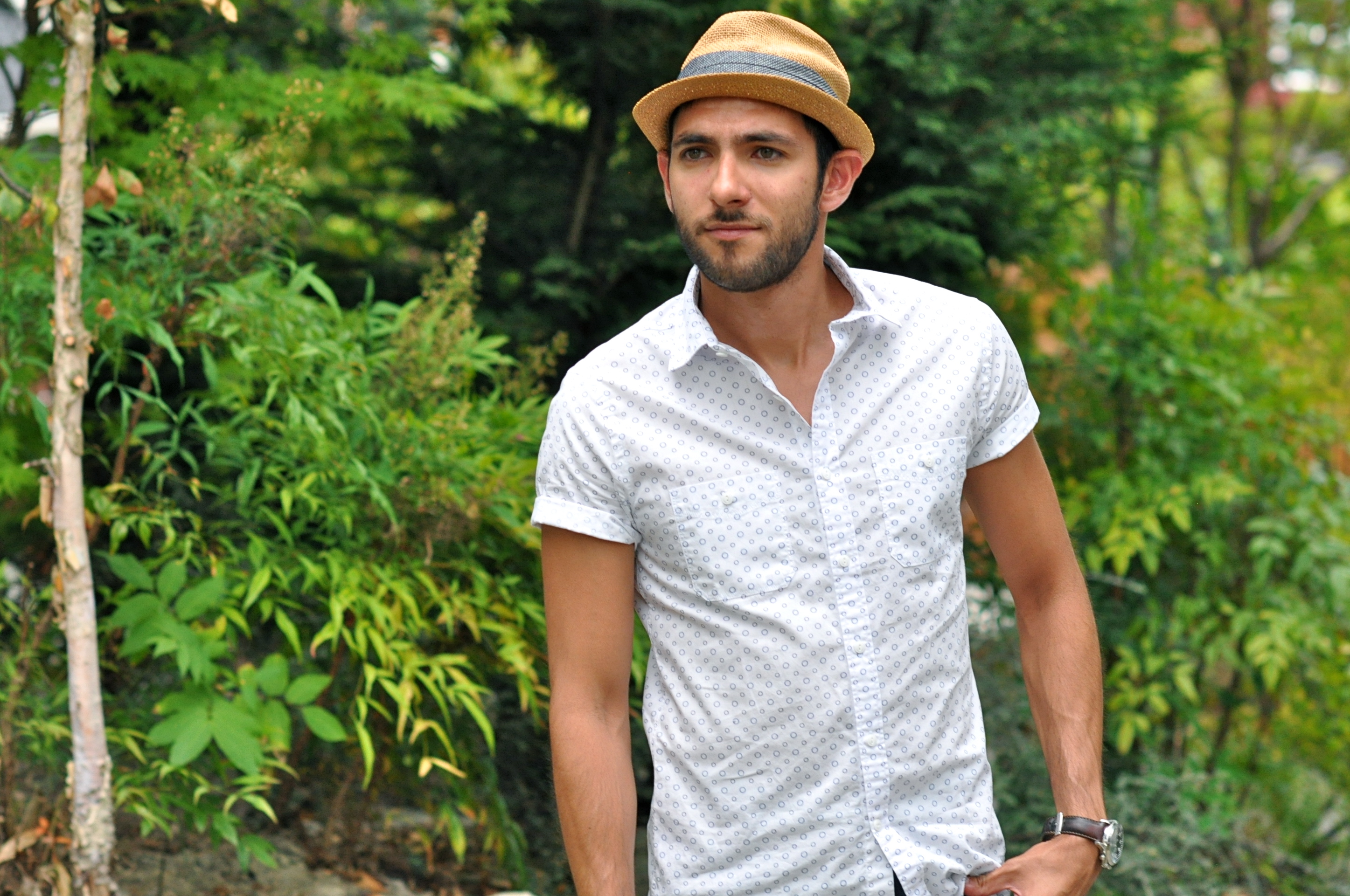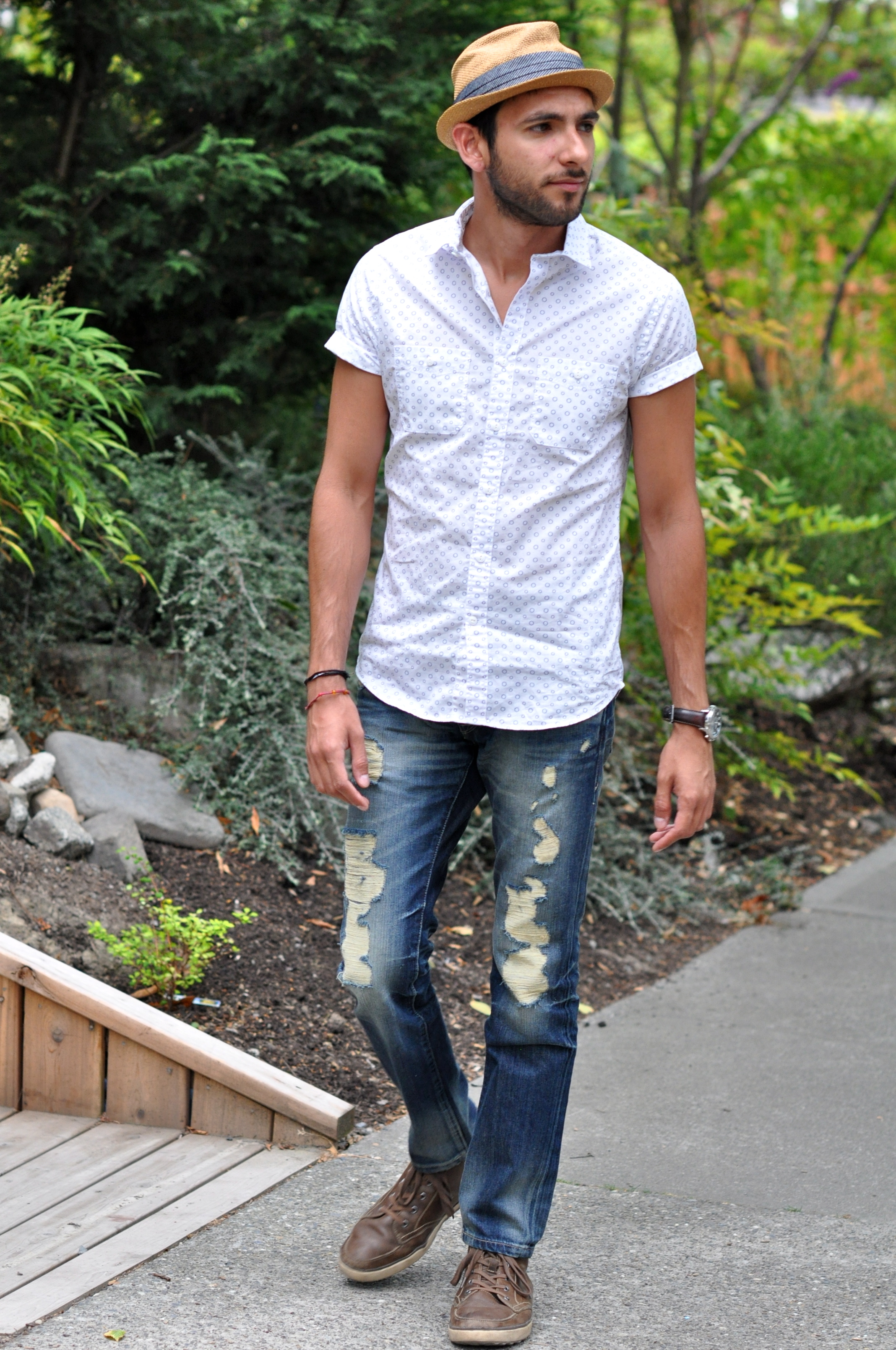 Washed, distressed jeans by EXPRESS, Two-pocket short-sleeve shirt by EXPRESS, Straw hat by J Crew (Similar also by J Crew), All-weather boots by Aldo (Similar also by Aldo)