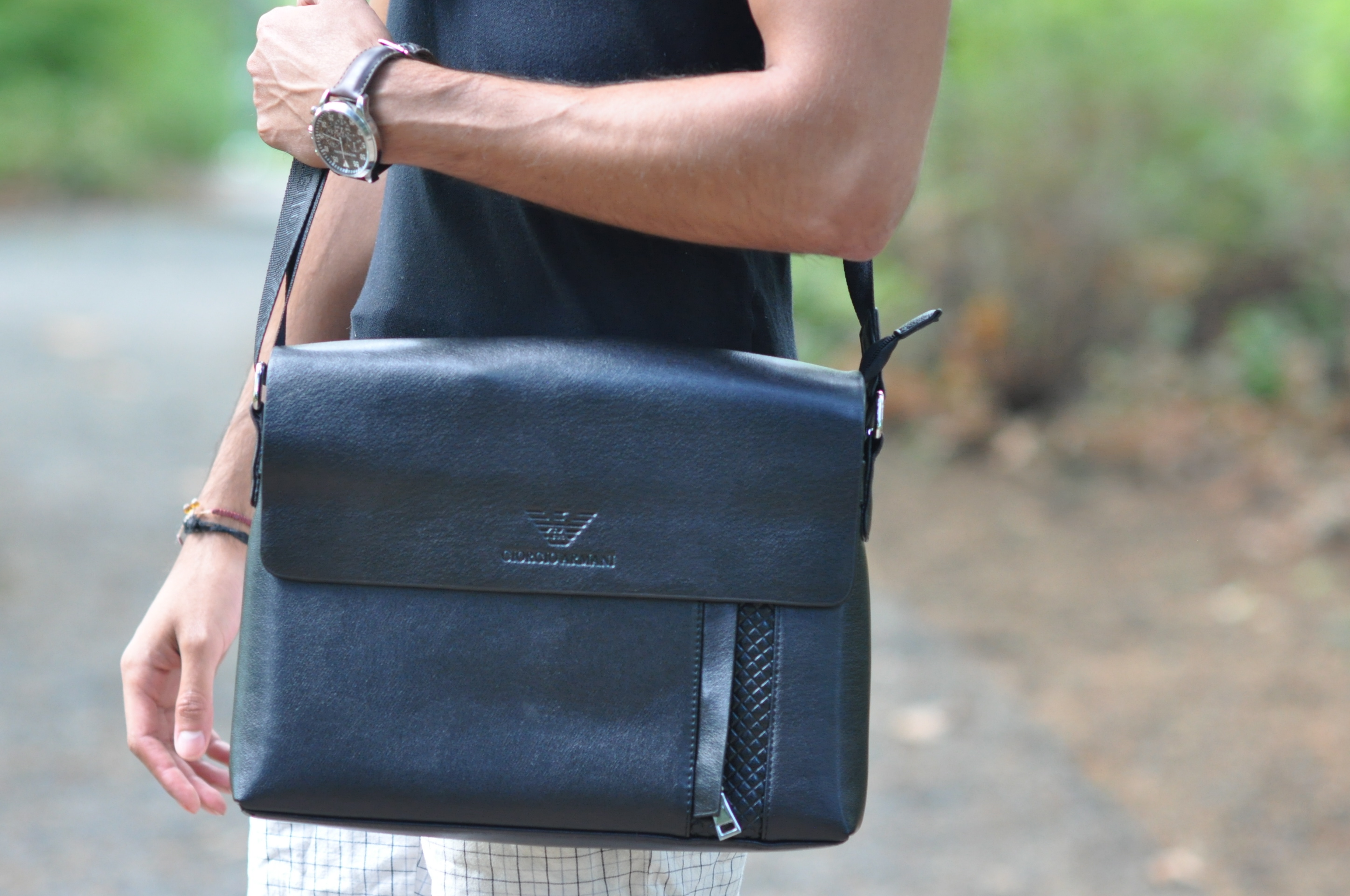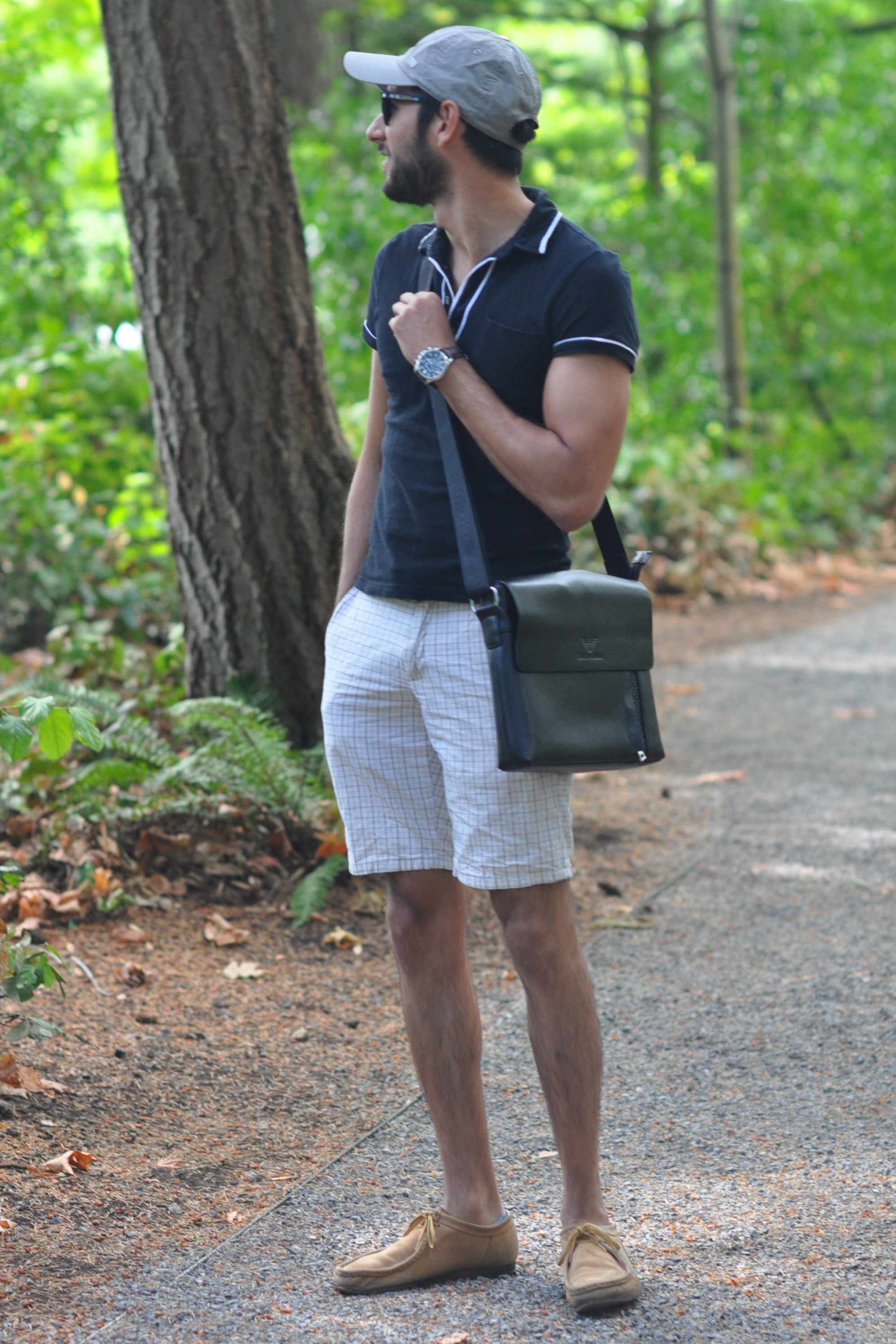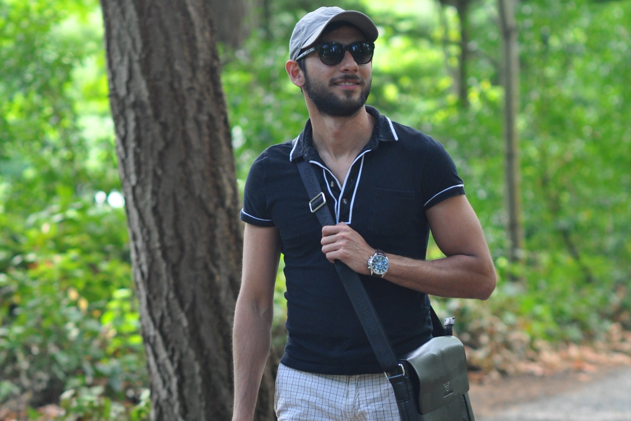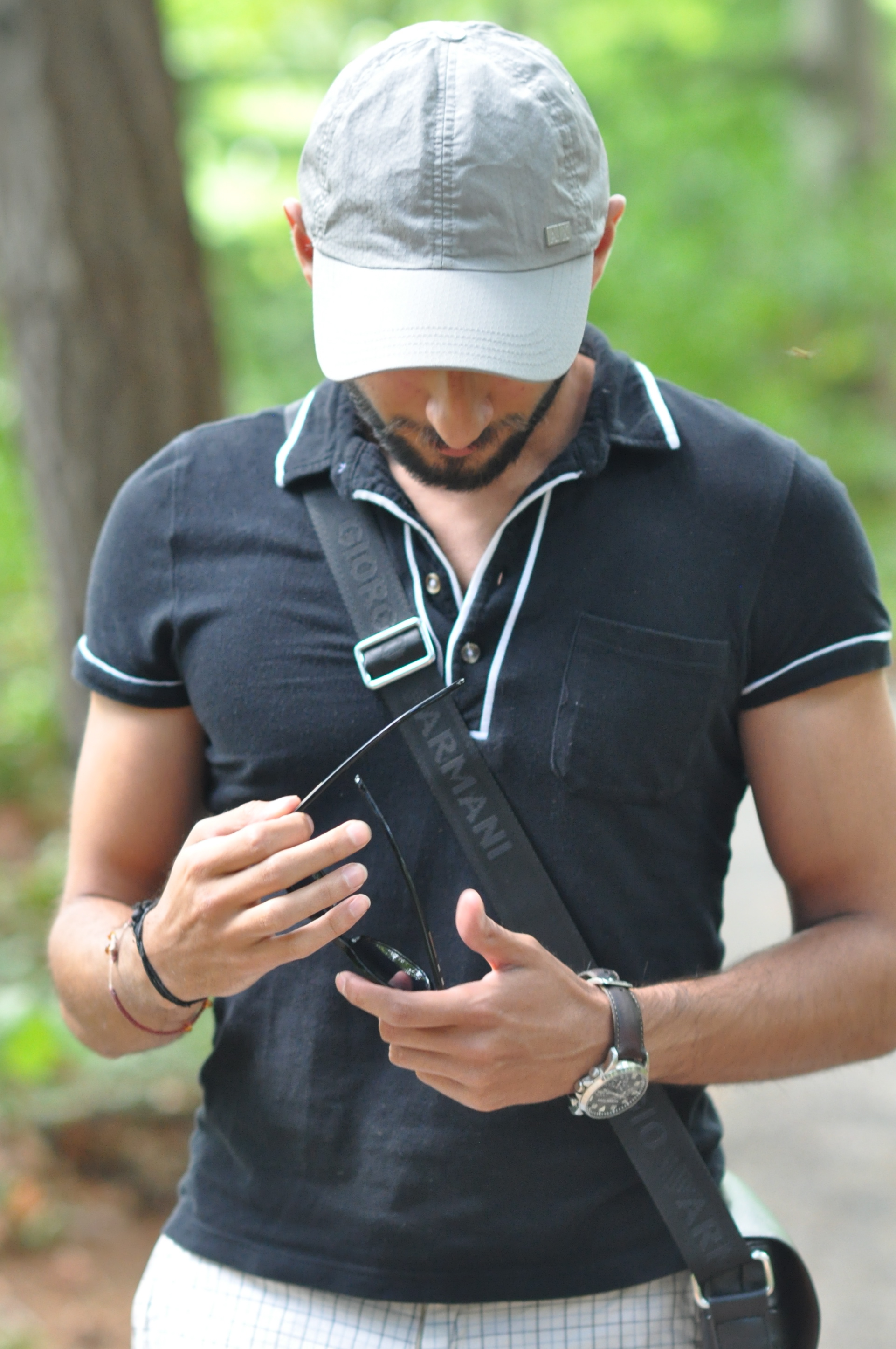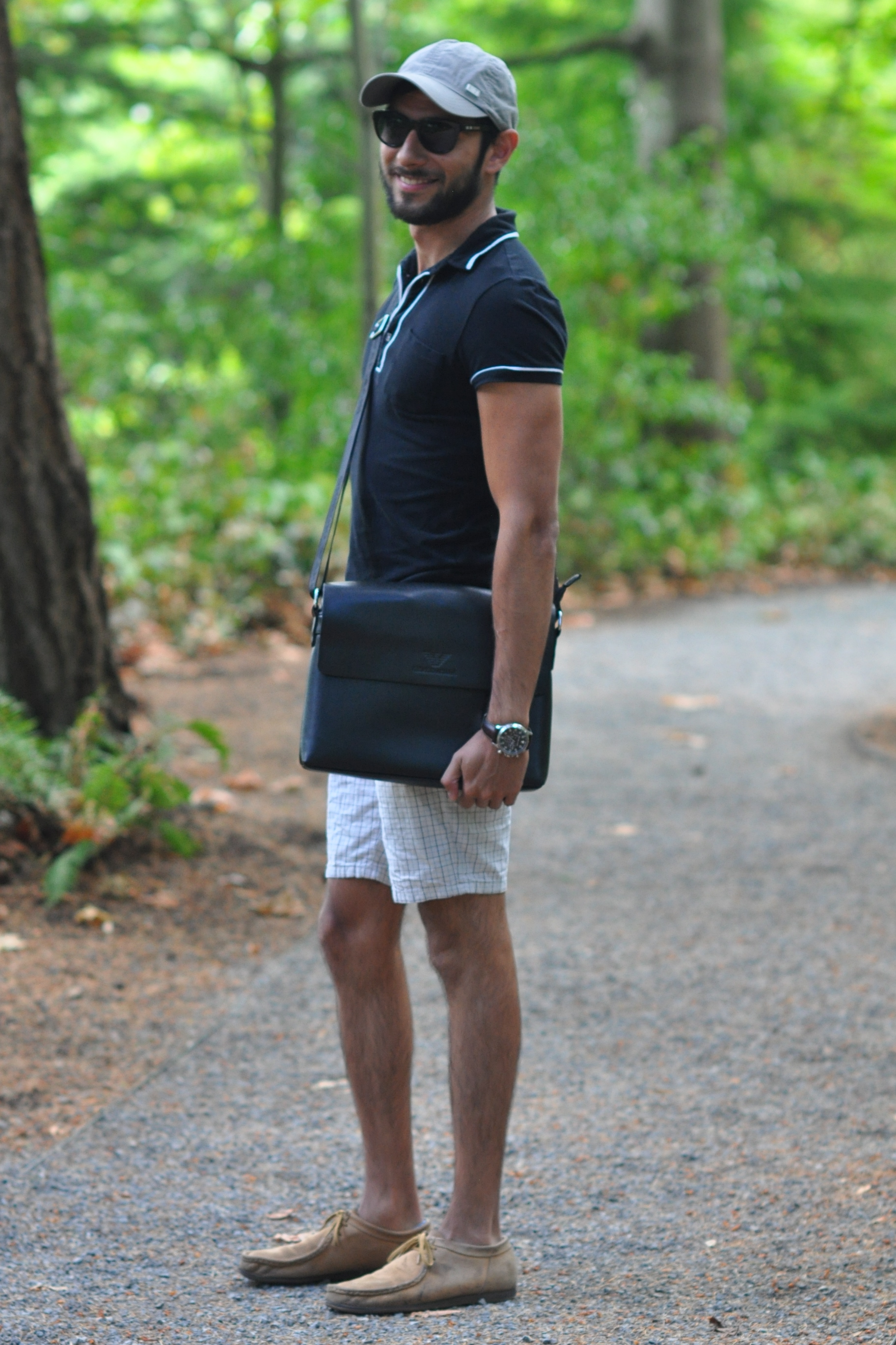 Black polo t-shirt by Topman (Similar by Penguin), Shorts by Club Monaco (Similar also by Club Monaco), Hat by Armani Exchange (Similar also by Armani Exchange), Messenger bag by Giorgio Armani (Gift from Asia), Shoes by Clarks, Shades by Burberry, Watch by Michael Kors