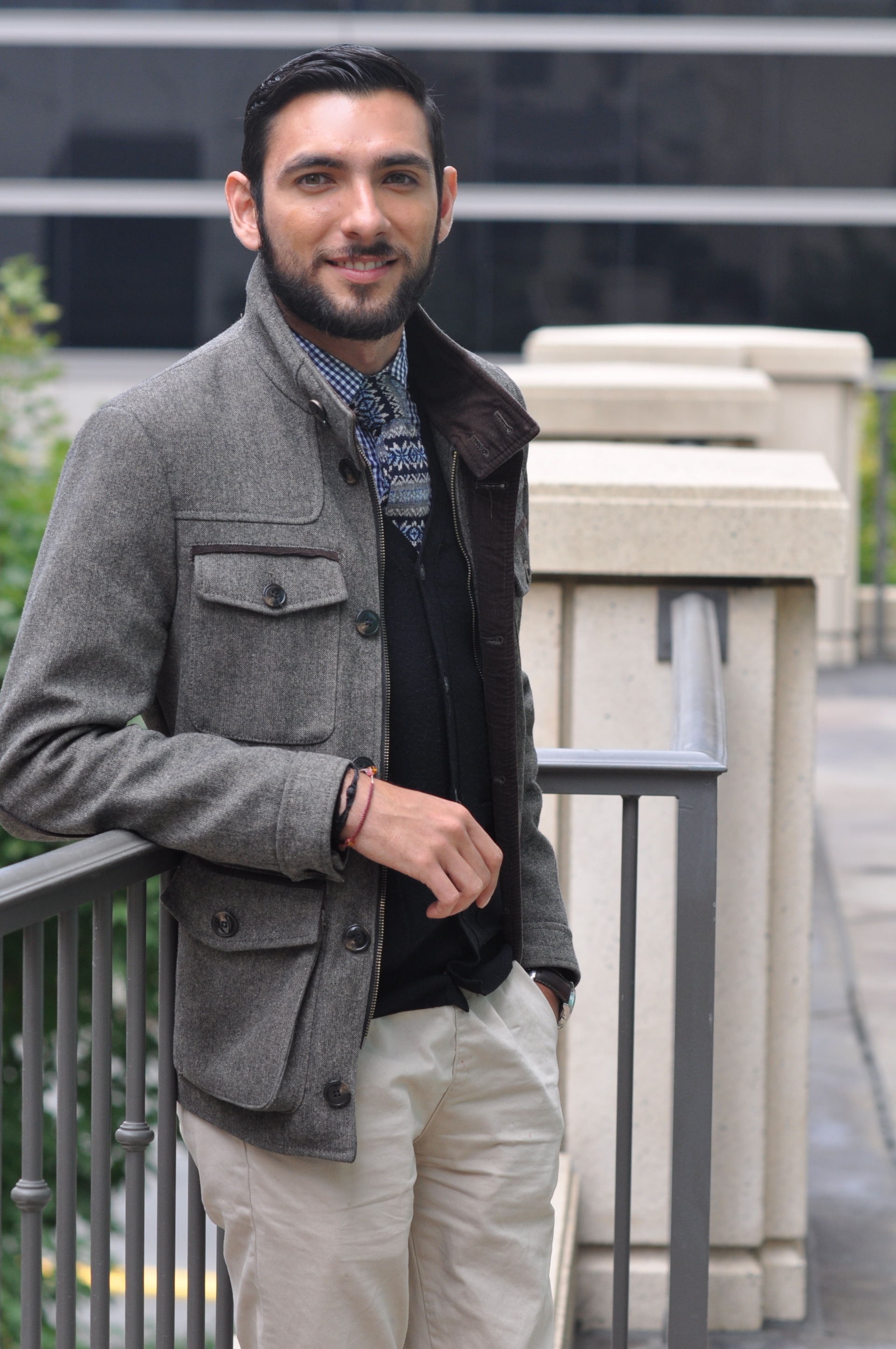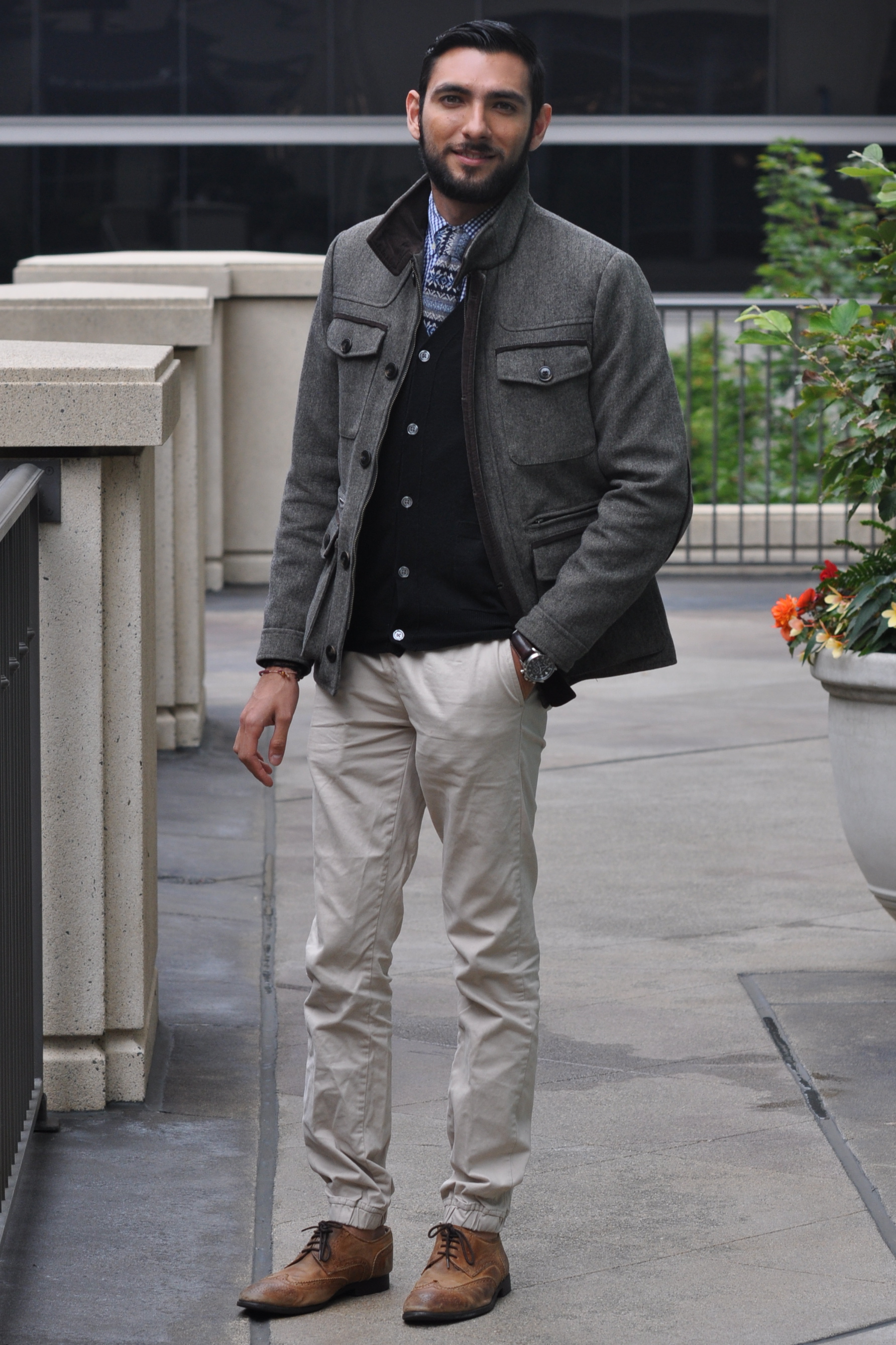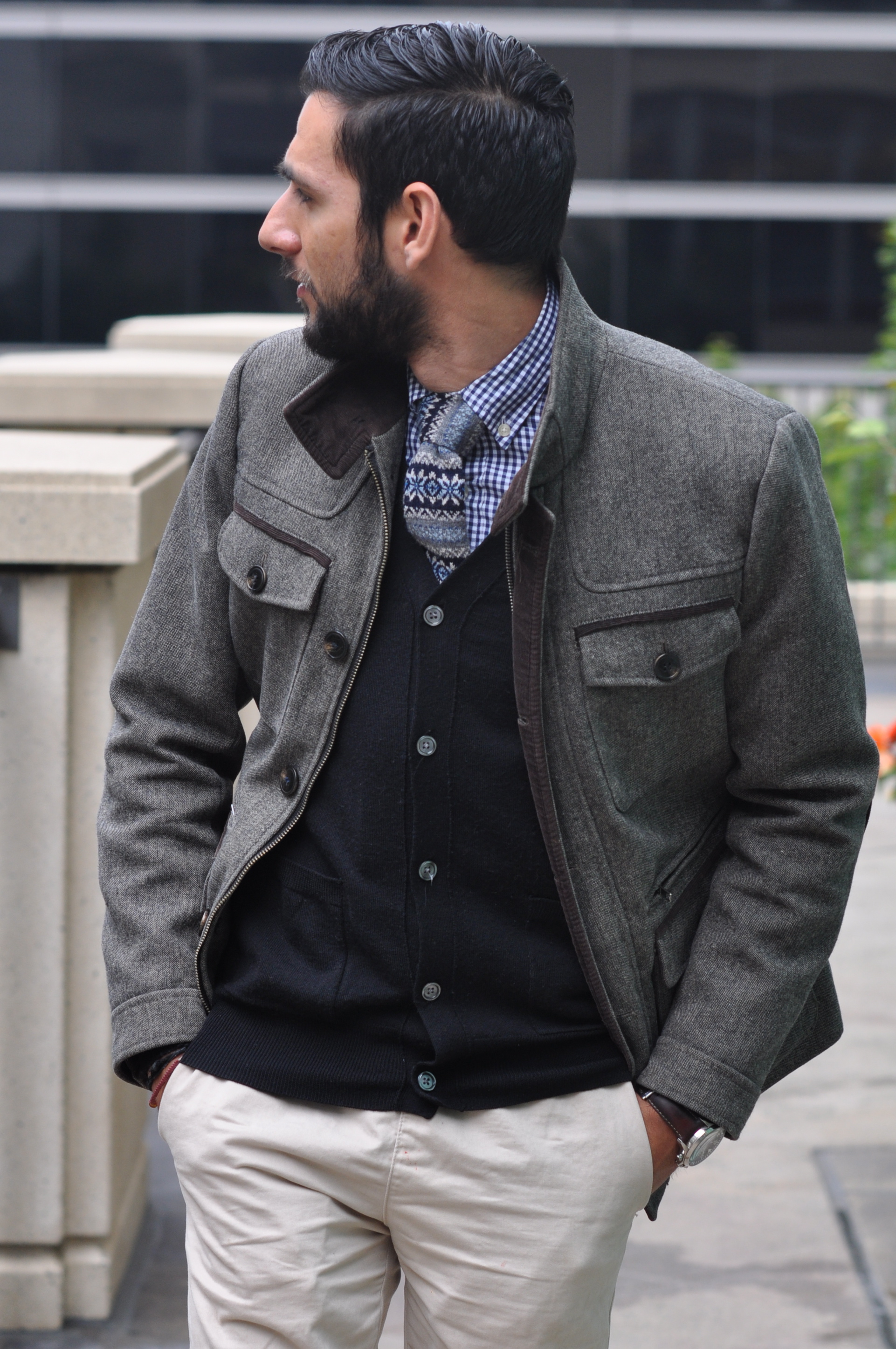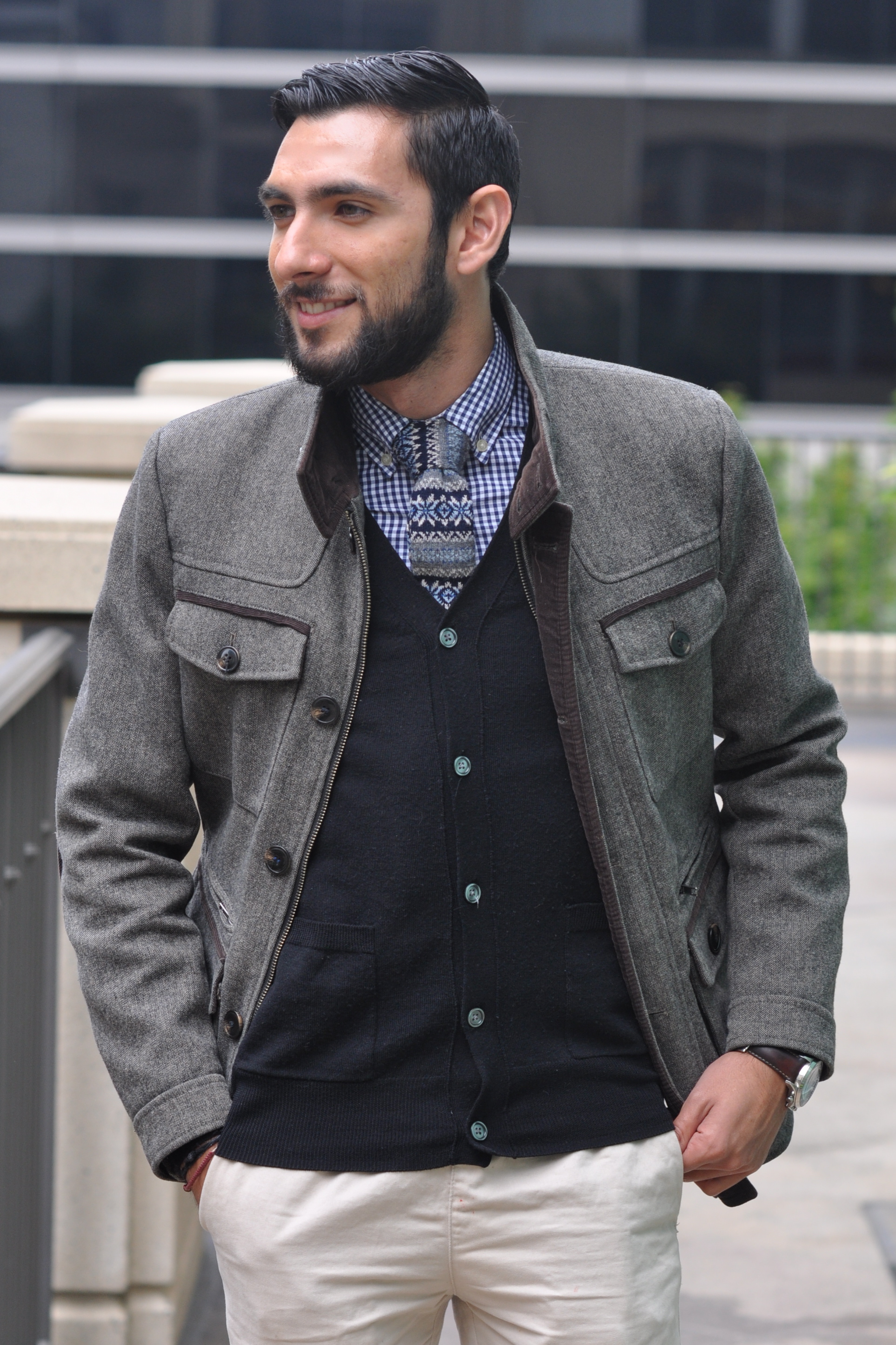 Cotton pocketed coat H&M (Similar also by H&M), Gingham button-down J. Crew, Wool knit Tie J. Crew (Similar also by J. Crew), Merino cardigan Club Monaco, Joggers Topman, Shoes Aldo