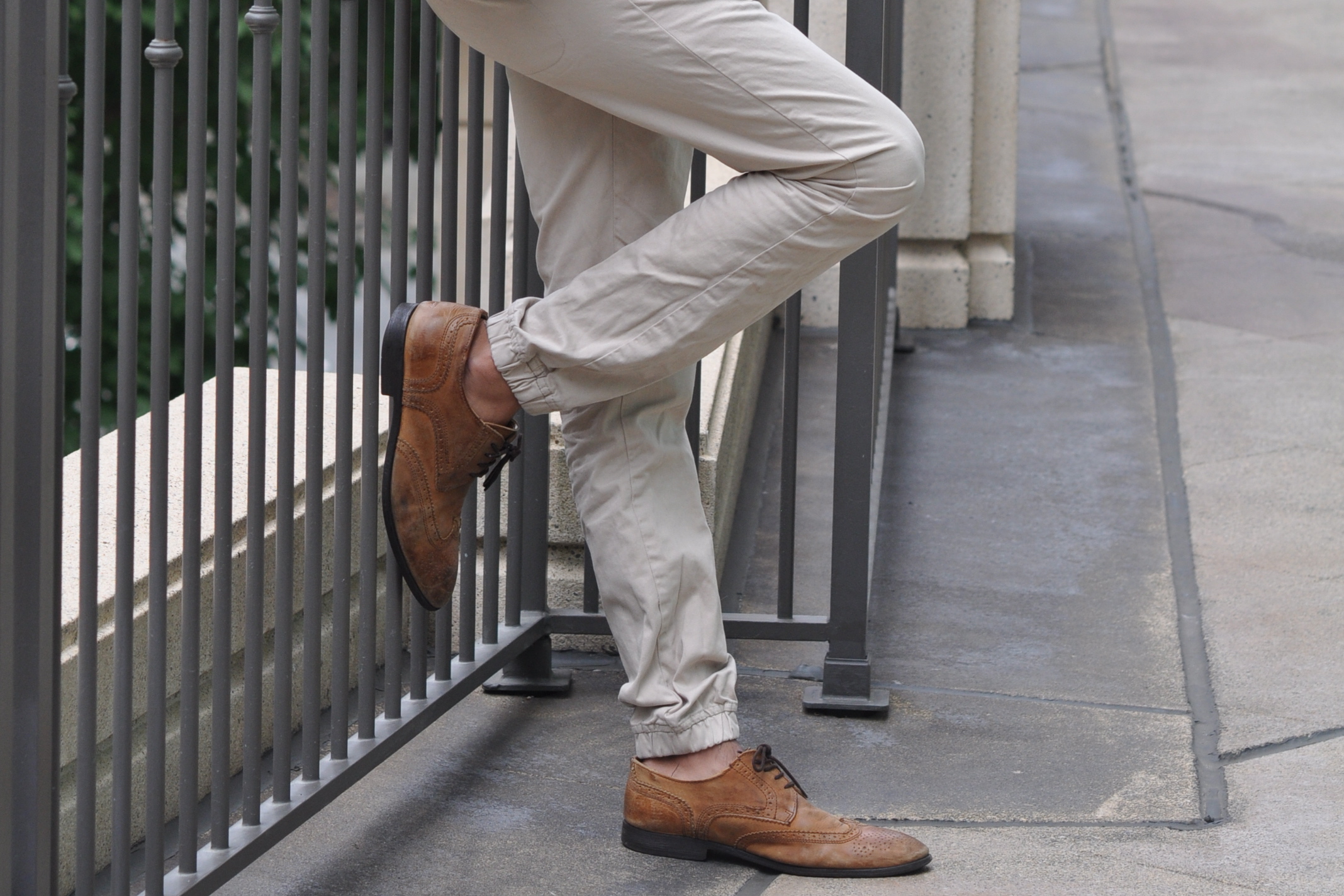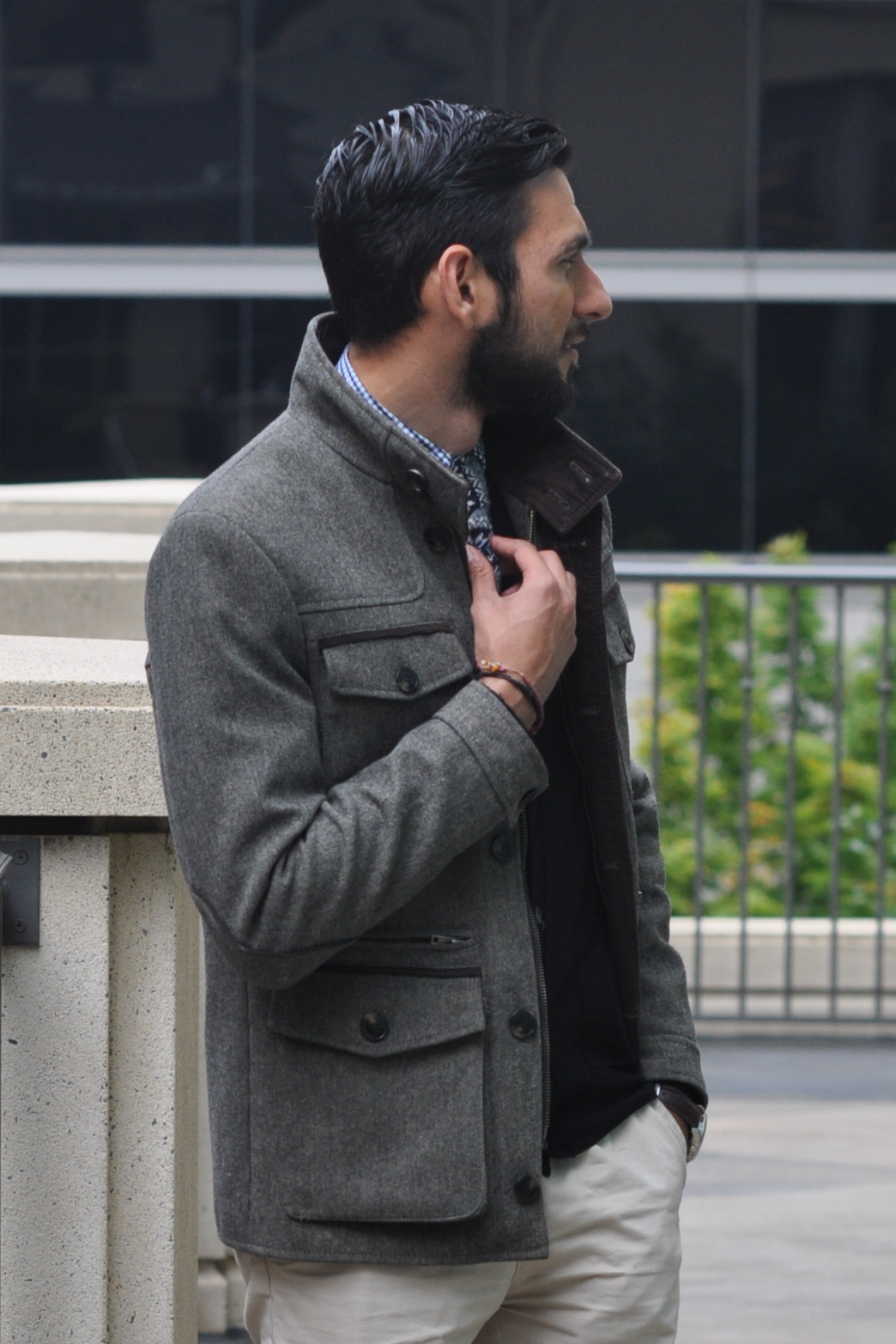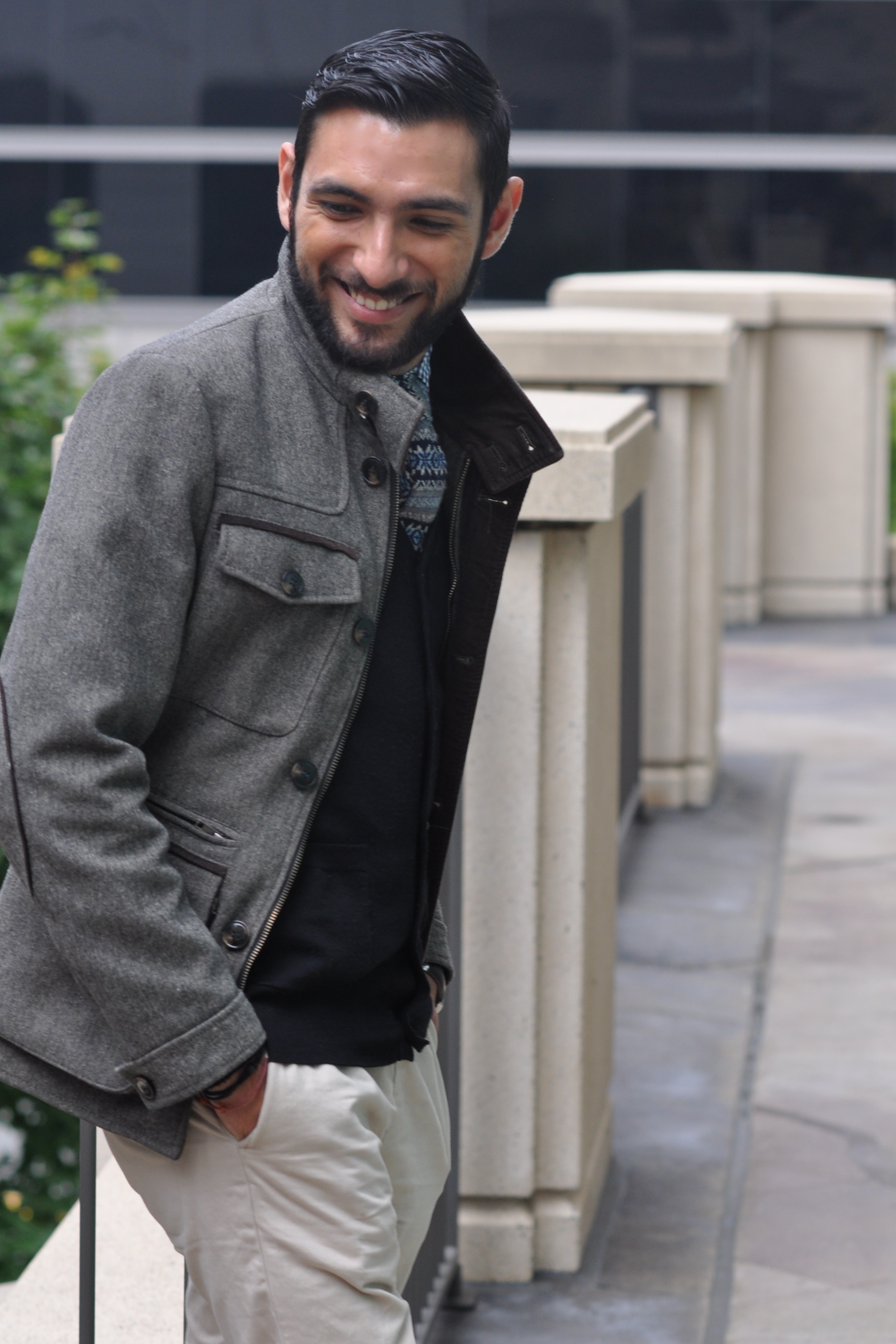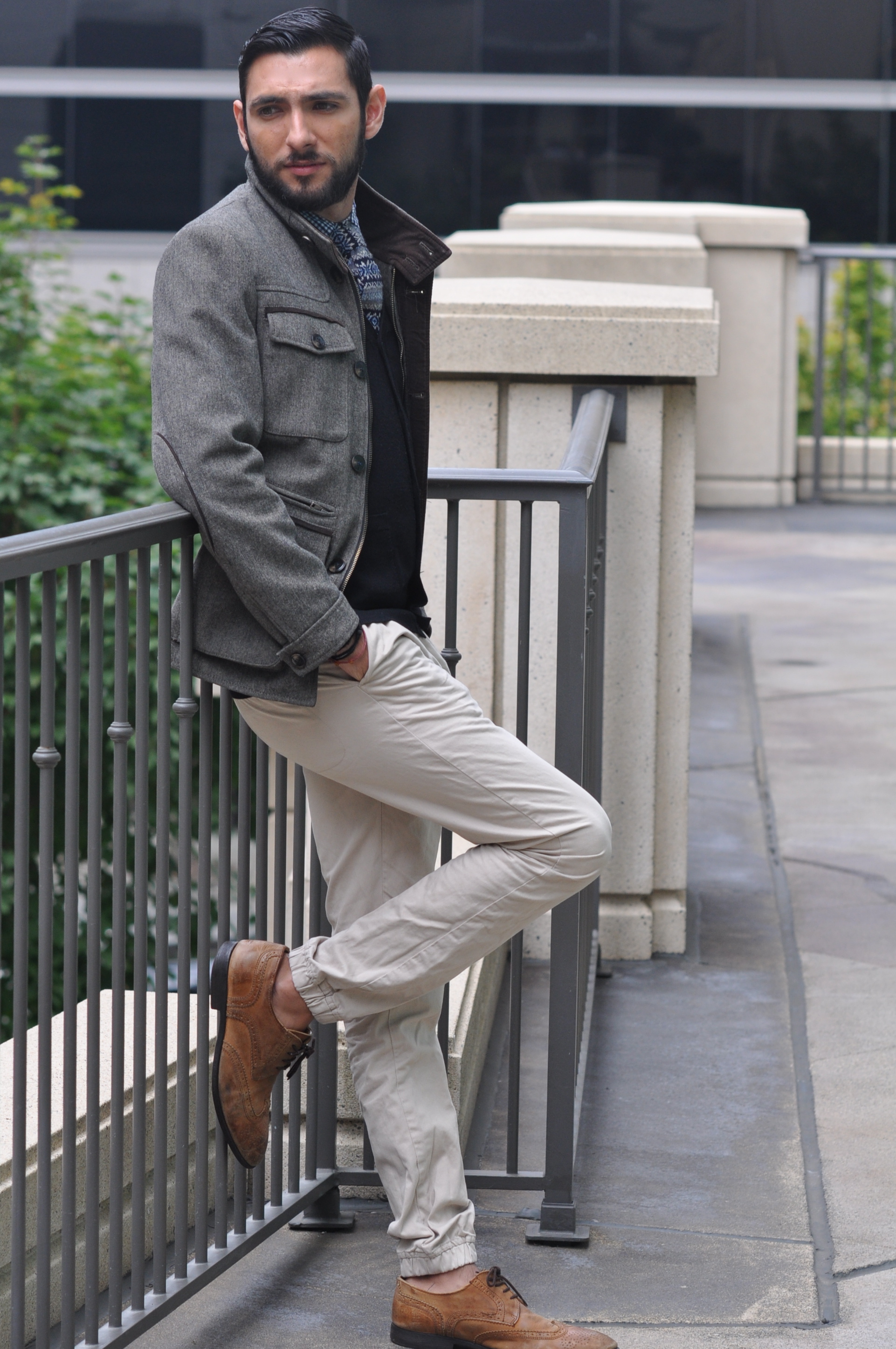 Cotton pocketed coat H&M (Similar also by H&M), Gingham button-down J. Crew, Wool knit Tie J. Crew (Similar also by J. Crew), Merino cardigan Club Monaco, Joggers Topman, Shoes Aldo