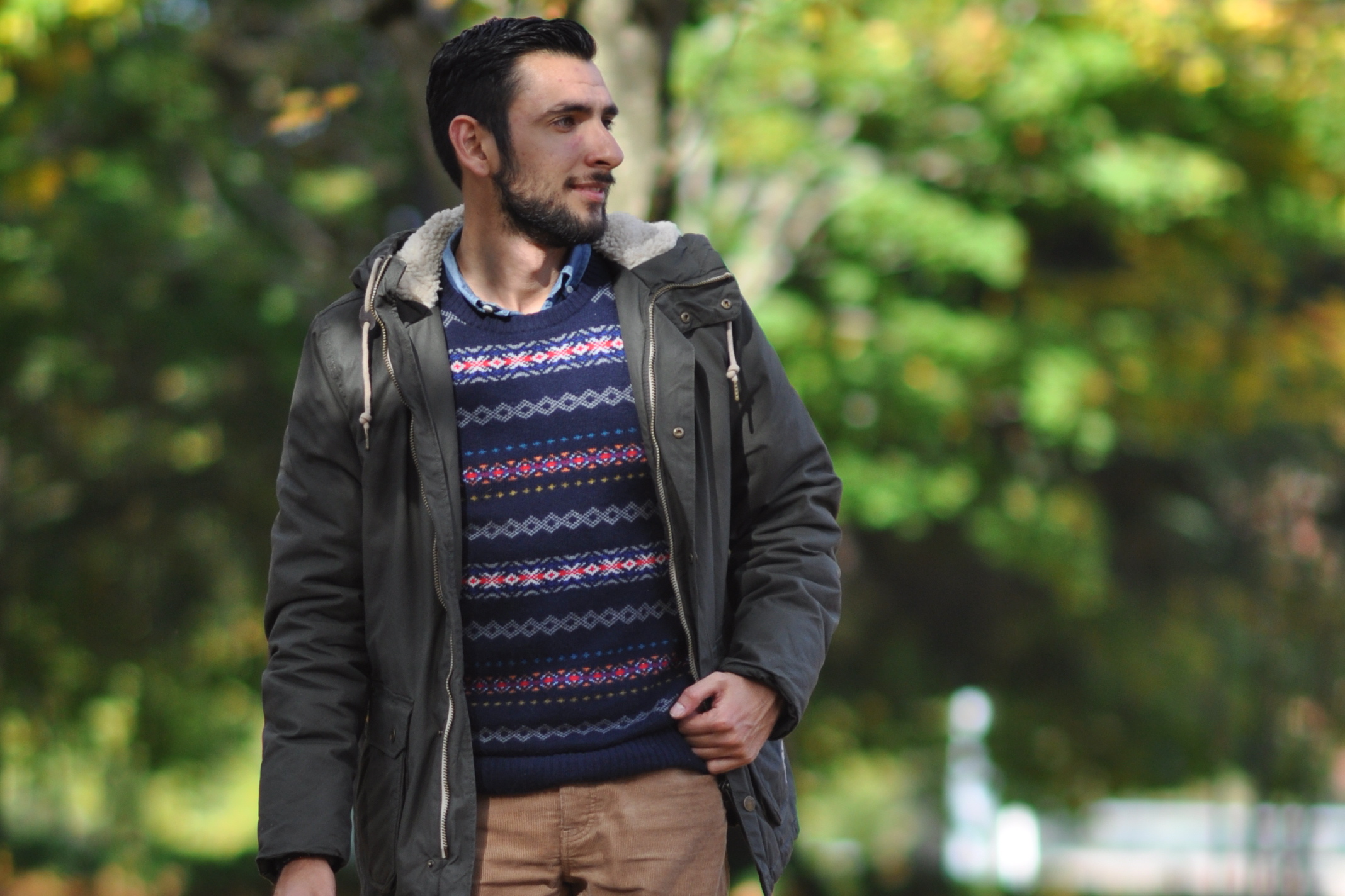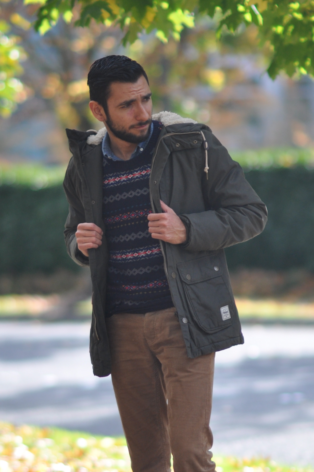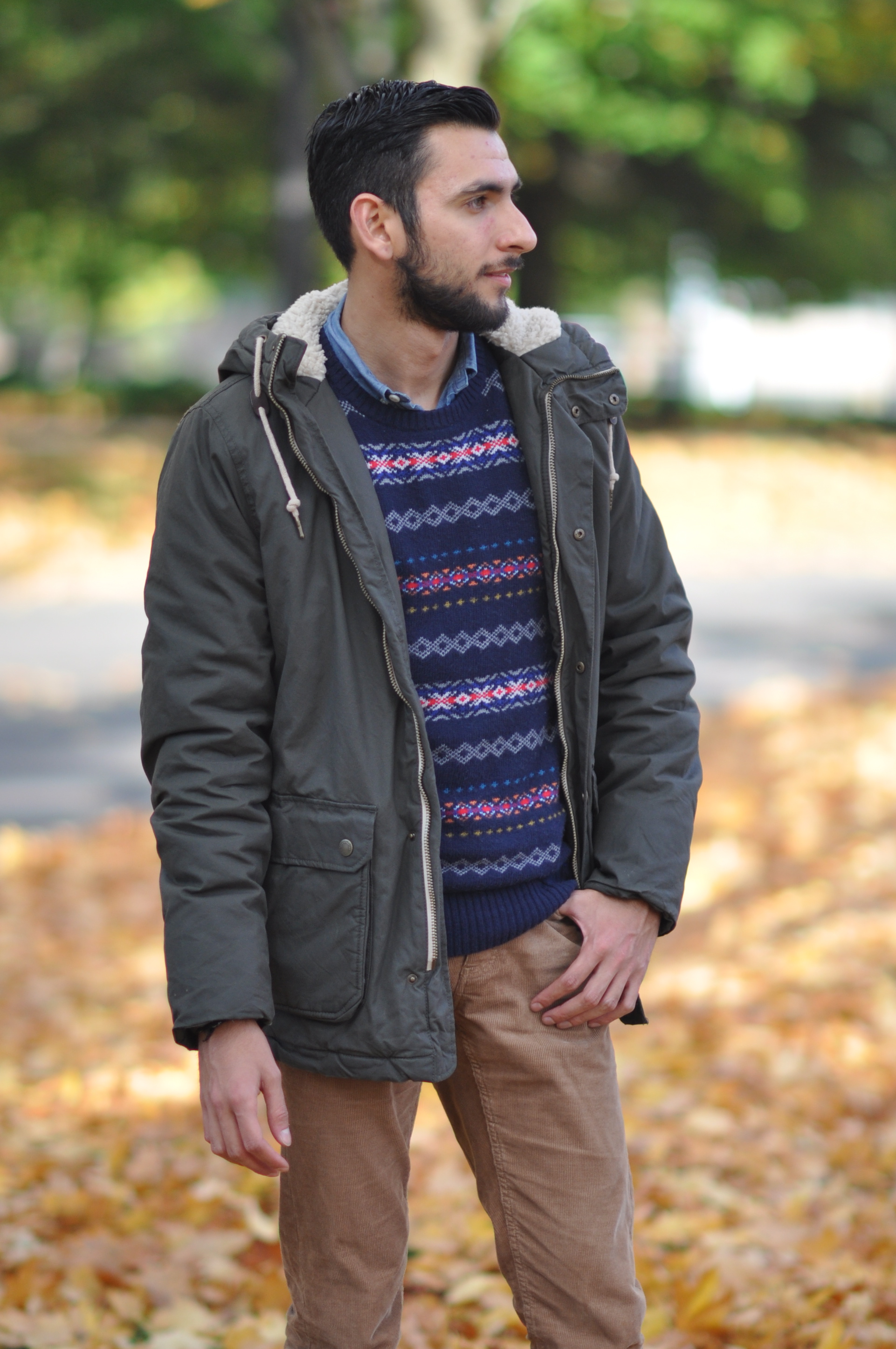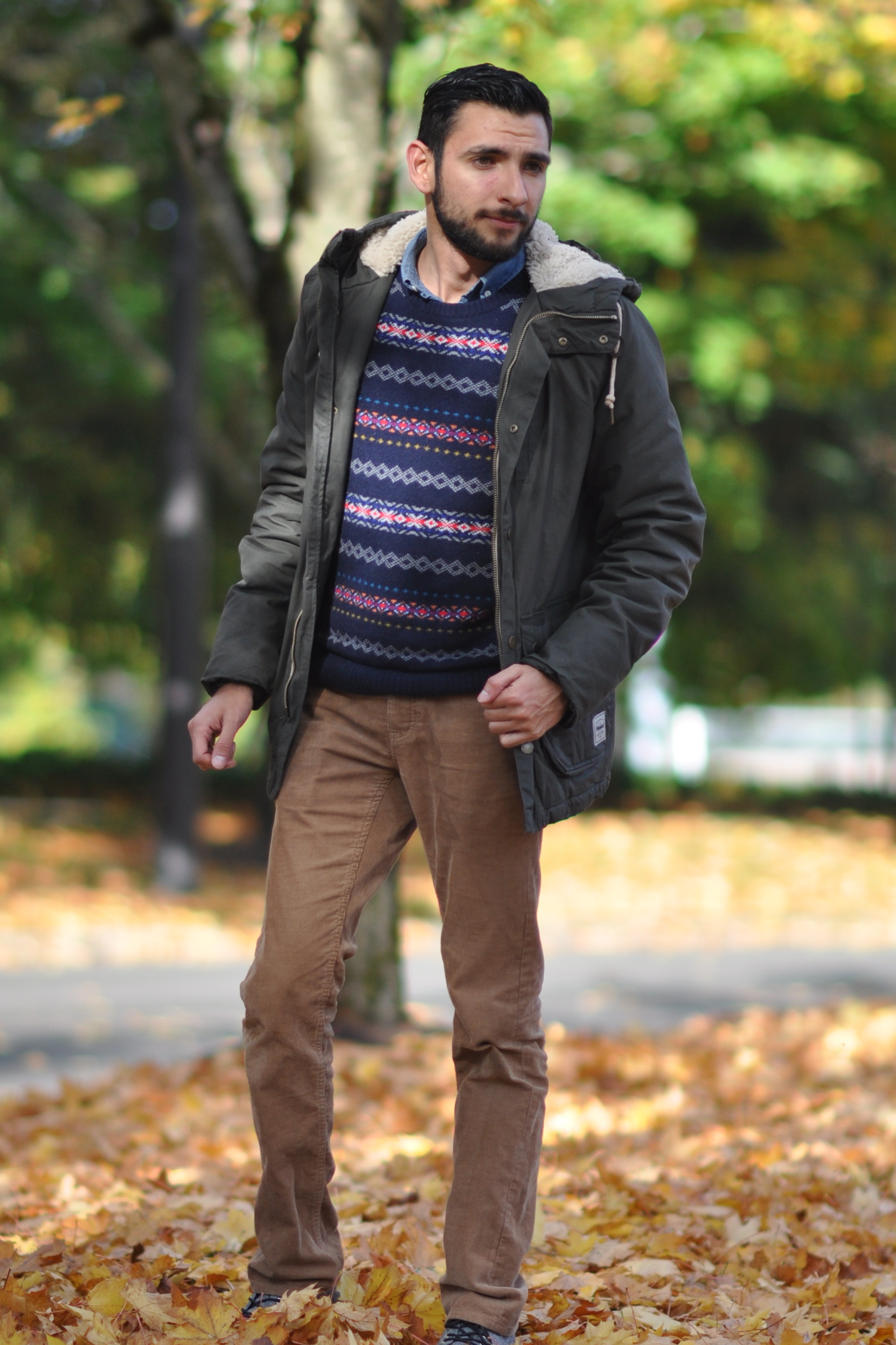 Olive green jacket H&M (Similar also by H&M), Wool sweater American Eagle (Similar by J. Crew), Corduroy pant Club Monaco, Chambray shirt Club Monaco (Similar by 21 Men), Sneakers Creative Recreation