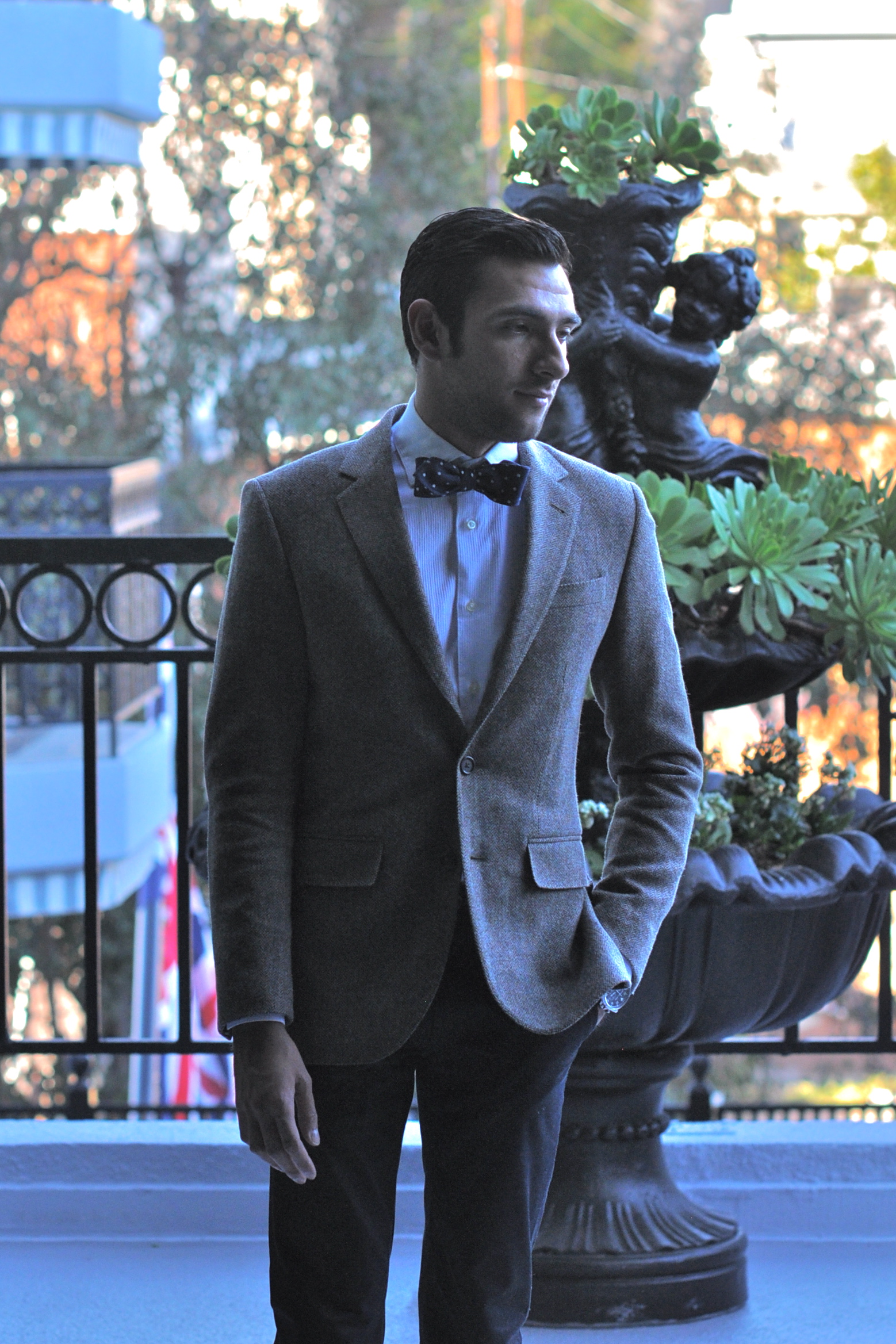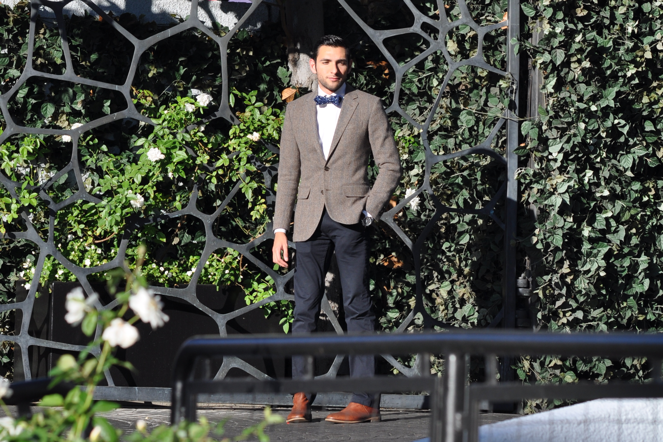 Finalmente, decidí irme por una combinación muy clásica, atemporal, de saco sport con pantalón de vestir, porque si iba a estar afuera no quería sentir frío en ningún momento. Estando adentro, podría simplemente quitarme el saco, pero aún así tenía que verse bien. El saco que elegí es este blazer de algodón de Club Monaco, el cual tiene un color muy agradable y cálido. Me encanta la textura, y el tono va muy bien con cualquier tipo de camisa. Los pantalones, los cuales decidí llevar en color azul para combinar con mis accesorios, son de Zara y aunque son súper cómodos tienen un detalle: están hechos de un material similar a la gamuza, entonces atraen mucho el polvo. Sólo tenía que estar muy consciente de que en donde me sentara no hubiera polvo. Para los accesorios, utilicé este moño con patrón polka-dot azul que compré en Nueva York marca Penguin, y también portaría tirantes con este mismo estampado. Aunque casi no se notan, los tirantes ayudarían a completar el look sin saco. Por último, opté por ponerme zapatos cafés, ya que iban a complementar muy bien el color del saco, ¡y ta-tán! El look estaba terminado. ¿Qué opinan al respecto? ¿Les gusta la idea de mezclar diferentes texturas para agregar una dimensión más al atuendo? La boda terminó siendo un éxito, la boda perfecta, y me la pasé muy bien en toda la noche.