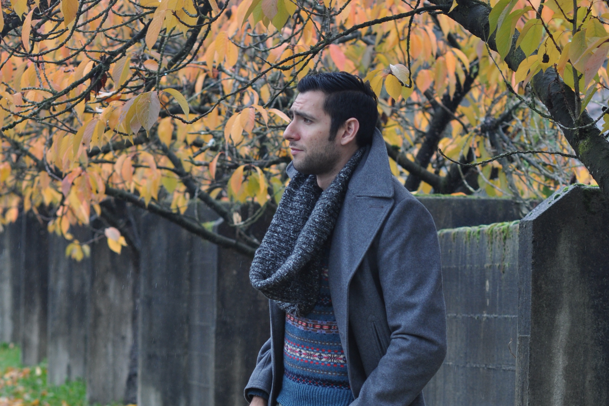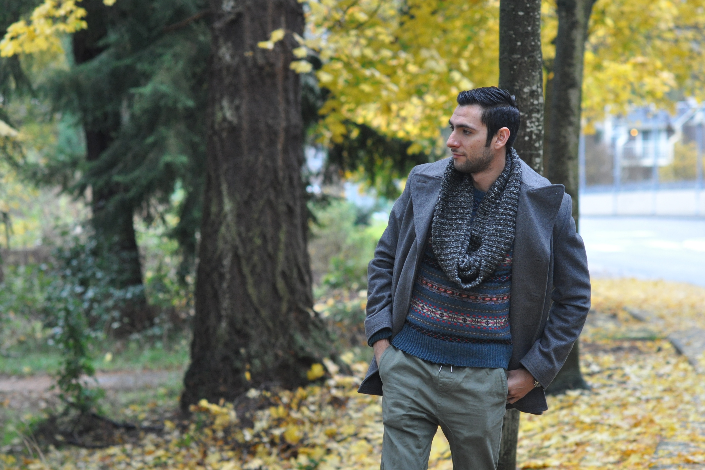El elemento que quisiera enfatizar en estas fotos es el regreso de mi abrigo topcoat. El año pasado, usé a este bebé cuando viajé a Detroit y a Nueva York, porque tuvimos un invierno bastante cálido aquí en Seattle. Este año, sin embargo, noviembre empezó con el frío de golpe y ya llevamos más de 10 días estando a cero grados o menos, lo cual no es tan común en esta ciudad. Este abrigo me ha ayudado a mantenerme caliente en estas bajas temperaturas, y realmente me gusta como se ve. Le va a casi cualquier cosa. Aquí, por ejemplo, lo decidí vestir junto con un suéter de J. Crew y con una bufanda circular, la cual tampoco utilizaba desde mi viaje a NYC. Para la parte de abajo, lo combiné con mis joggers color verde olivo, y por último completé el look con mis botas para todo clima, las cuales sobrevivieron al invierno pasado y al parecer este año también lo van a poder superar. ¿Qué sienten al respecto? Me sentí tan bien en este abrigo que decidí levantar el cuello un poco para verme más juvenil. ¡Muchas gracias amiga por las increíbles fotos de otoño maravilloso!