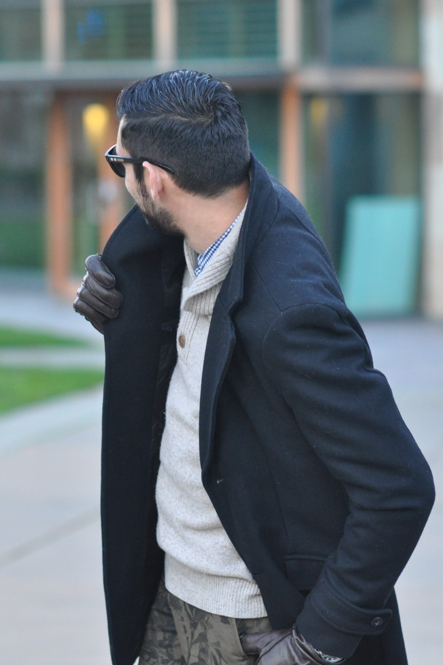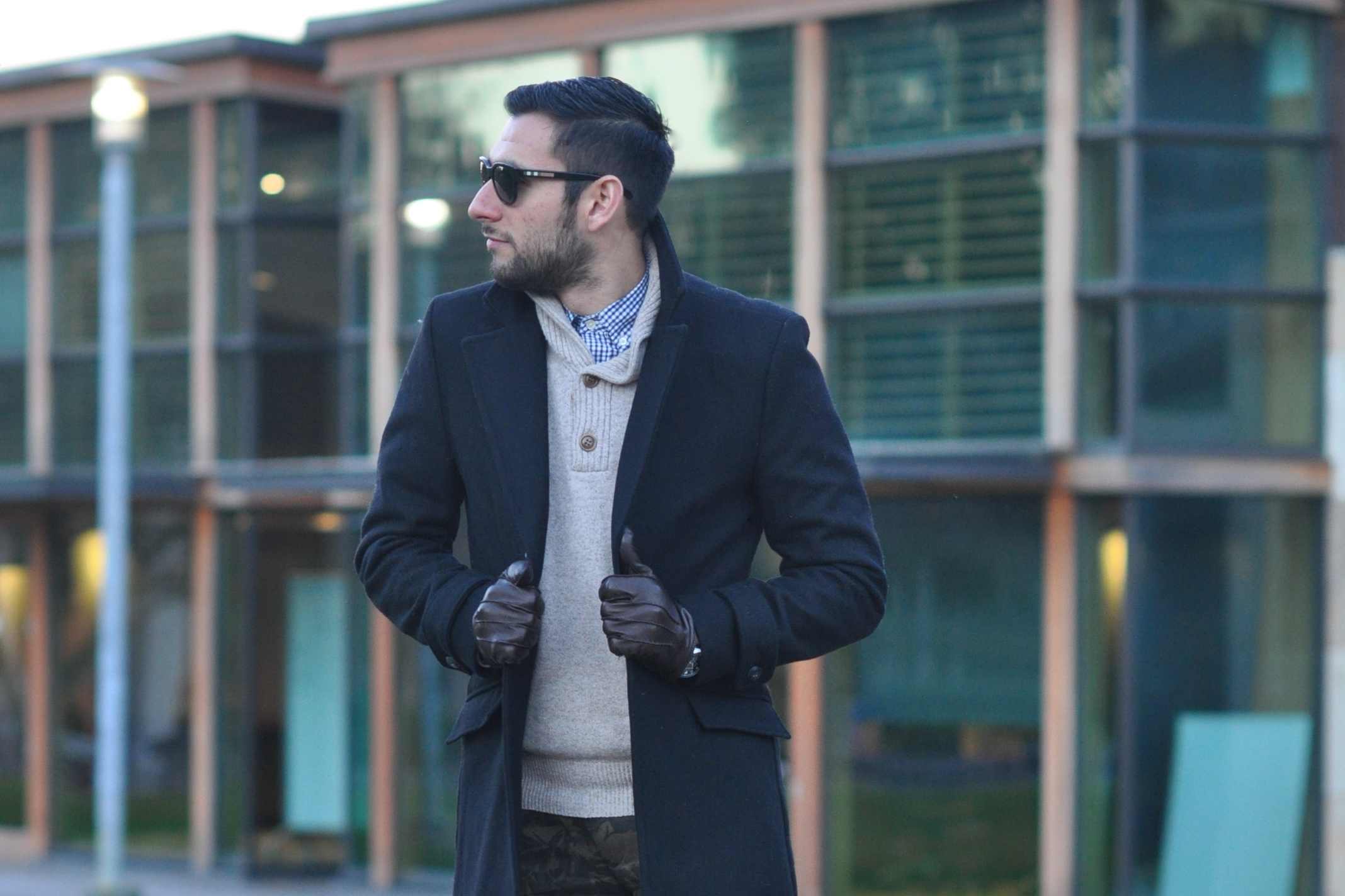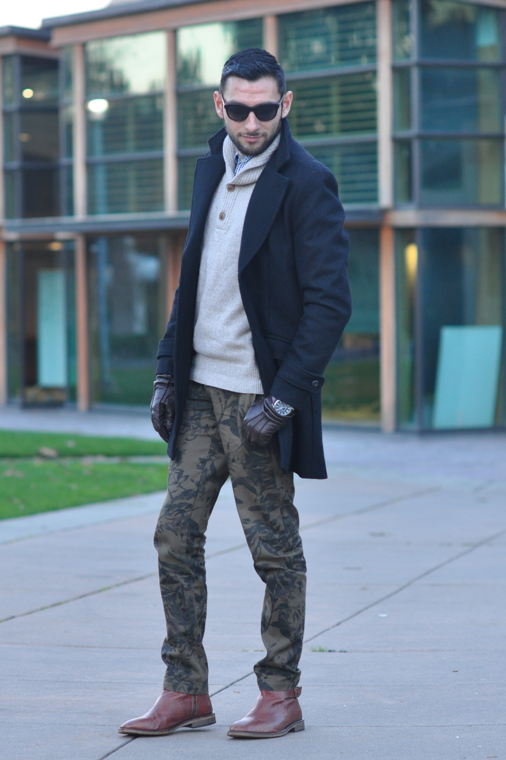 Wool coat Zara, Plaid button-down J Crew, Sweater J. Crew, Camo chinos Club Monaco (Similar by Scotch & Soda), Leather gloves Club Monaco, Boots Aldo (Similar also by Aldo), Watch Michael Kors, Shades Burberry