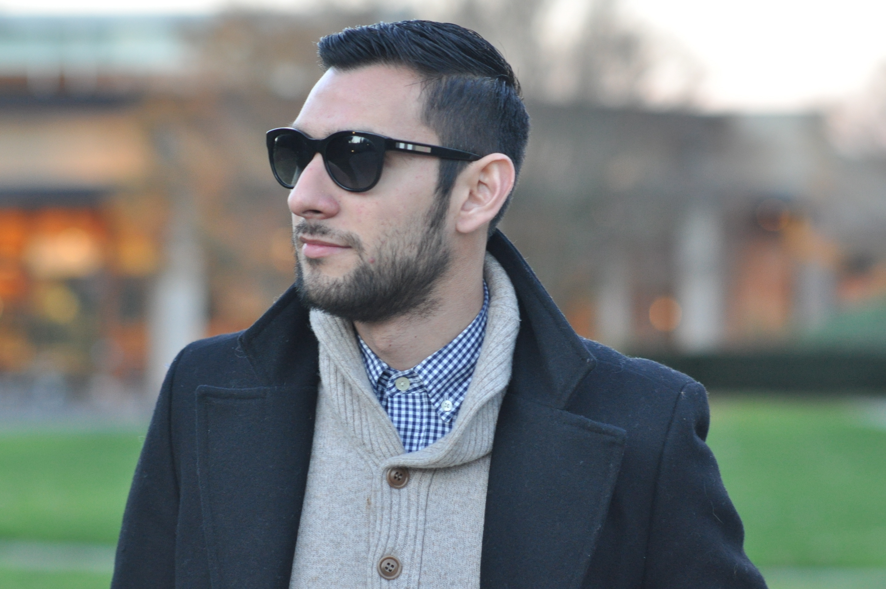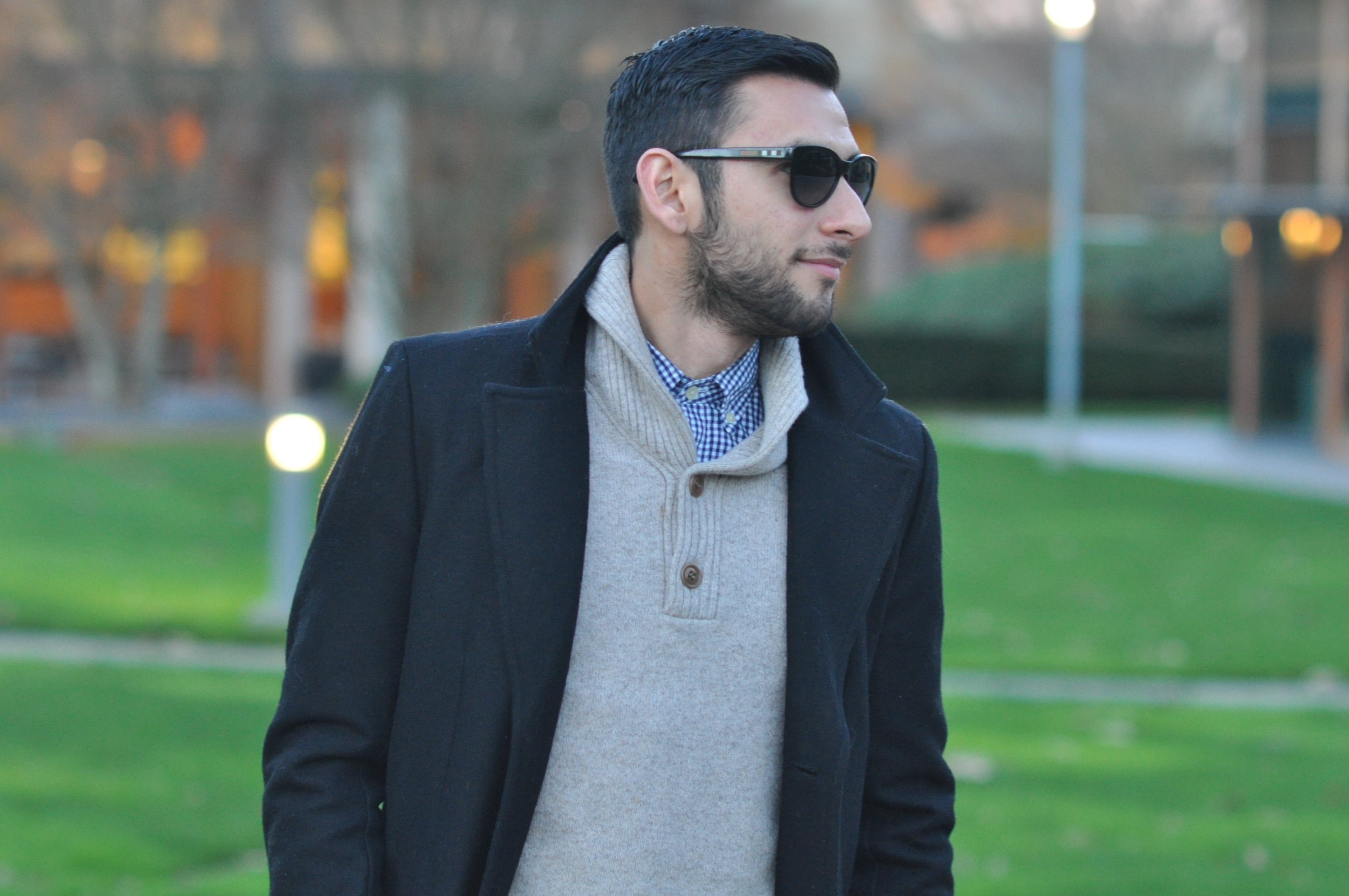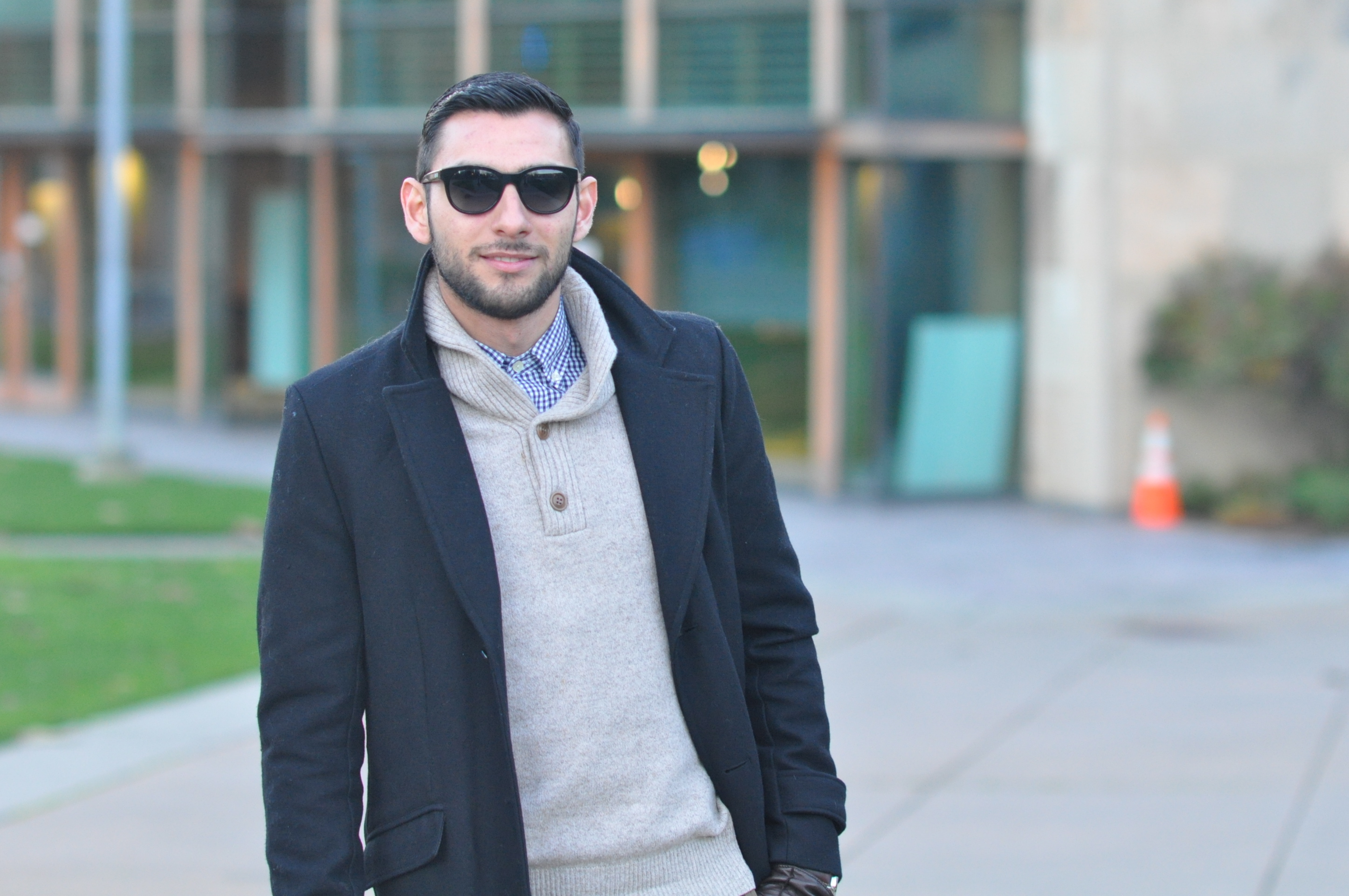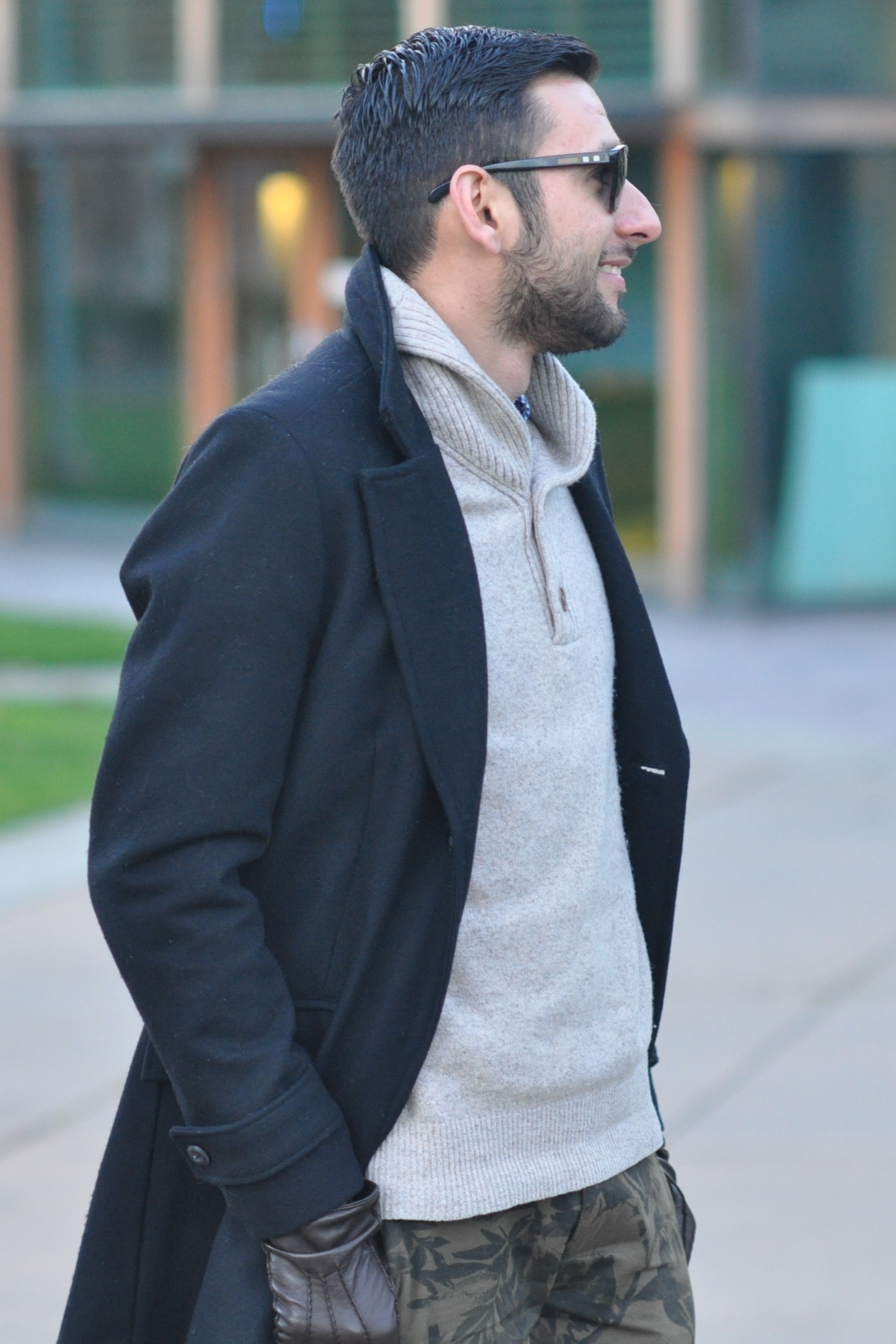 Wool coat Zara, Plaid button-down J Crew, Sweater J. Crew, Camo chinos Club Monaco (Similar by Scotch & Soda), Leather gloves Club Monaco, Boots Aldo (Similar also by Aldo), Watch Michael Kors, Shades Burberry