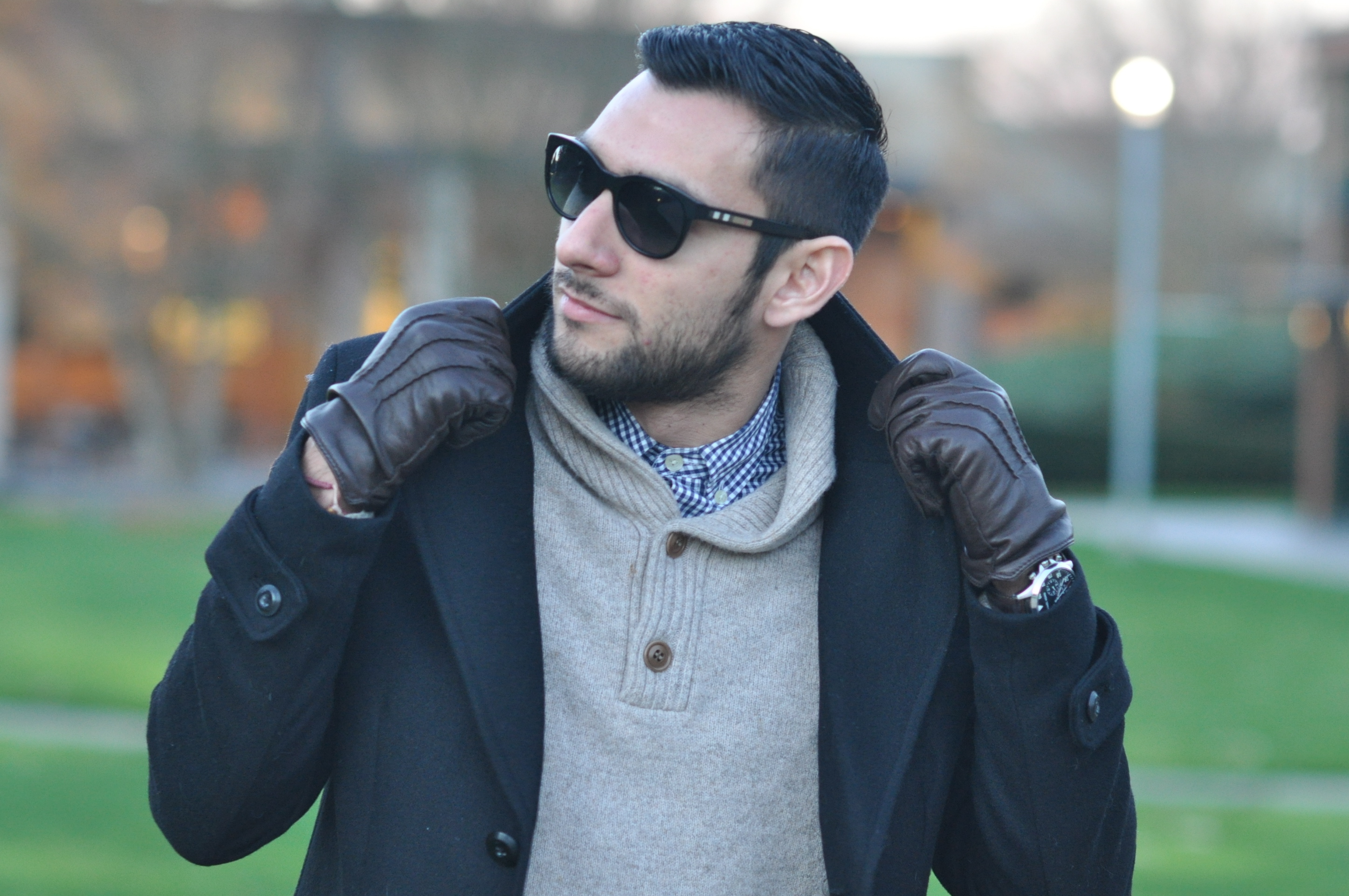 Here I’m wearing a black, wool coat which I bought in Zara a few years ago with my typical work combination of button-down and sweater/cardigan. I love this combo in the winter because it’s warm, and it allows you to play around with layers and textures. For the pants, I decided to wear my camouflage chinos from Club Monaco, where I didn’t fear the risk of mixing too many patterns because of the solid, one color coat I’m wearing. The main focus of this outfit though is in the accessories, which add a touch of leather just to bring everything together. These leather gloves from last year have been really useful over the past few days, where we’ve flirted with the 32-degree mark on a couple occasions (especially end of November). I like how bold they look, and the color is really nice as well. My boots are also made of leather (they’re the ones I wore to my friend’s wedding in LA) and finally the strap of my watch is also made of leather. What do you guys think? Are you as excited as me for leather weather? Thanks again Kim for these photos, they really look fabulous just like you.