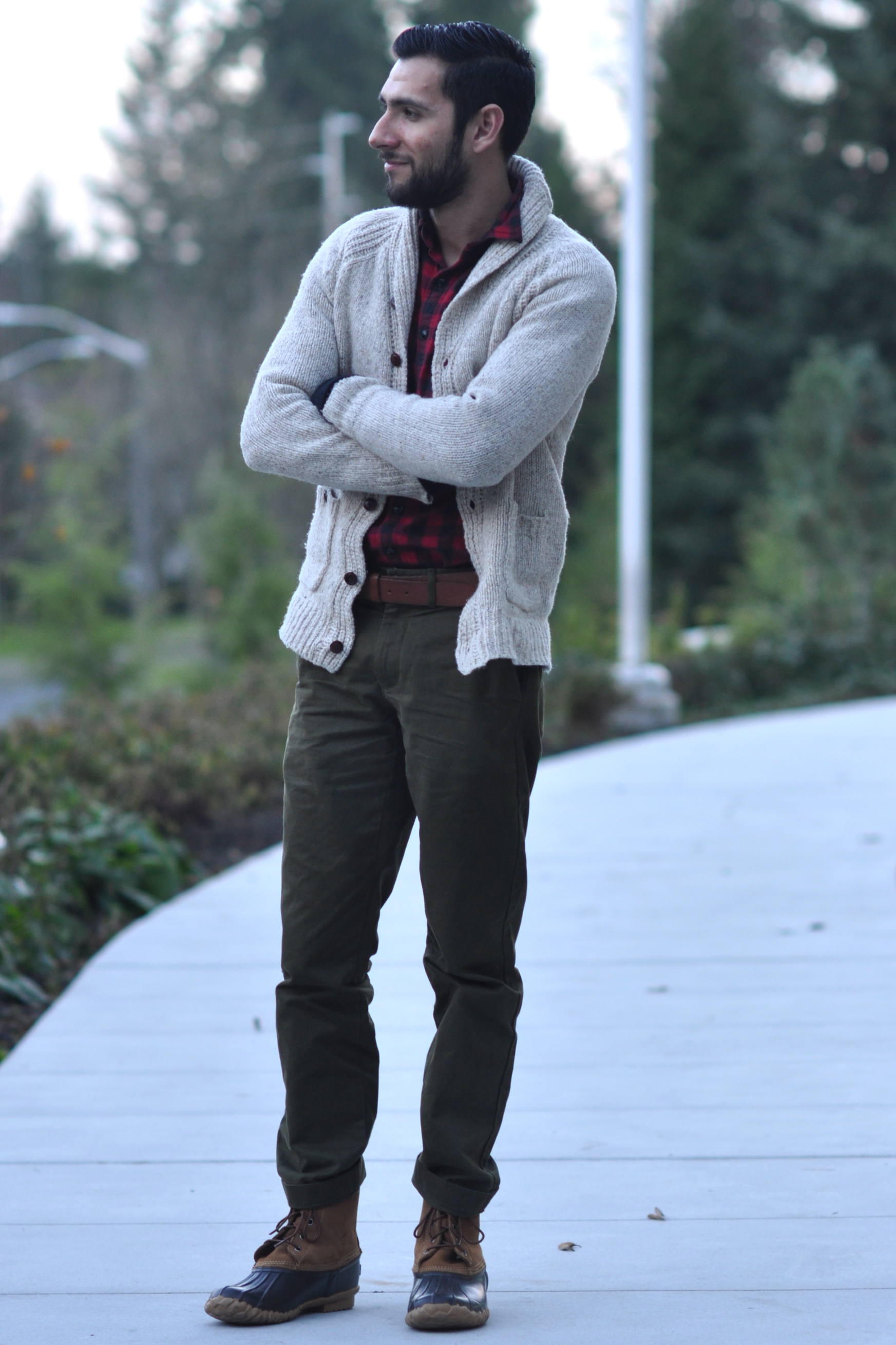 Cardigan J. Crew (Similar also by J. Crew), Plaid shirt J. Crew, Olive green chinos J. Crew, Fingerless cashmere gloves Club Monaco (Similar by Bloomingdale’s), Duck boots Lacrosse for J. Crew