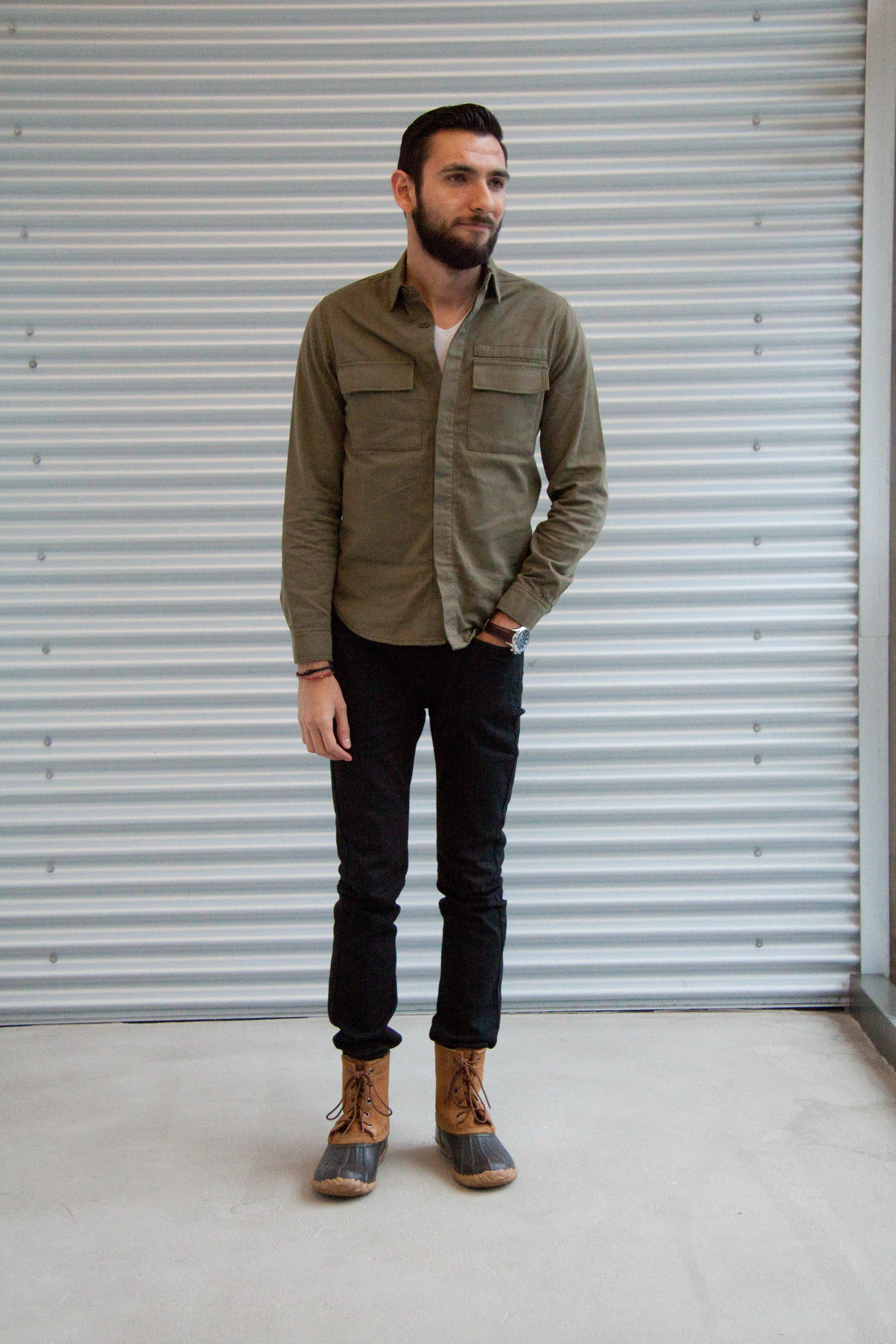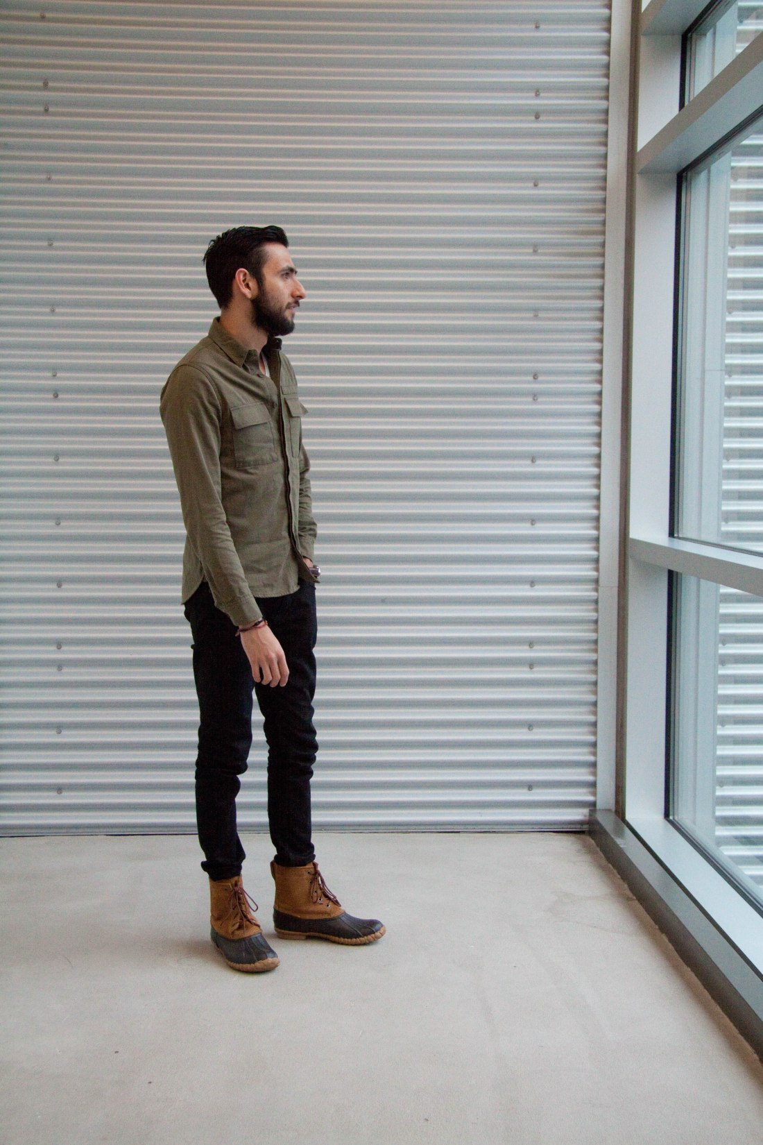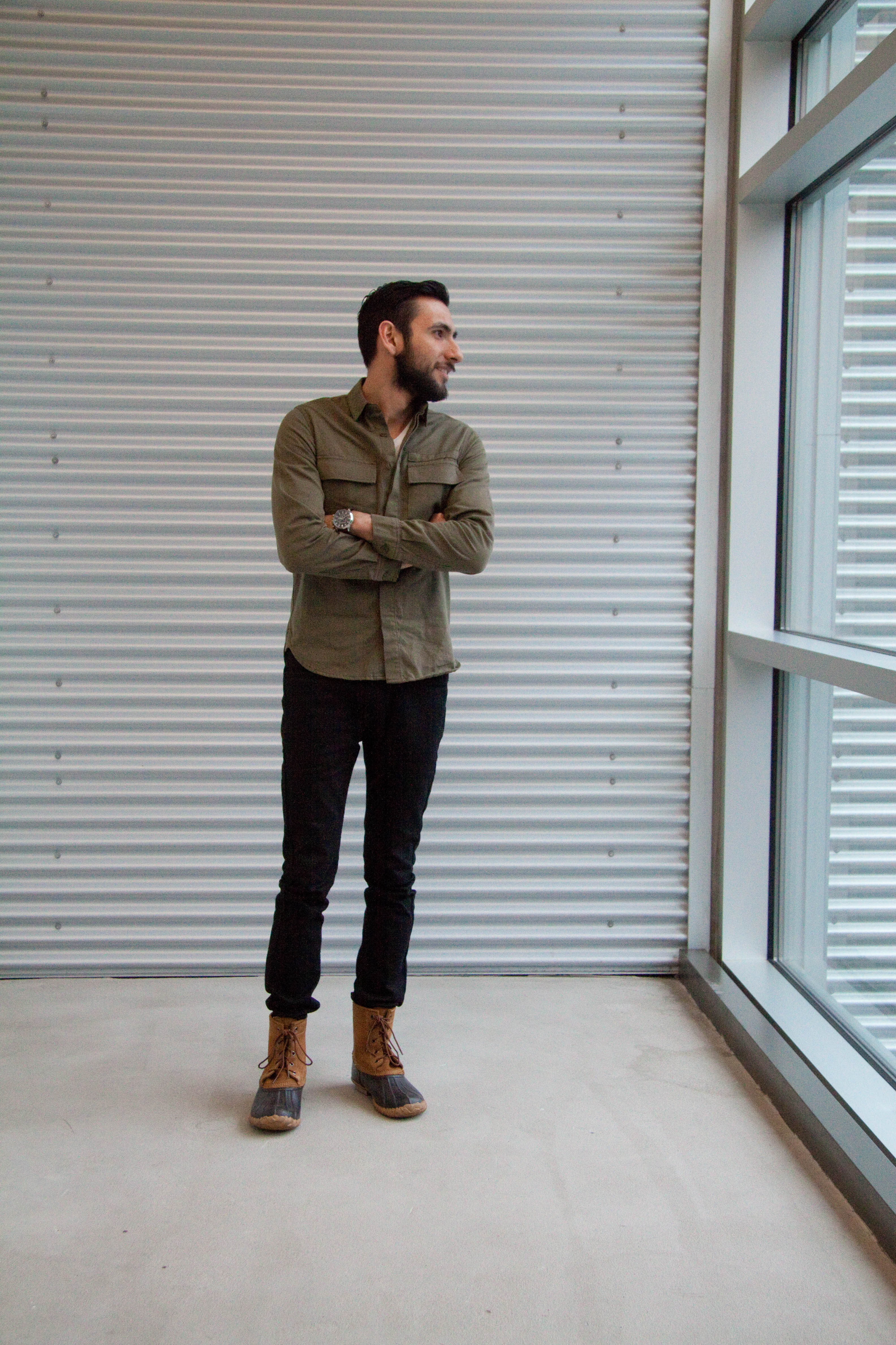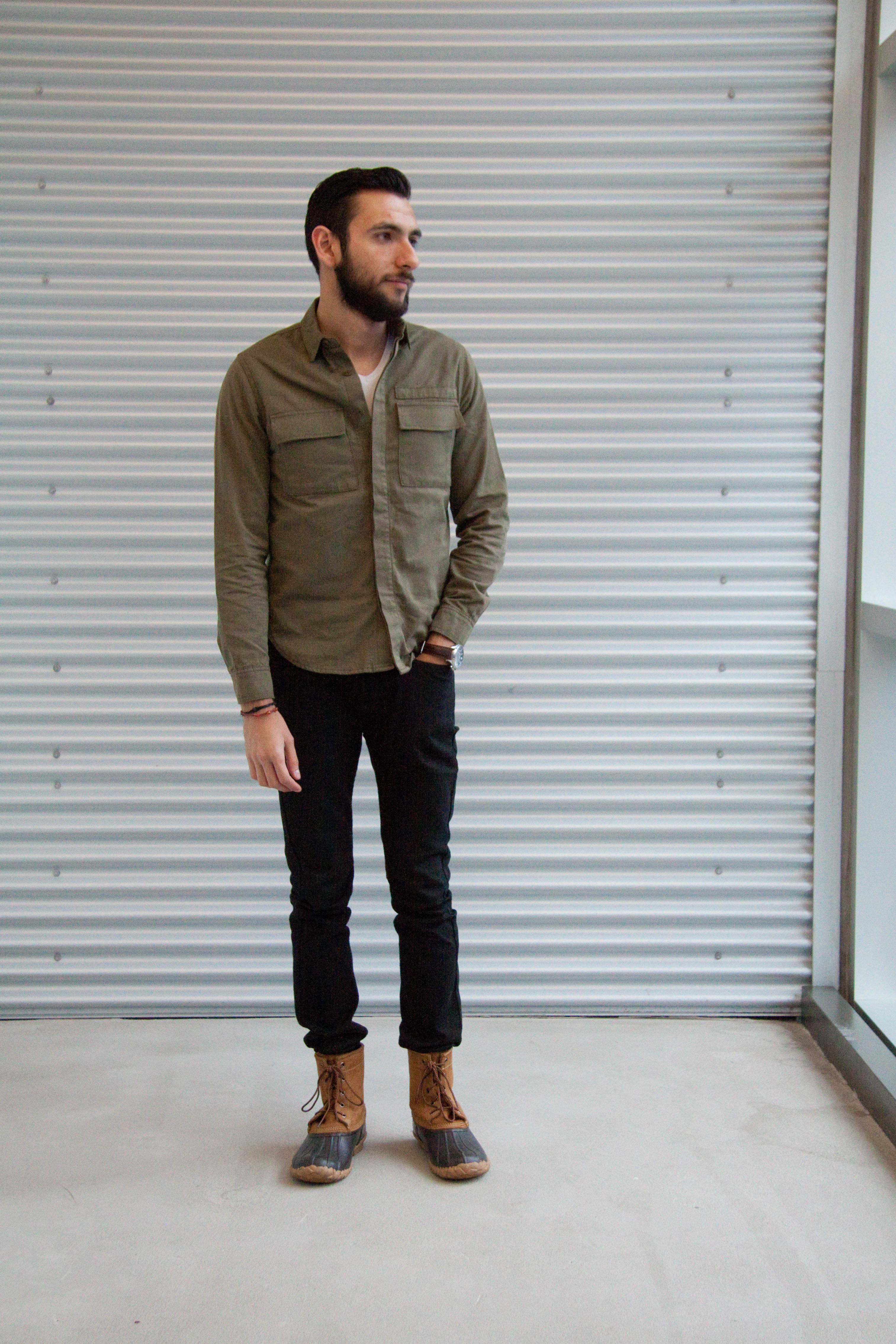 Olive green shirt Topman, Black skinny jeans Topman, Duck boots Lacrosse for J. Crew