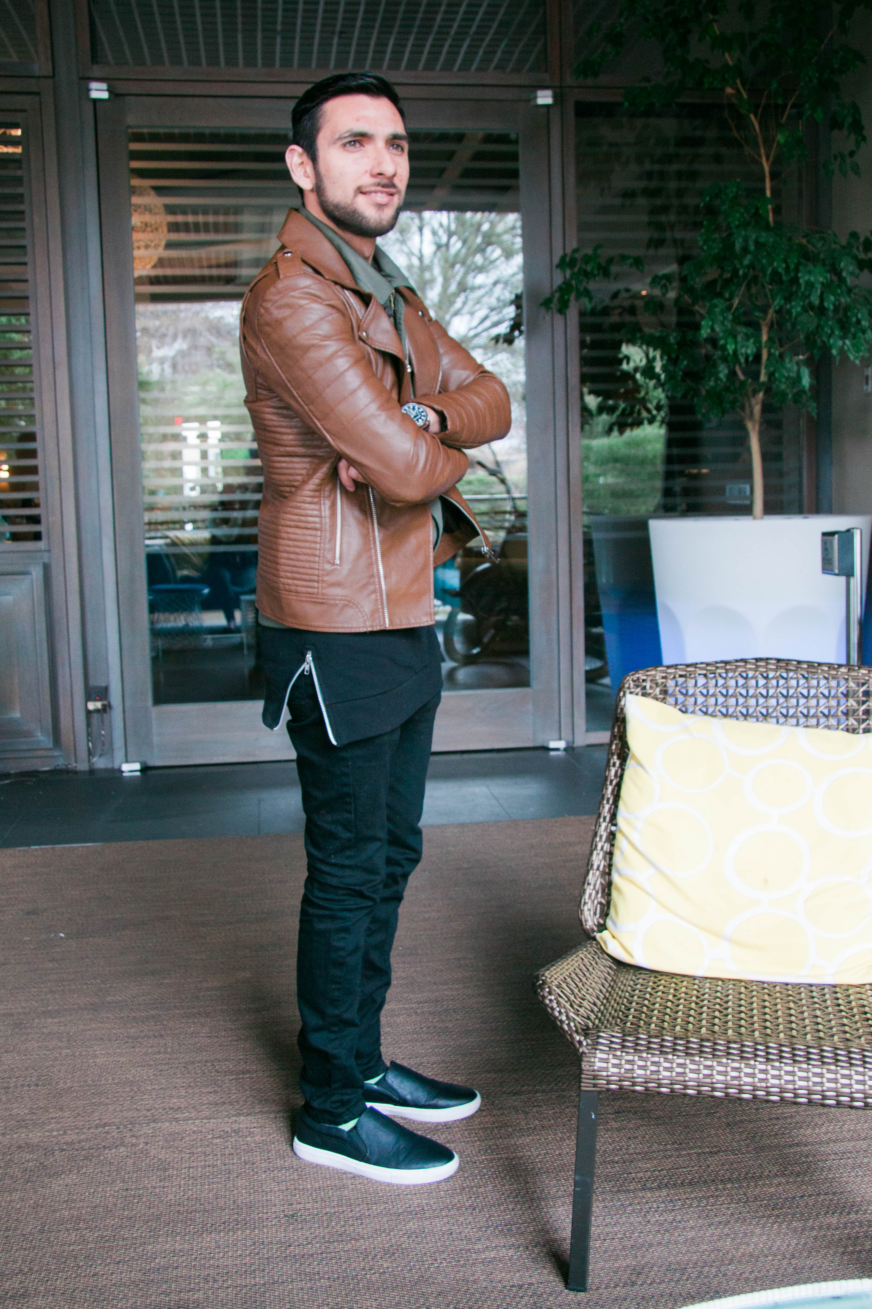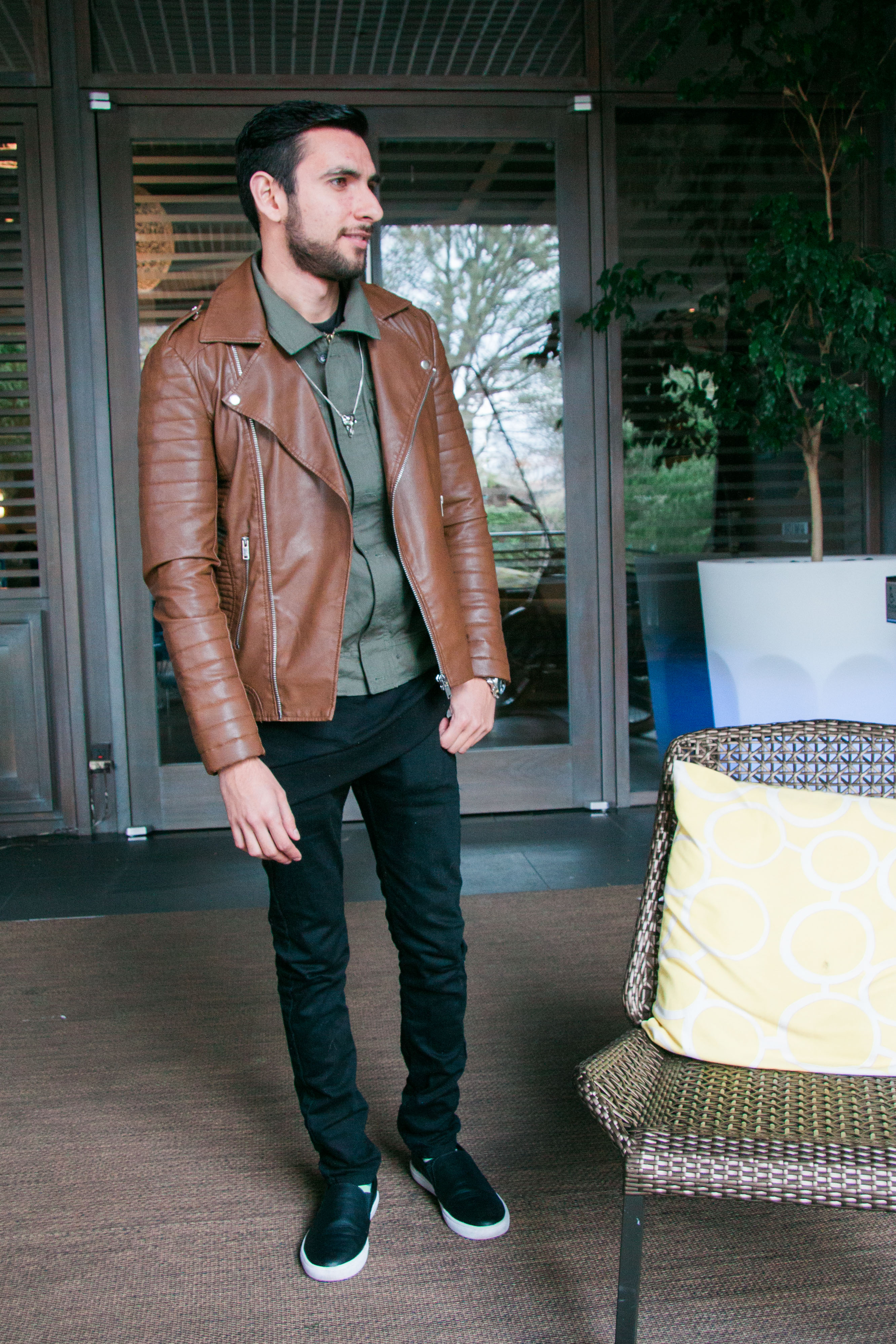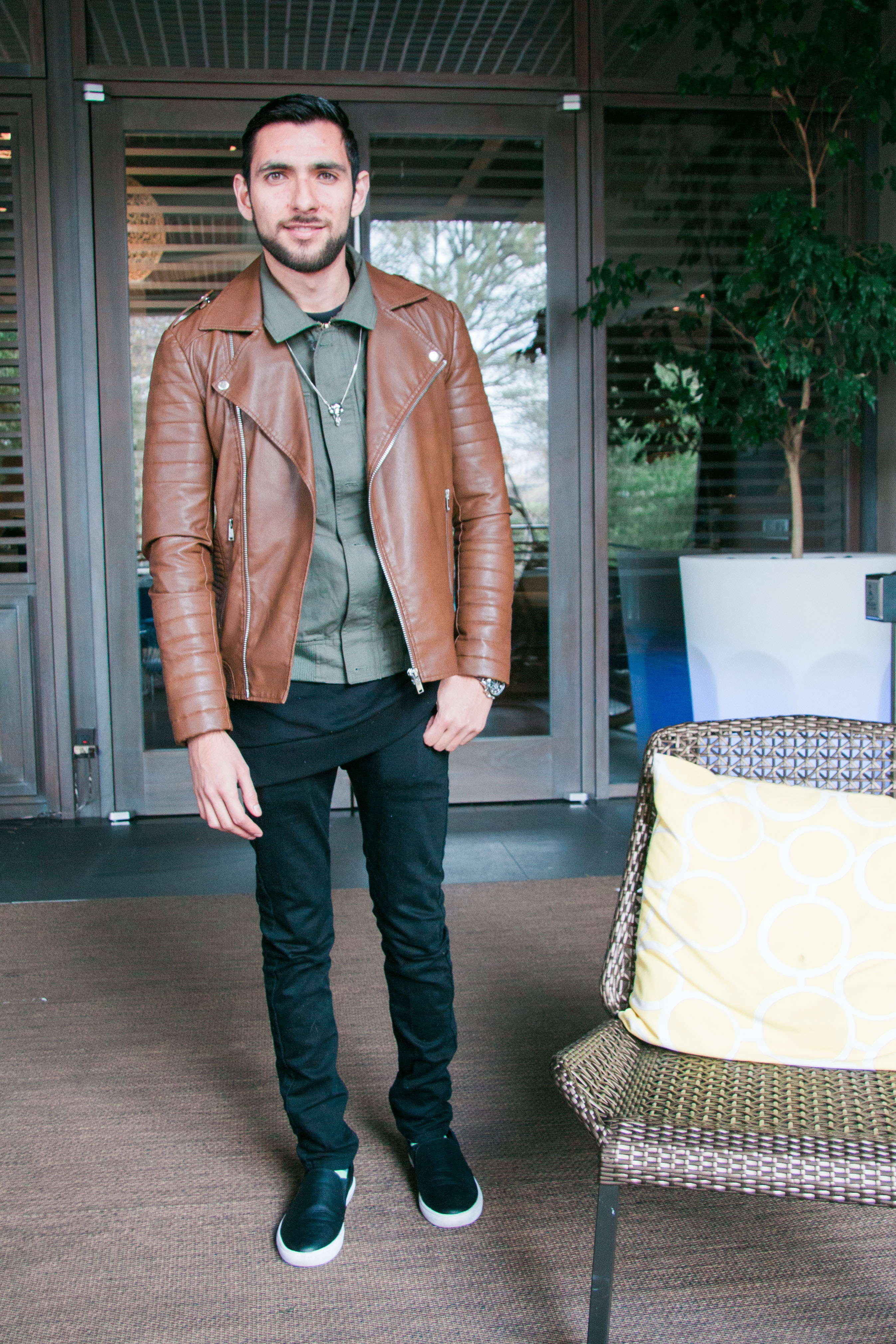 For my flight to Los Angeles, I decided to wear a brown motorcycle jacket which I got during the Black Friday sales in 21 Men. I love how trendy it looks and how all the details and zippers come together to actually give the feeling of real leather (which it totally isn’t guys, faux leather FTW). Underneath the jacket I layered a military green shirt with an oversized sweatshirt below, because who said that the shirt should go under the sweatshirt and not the other way around? I paired these items with my black skinny jeans from Topman and finally wore a skull necklace from H&M to give it a nice, à la Alexander McQueen touch. And for the shoes I went with leather as well since it was raining that day. What do you think of this outfit? Do you like how I played with lengths and details here? Of course I want to thank Kim for the photos, they’re super sharp and cool!