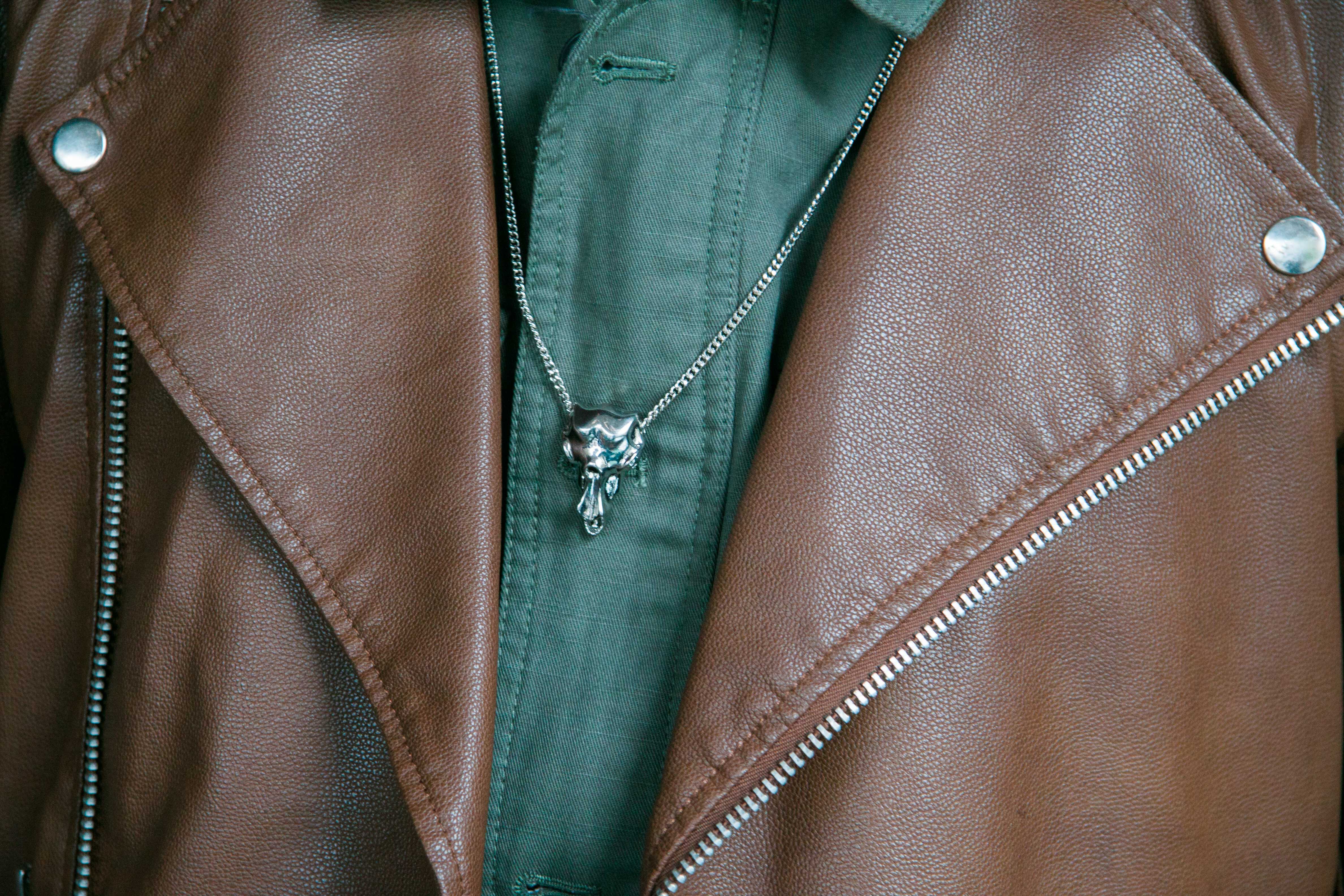 Quilted faux leather motorcycle jacket 21 Men (Similar also by 21 Men), Military green shirt 21 Men, Oversized black sweatshirt Topman (Similar by Asos), Black skinny jeans Topman, Leather shoes 21 Men, Skull necklace H&M (Similar by Asos)