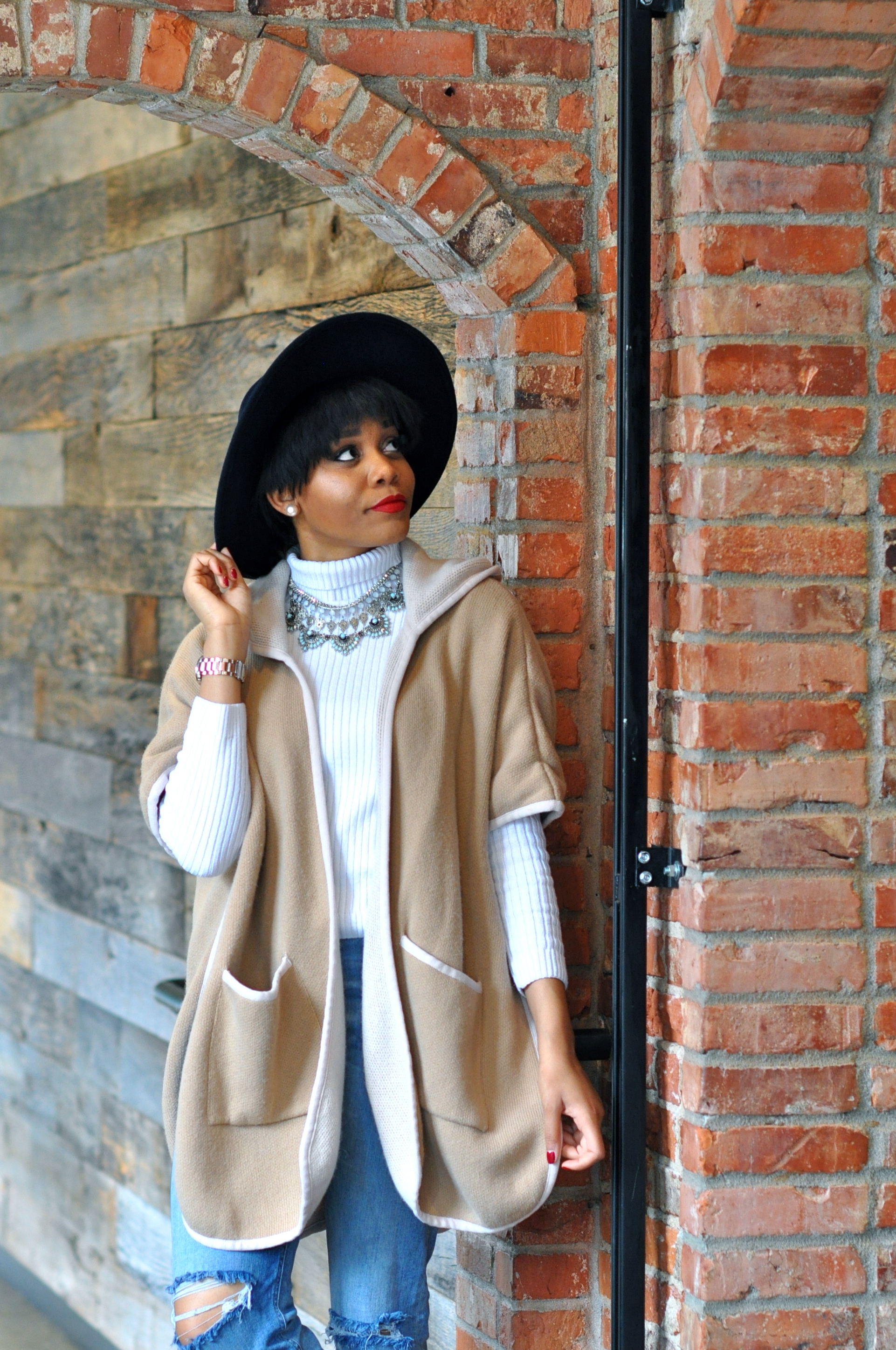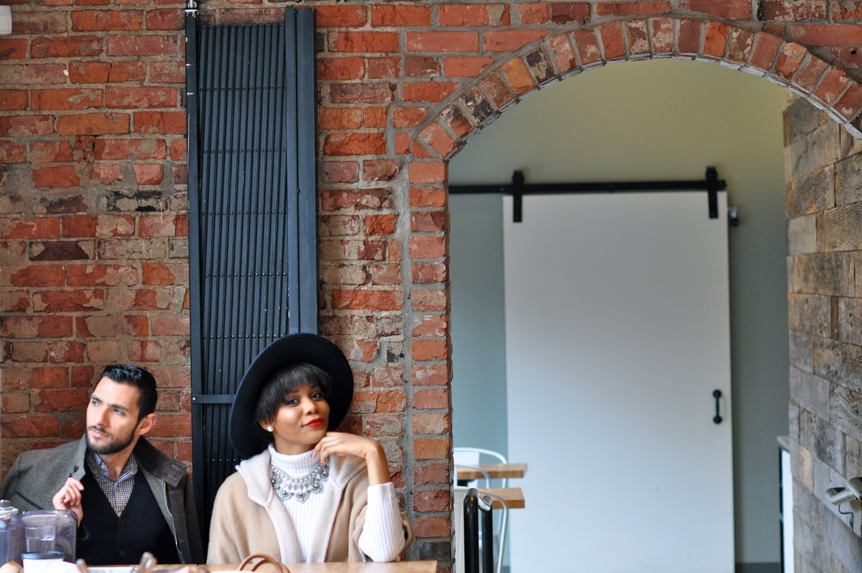 As the Southern bombshell that she is (I know she’s from the PNW, but she definitely portrays this Southern girl vibe with a lot of her looks) Kim here is delighting us with a beautiful ensemble of a white, laced dress with knee-high leather boots. She paired these two up with a faux-fur vest, which is really coming in next season, and she let her honey-toned, long gorgeous hair flow graciously over her shoulders. Yas Kim, you’re killing us with this look! Then we have Nini’s look, which is also really suitable for spring, consisting of a white turtle-neck sweater from ASOS with some boyfriend jeans by H&M and Converse sneakers. Nini styled this outfit with a radiant statement necklace and a cape with a black hat. We’re totally feeling a tourist vibe here, which next to the brick and wooden walls of the restaurant made it feel more like if we were somewhere in Southern Europe rather than downtown Redmond.