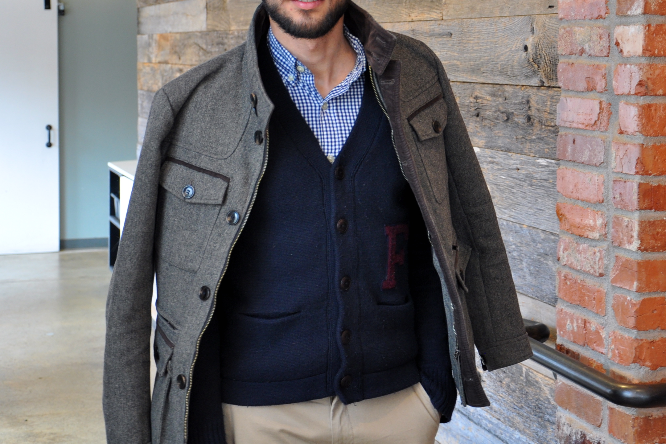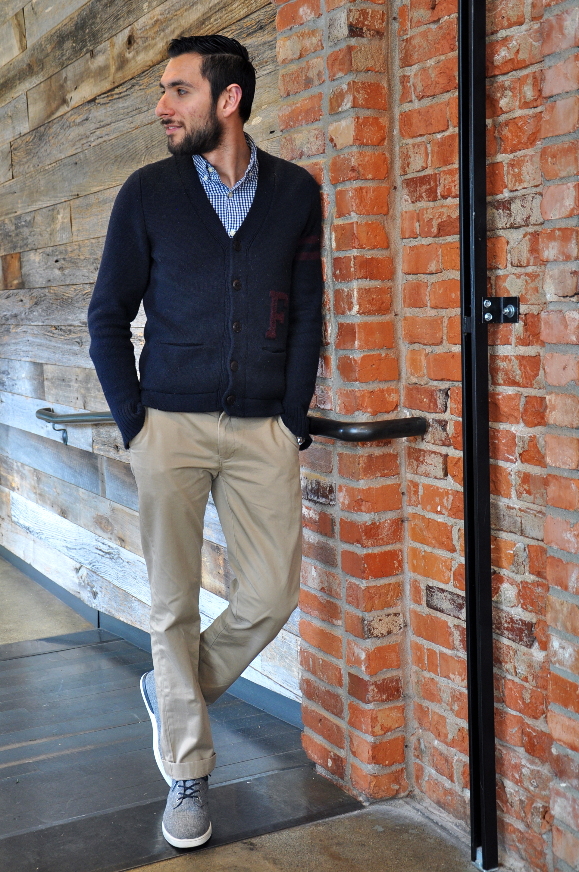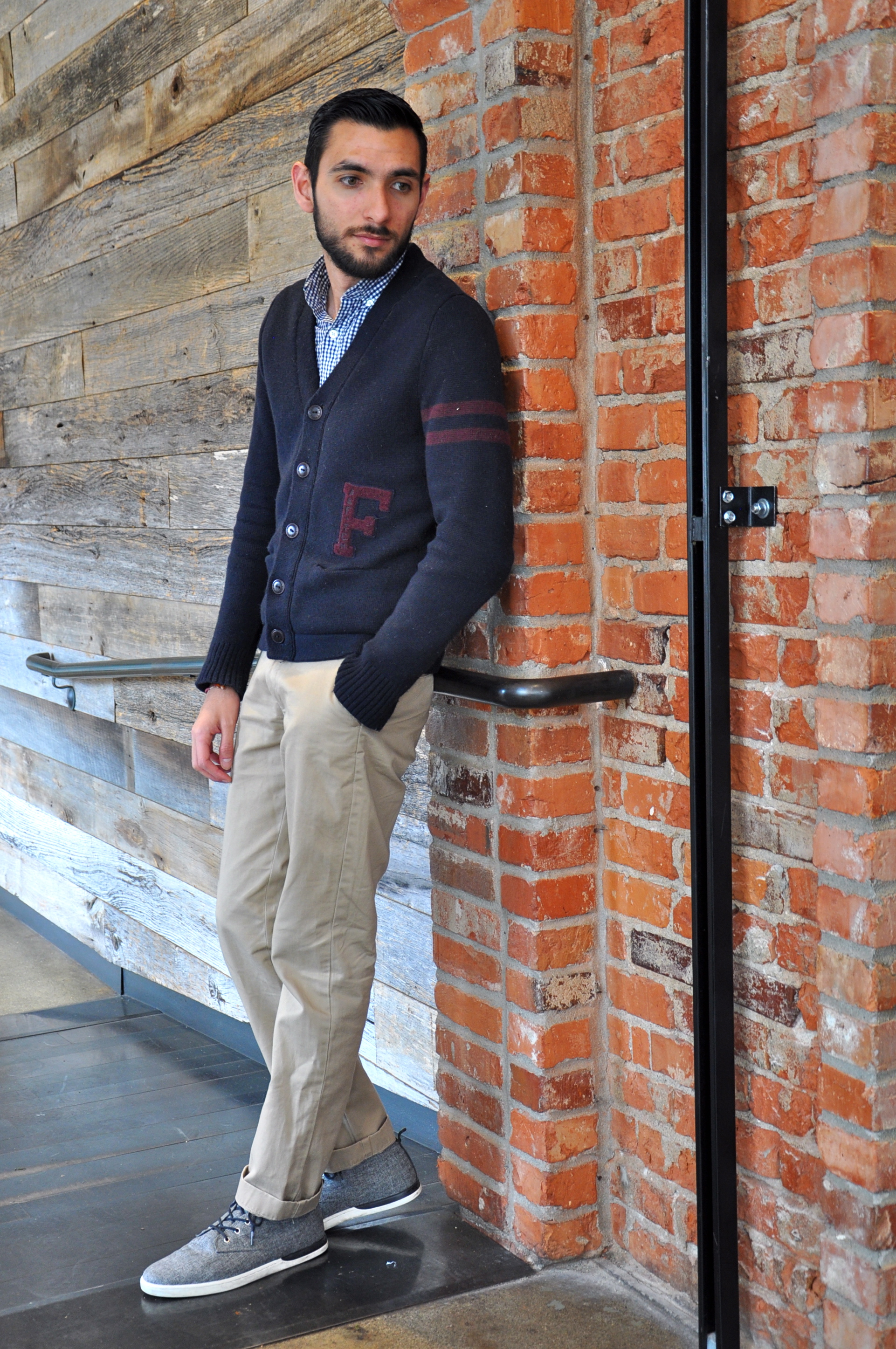 Hector – Varsity cardigan Abercrombie and Fitch (Similar also by Abercrombie and Fitch), Classic navy gingham button-down J. Crew, Light khaki style chinos J. Crew, Sneakers Creative Recreation (Similar also by Creative Recreation), Coat H&M (Similar also by H&M)