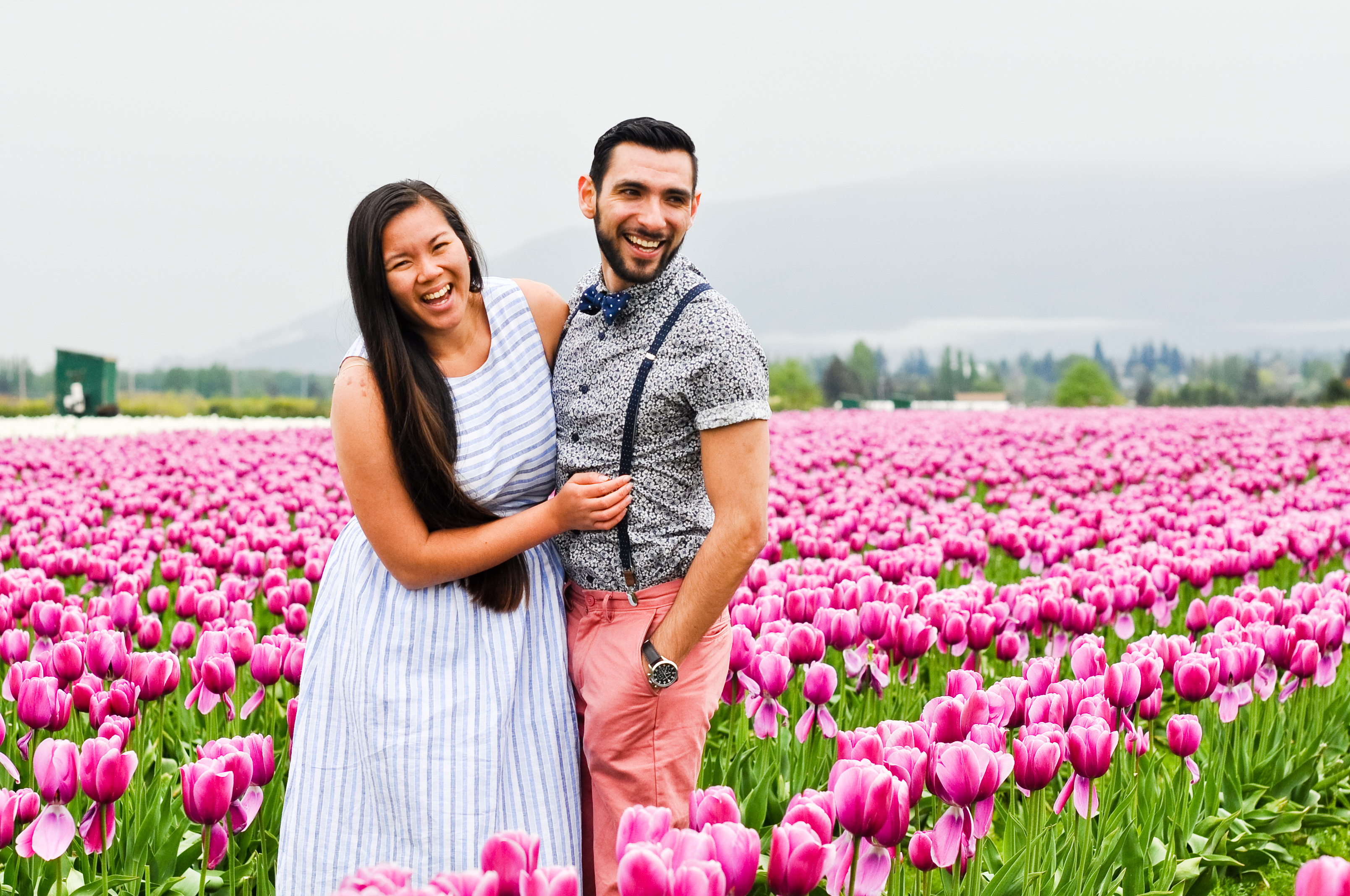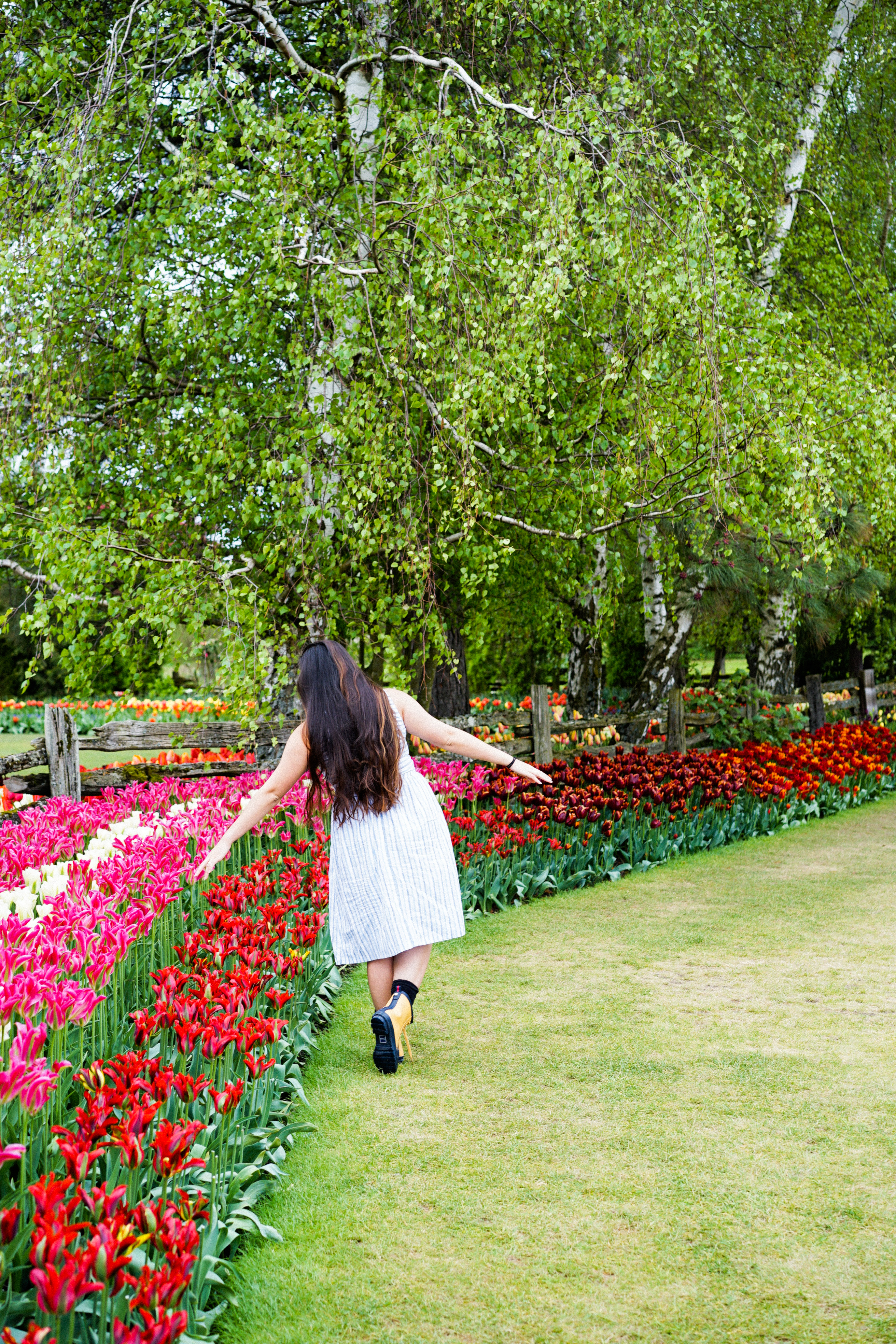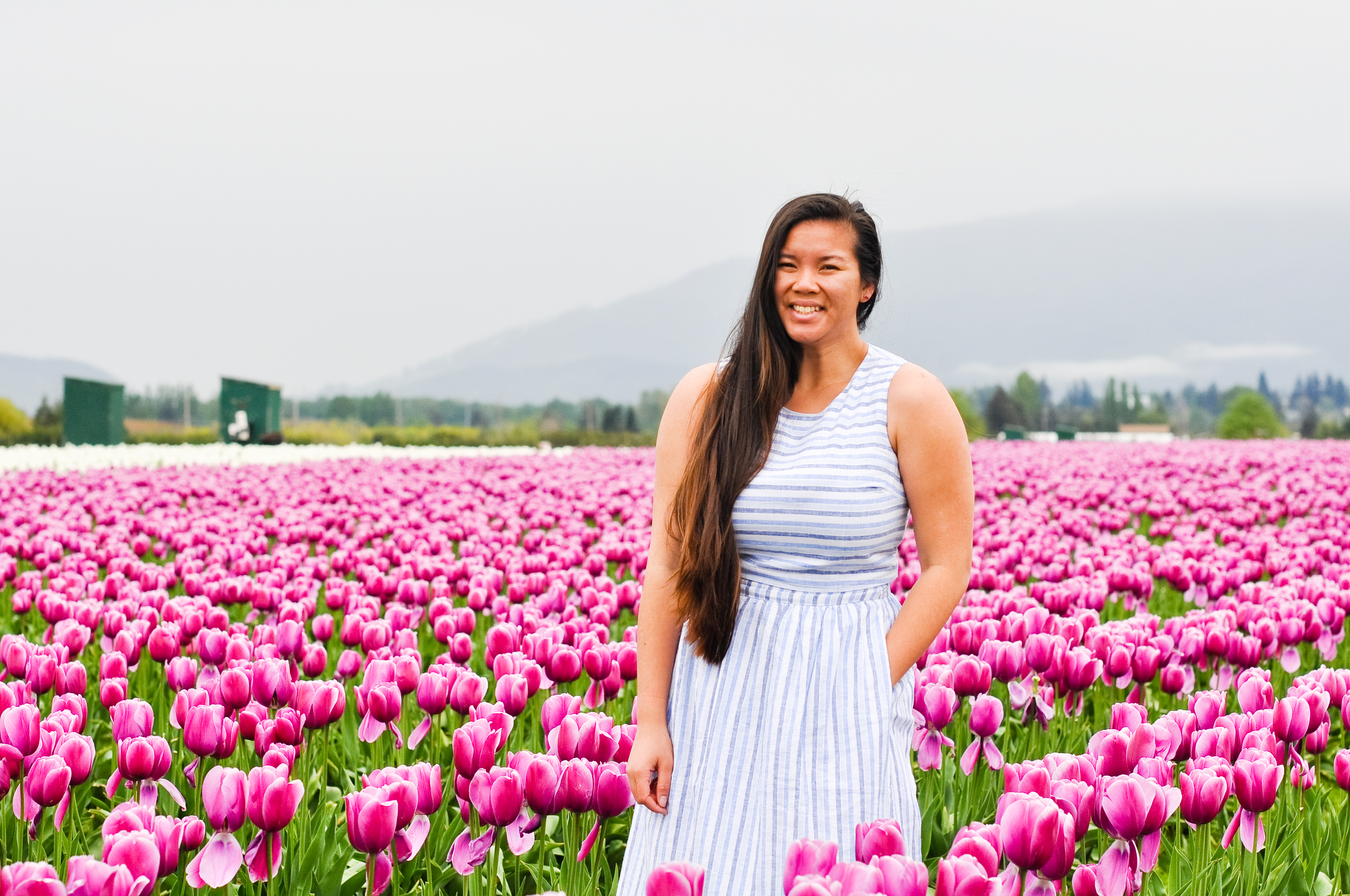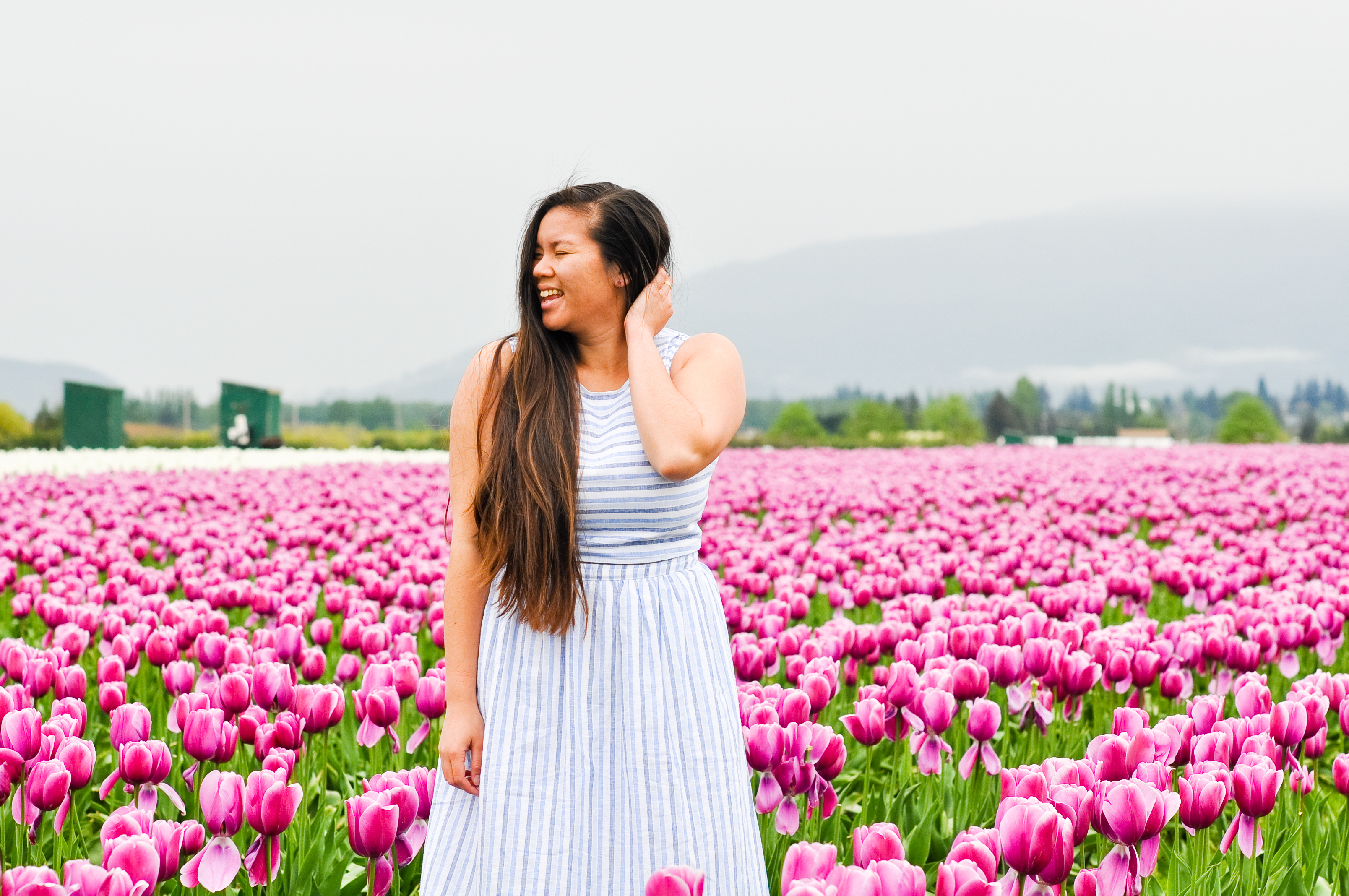 As I mentioned a few posts ago, my blog BFF and partner in crime Kim from HelloKimWin and I have been preparing a very pleasant surprise for you. Without much farther ado, here it is, our photoshoot from the Skagit Valley Tulip Festival this year. Kim and I got really lucky on this morning adventure since there was almost no one there but us, so we were able to take a lot of great photos with some of our new camera equipment. Kim got a new camera from Dara, and gosh does it do the job well! The photos from that camera come out so good that they are blog-ready the moment you take them. As for myself, I got a new tripod, which we could use to take photos of us together without having to ask a random stranger to snap a pic for us. Yay for technology (although I must admit that it was quite funny setting the camera to timer mode and then having to run through tulip rows to get to where Kim was).
