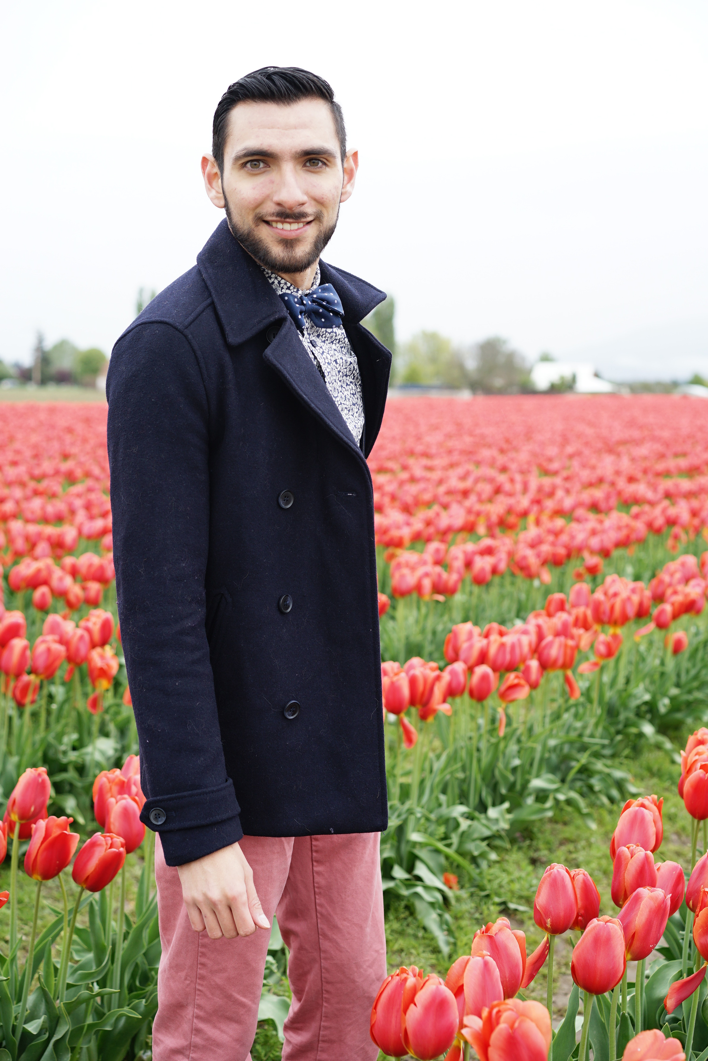 As for myself I decided to go for a festive, spring look comprised of a floral short-sleeve shirt with a pair of polka-dotted bow tie and suspenders. I wanted to give a fun, fresh vibe but with some sophistication which I also enhanced by wearing a navy peacoat on top. For the pants I went for a light pink, broken chino which looks amazing in the pink and red tulips. There is no belt this time because the suspenders do the job that belts do regularly, which is keep your pants in place. Finally for the shoes I also opted for a pair of rain boots, since I didn’t want to ruin some nice shoes in the mud, but besides that I think that they went along really well with the whole look to make it a little less formal and more casual. What do you guys think? I believe this is the best work we’ve done so far for the His and Hers series and I’m super excited about turning up the notch for next posts given this point of comparison.