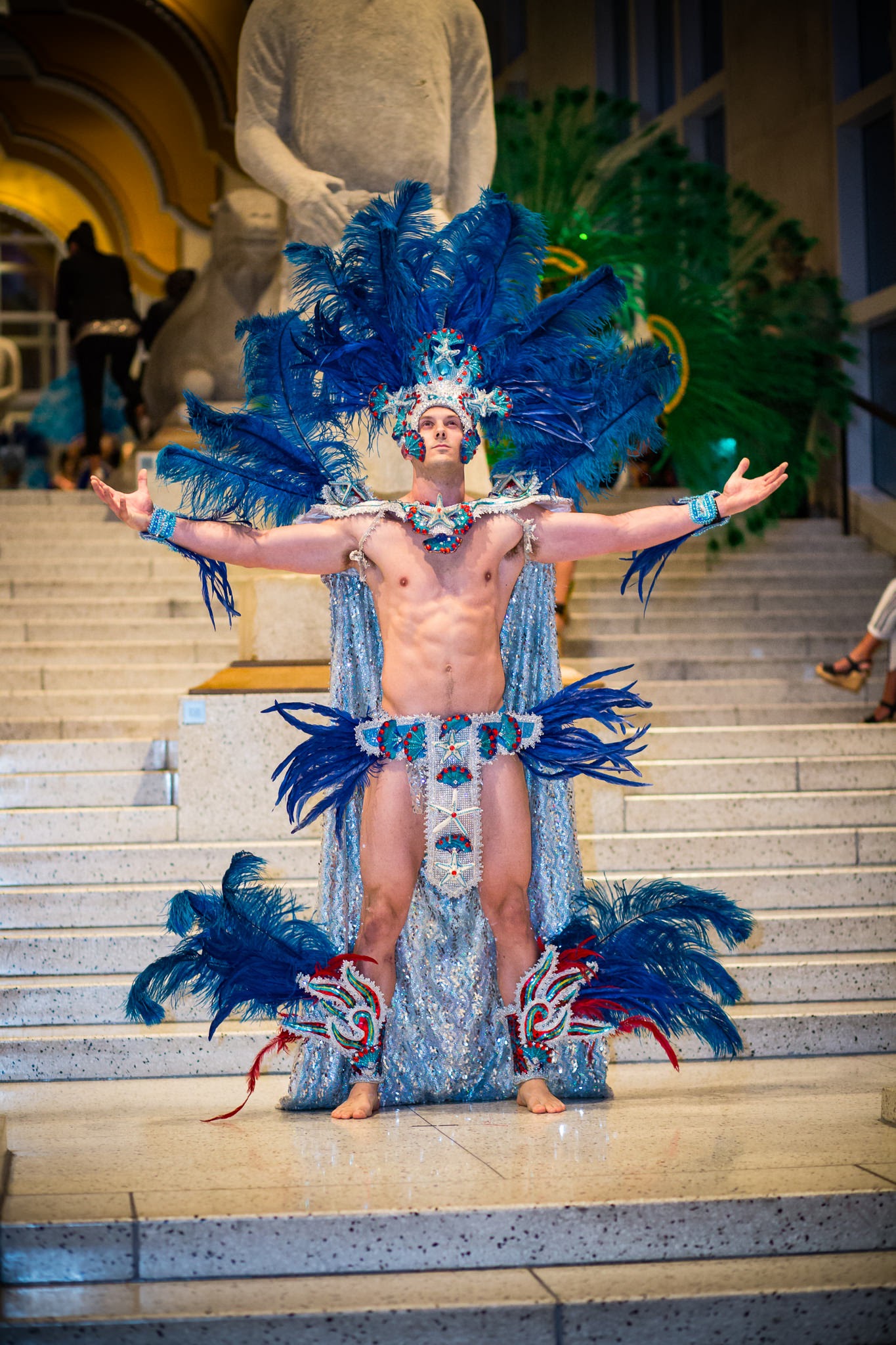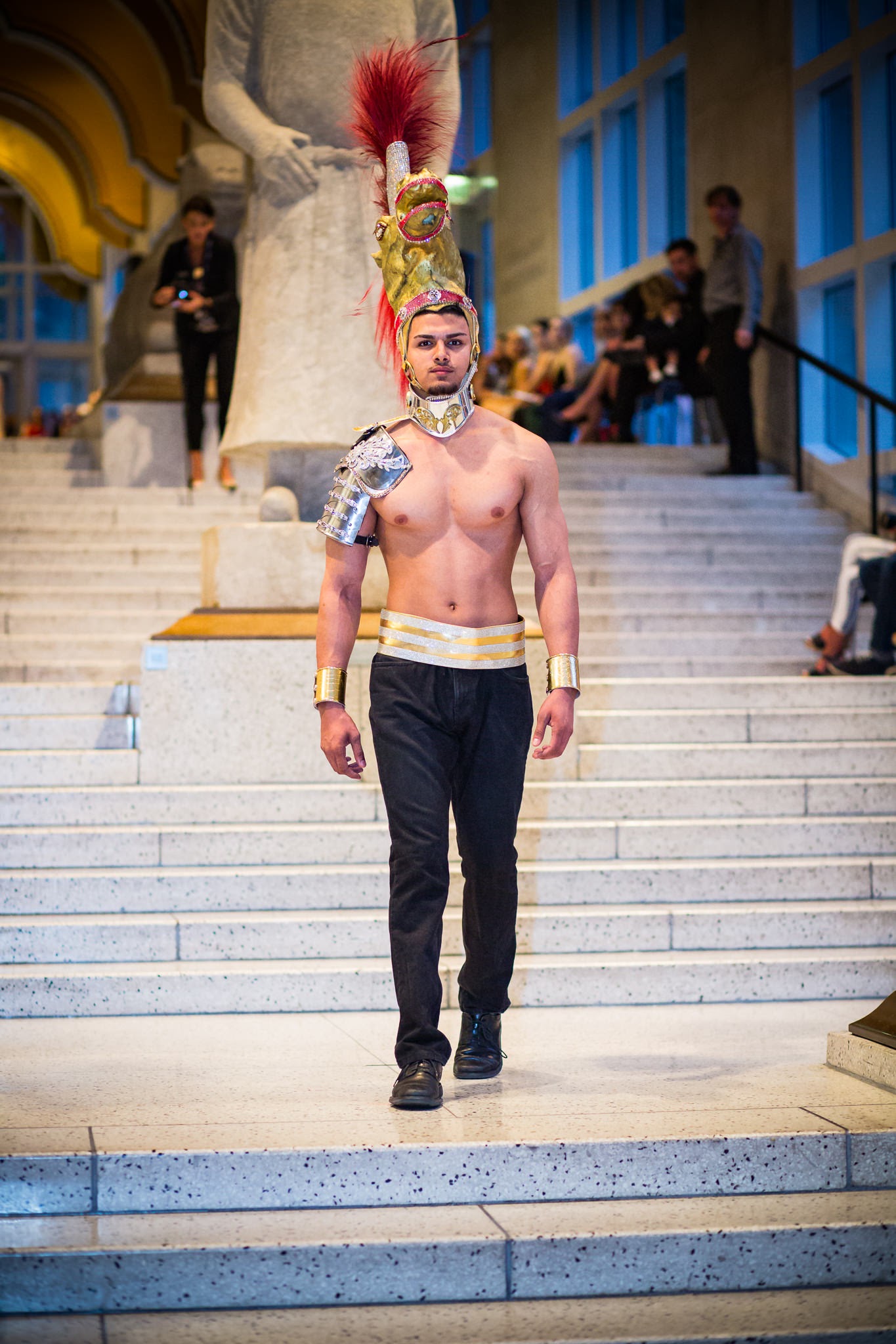 The opening act was a display of suits and casual menswear by Suit Supply. I was highly impressed by the amount of detail and the level of high fashion that was incorporated to these looks. From floral ties, to leather suitcases, to plain color suits, and patterned prints, the wide array of textures and color left a great impression on me. Being a menswear blogger myself, I have a keen appreciation for taking risks with bold prints and patterned fabrics, and this opening really started the show with a bang. Next in the lineup was costume designer Perry Meek, who is really famous for having designed costumes for Lady Gaga and other artists. His vision on the runway really came through by the means of his work: male and female warriors in life, dressed with metallic bodices and feathery headpieces, started walking down the runway displaying an amazing use of unconventional fabrics and materials one wouldn’t normally see at a fashion show. His red body suit a la Queen of Hearts was a showstopper, and drew the attention from everyone in the room. I find it great when fantasy, style, and art meet in such a seamless, beautiful way, and Meek achieved that to perfection.