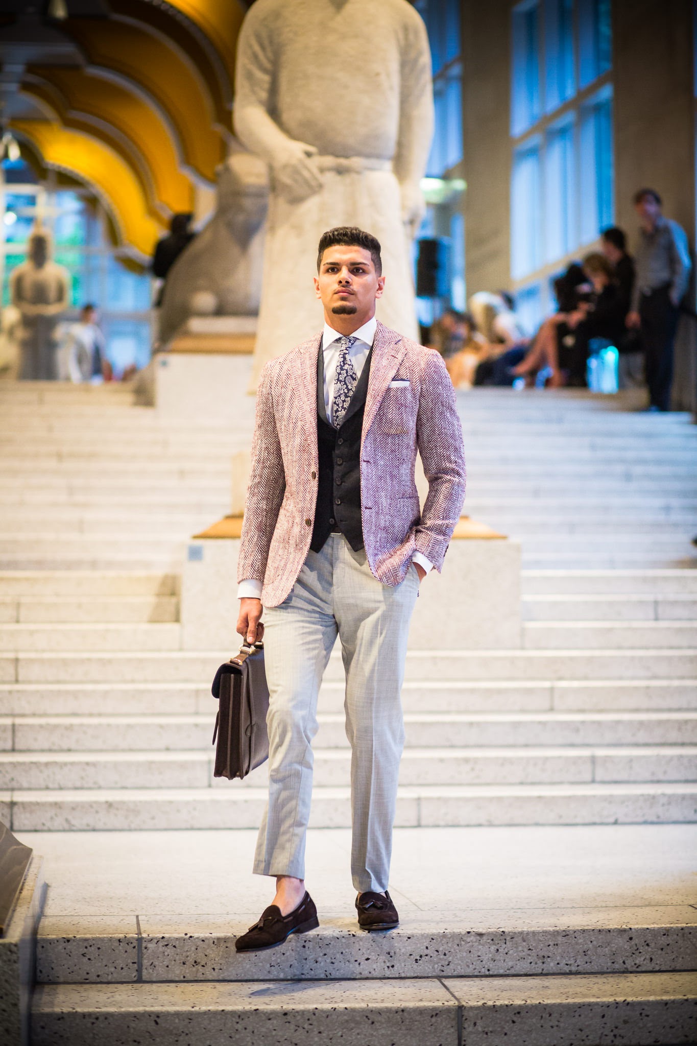 El acto inaugural consistió de un despliegue de trajes y ropa de hombre casual auspiciado por Suit Supply. Me quedé impresionado con la cantidad de detalle y el nivel de alta costura que se incorporó a estos looks. Desde corbatas florales, a portafolios de piel, de trajes lisos en un solo color, a diversos estampados, la gran gama de texturas y colores me dejó una muy buena impresión. Siendo yo un blogger de moda masculina, tengo un aprecio muy especial por looks que toman riesgos con estampados llamativos y telas con distintos patrones, así que para mí el show había comenzado con el pie derecho. El siguiente en el itinerario fue el diseñador de disfraces y vestuario Perry Meek, quien es reconocido por haber diseñado vestuarios para artistas como Lady Gaga, entre otros. Su visión en la pasarela realmente se plasmó en su trabajo: guerreros y guerreras de la vida, vestidos en armazones metálicas y adornos de plumas, comenzaron a bajar por las escaleras desplegando un uso impresionante de materiales y telas no convencionales que uno normalmente no ve en un show de moda. Su body suit rojo muy a la reina de corazones fue un agasajo para los presentes, llamando la atención de todos los espectadores. Personalmente me fascina cuando un diseñador combina la fantasía, el estilo y el arte de manera tan armoniosa y bella, y siento que Meek logró eso a la perfección.