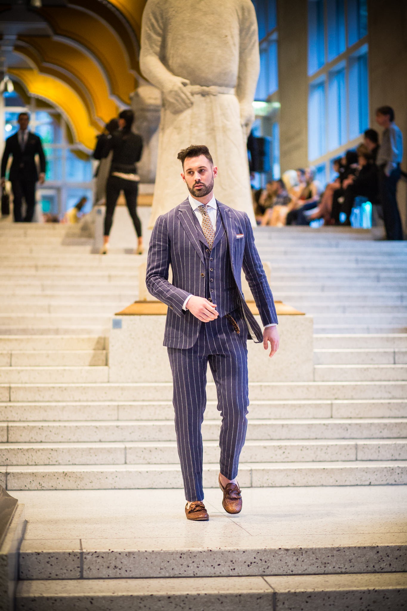 Los siguientes dos diseñadores en compartir sus diseños fueron Clara Rotescu y Ema Savajh con su colección Olena Dat’s Miau, y la colección de Claire. Estos dos actos consistieron principalmente en vestidos de noche, algunos de los cuales estaban como para caer desmayado. Mis favoritos fueron un vestido largo blanco con transparencias, hombros asimétricos y detalles en rosa en la falda y un hermoso vestido halter en rojo con piedrería y dobleces en la falda. La luz se reflejaba en los mejores lugares con esta última pieza y todos en el público la ovacionaron cuando fue presentada. El próximo acto fue una segunda presentación de Suit Supply en ropa masculina, pero esta vez, ropa formal y smokings sería lo que veríamos en el escenario. Debo admitir que estos trajes se veían fabulosos y mi favorito era un traje todo en color blanco con un moño negro, trayendo de vuelta ese look de estrella de Hollywood de los años 50s. Por último, bajó por la pasarela un vestido-pintura hecho a mano por Anahit Etemadi con el rostro de Marilyn Monroe y las creaciones de la diseñadora Julie Danforth. Esta obra de arte es la mezcla perfecta de moda y arte en una forma muy original y el nivel de detalle y pensamiento detrás de este es excepcional. Este fue sin duda mi look favorito de todo el show y la modelo caminó con gracia y nos puso a todos de pie.