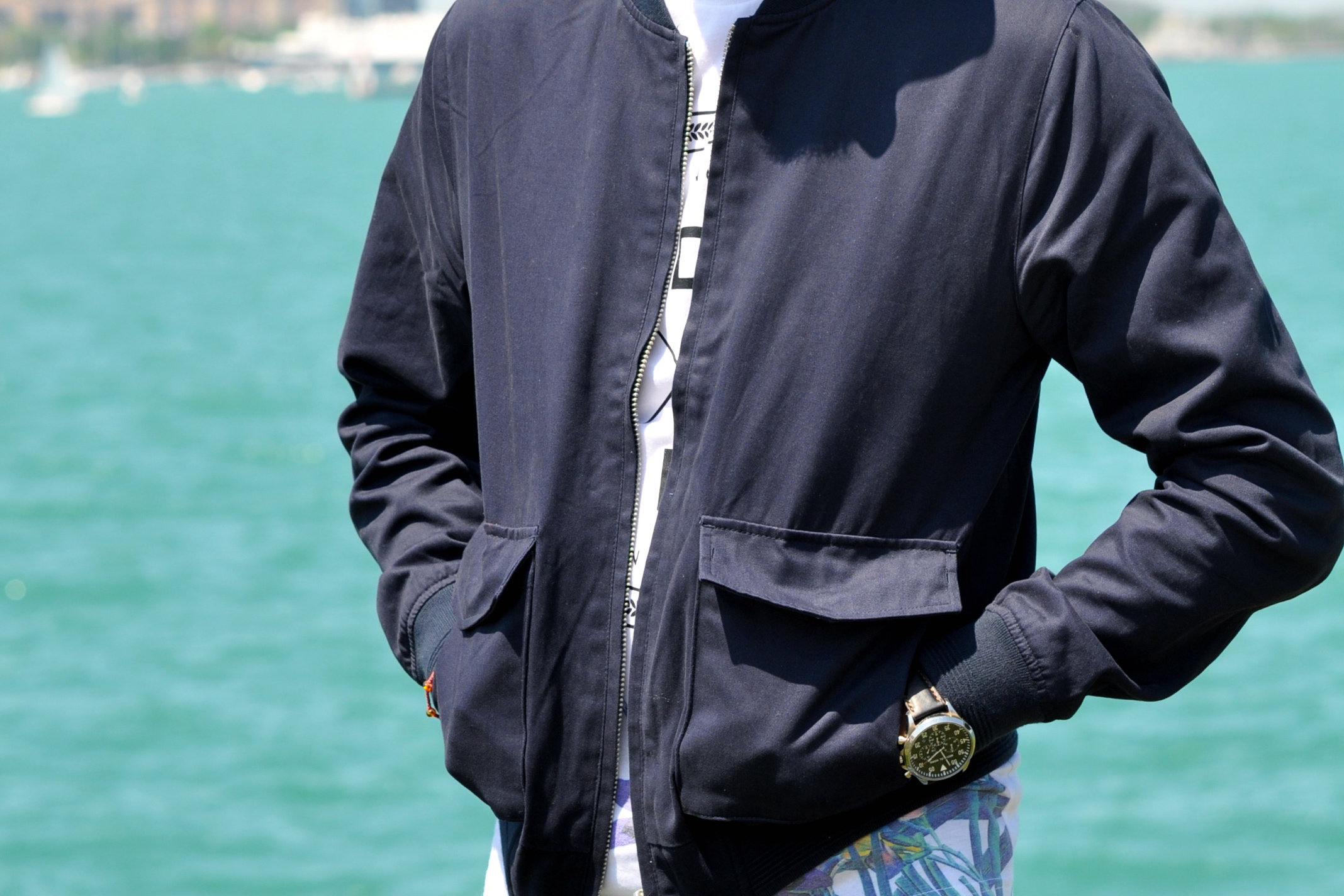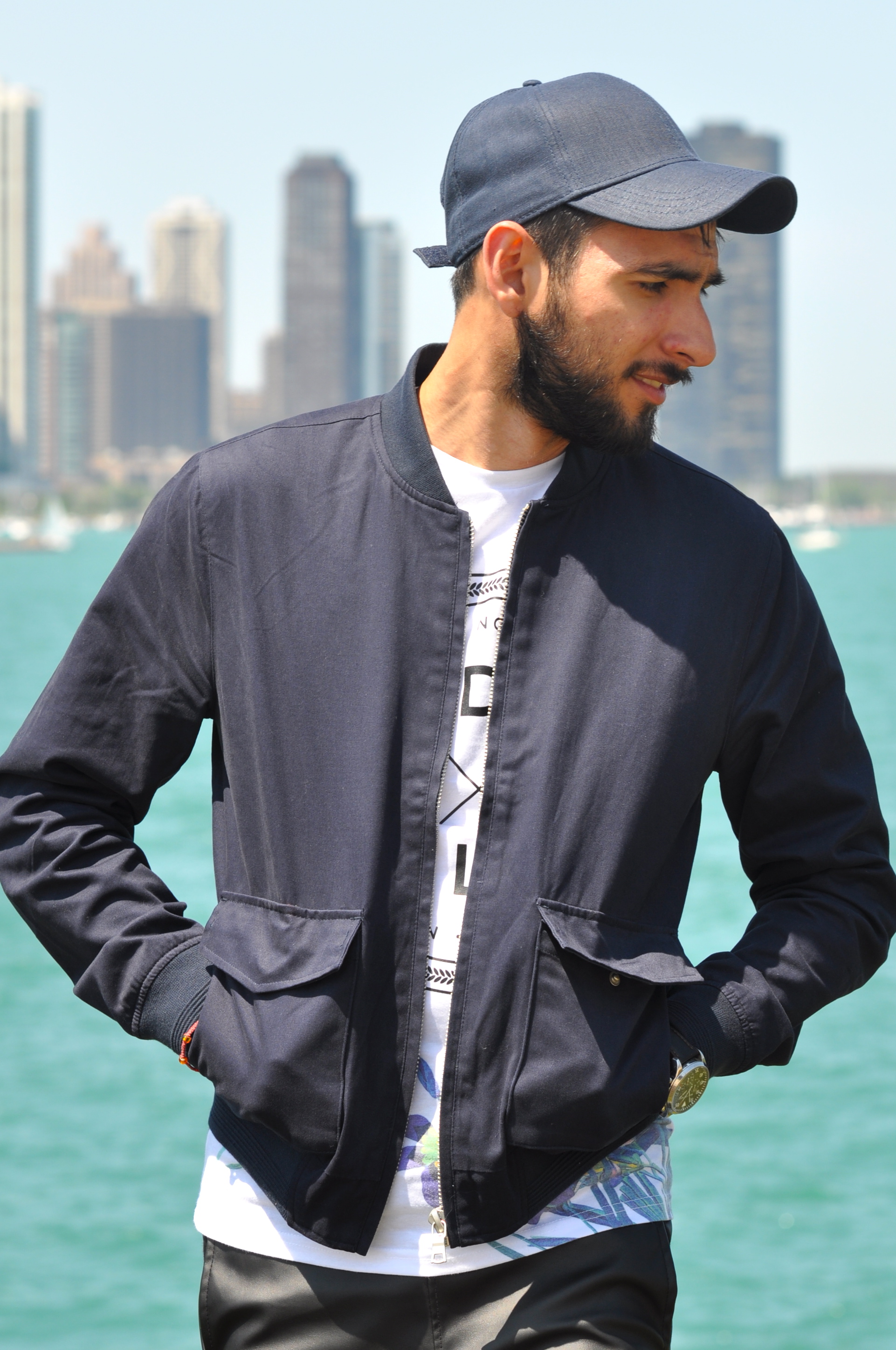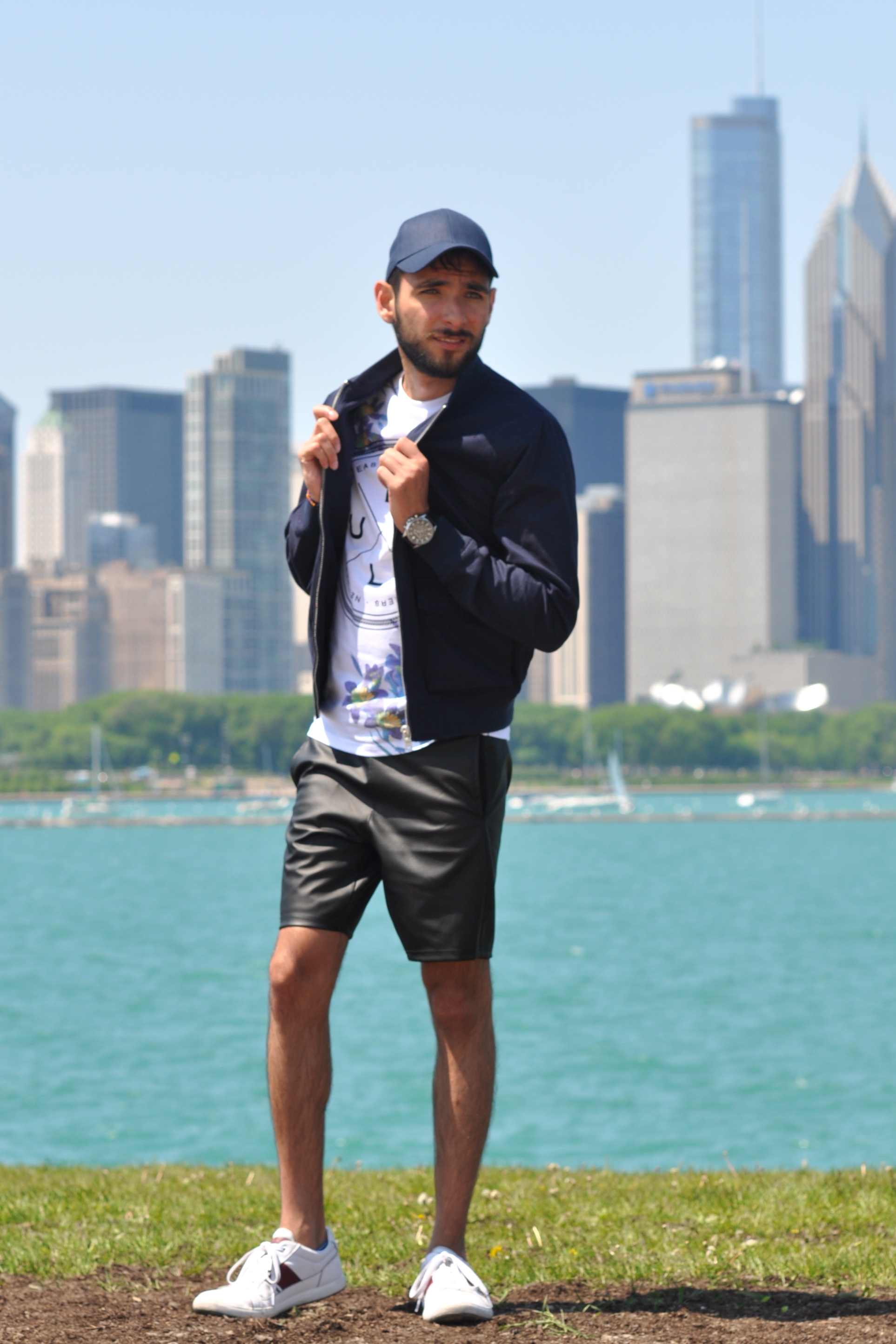 Another really positive thing about our visit to Chicago was that the weather was gorgeous while we were there. The Midwest is known for having brutally cold winters and humid, hot summers, but in late spring the weather is just perfect. This allowed me to strut around the Windy City in shorts and t-shirts, which brings me to today’s outfit. I had been looking for a bomber jacket for a while, since they are super ‘in’ this season, and I luckily found this navy blue bomber at Topman and immediately fell in love. It’s a little light for winter, but it’s perfect for both spring and fall, and even summer sometimes which can get a little chilly at night. I wore this with a nice pair of faux leather shorts, also from Topman, which just gave the whole look a really edgy vibe, along with a navy hat and white sneakers. We shot these photos at beautiful Lake Michigan right by the Adler Planetarium, which has an amazing view of the Chicago skyline in the back. What do you guys think? Ready to add the bomber jacket to your springwear? I want to thank my friend Valeria for taking these photos and for being the best wedding companion I could have asked for.