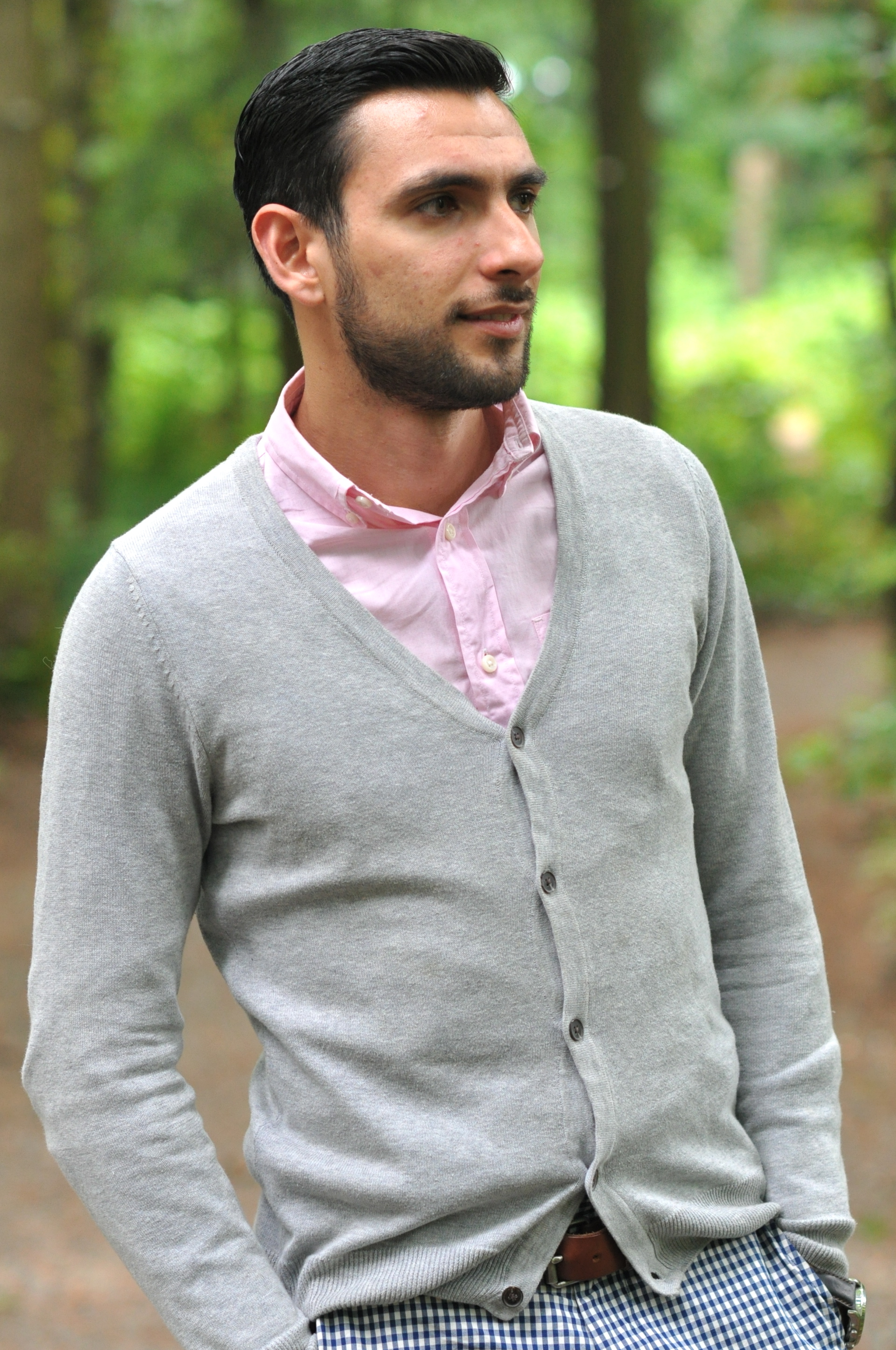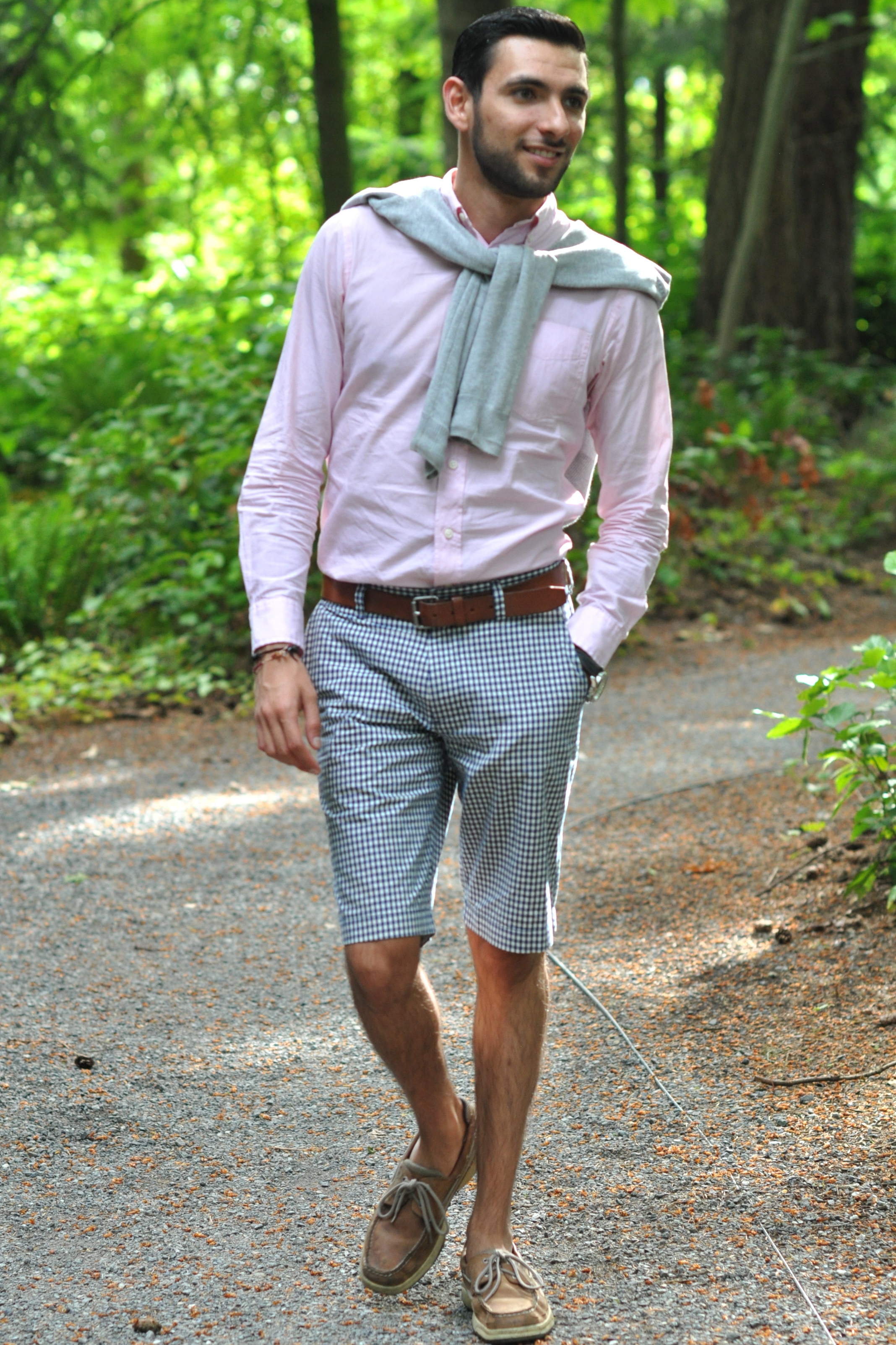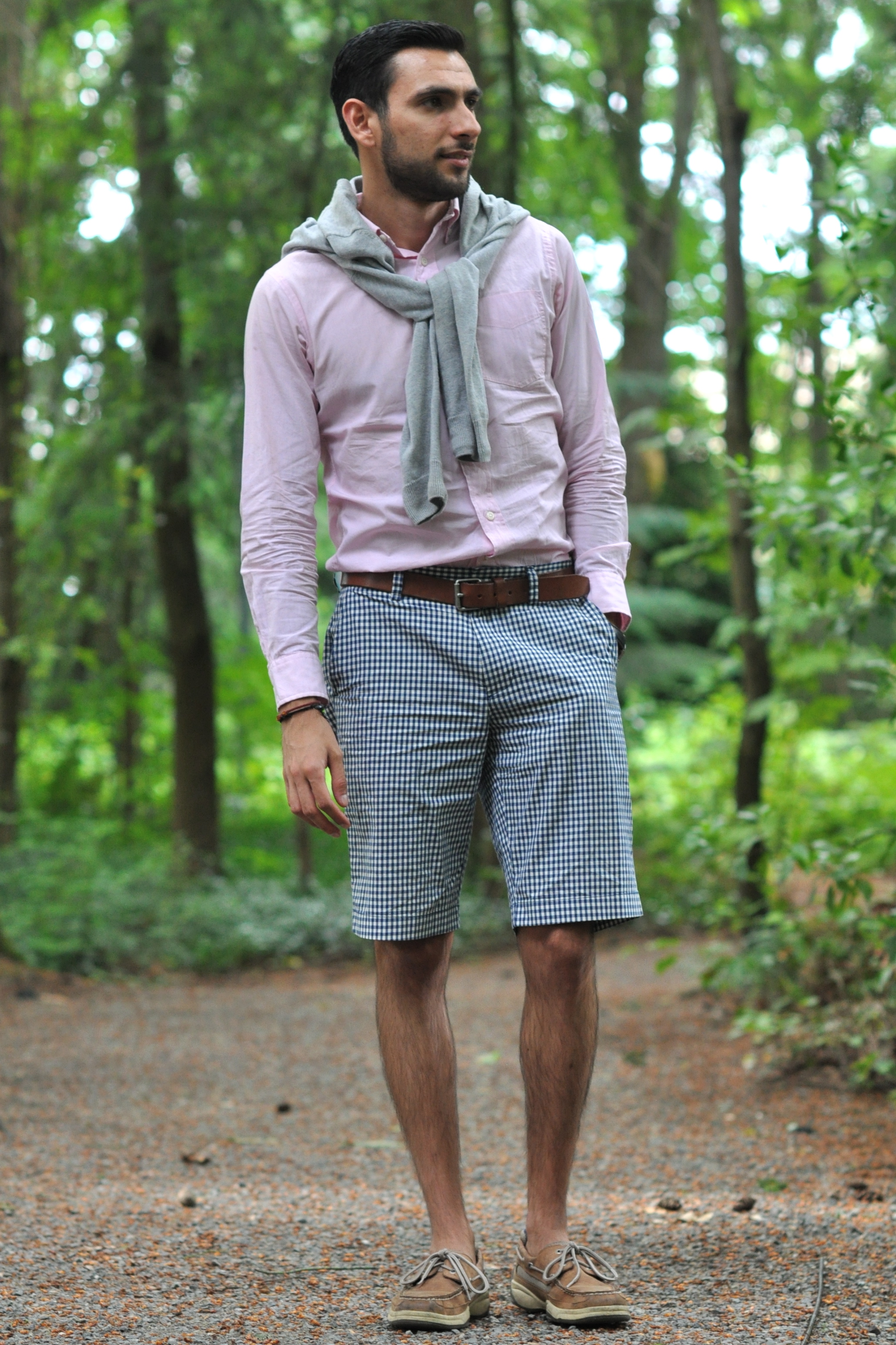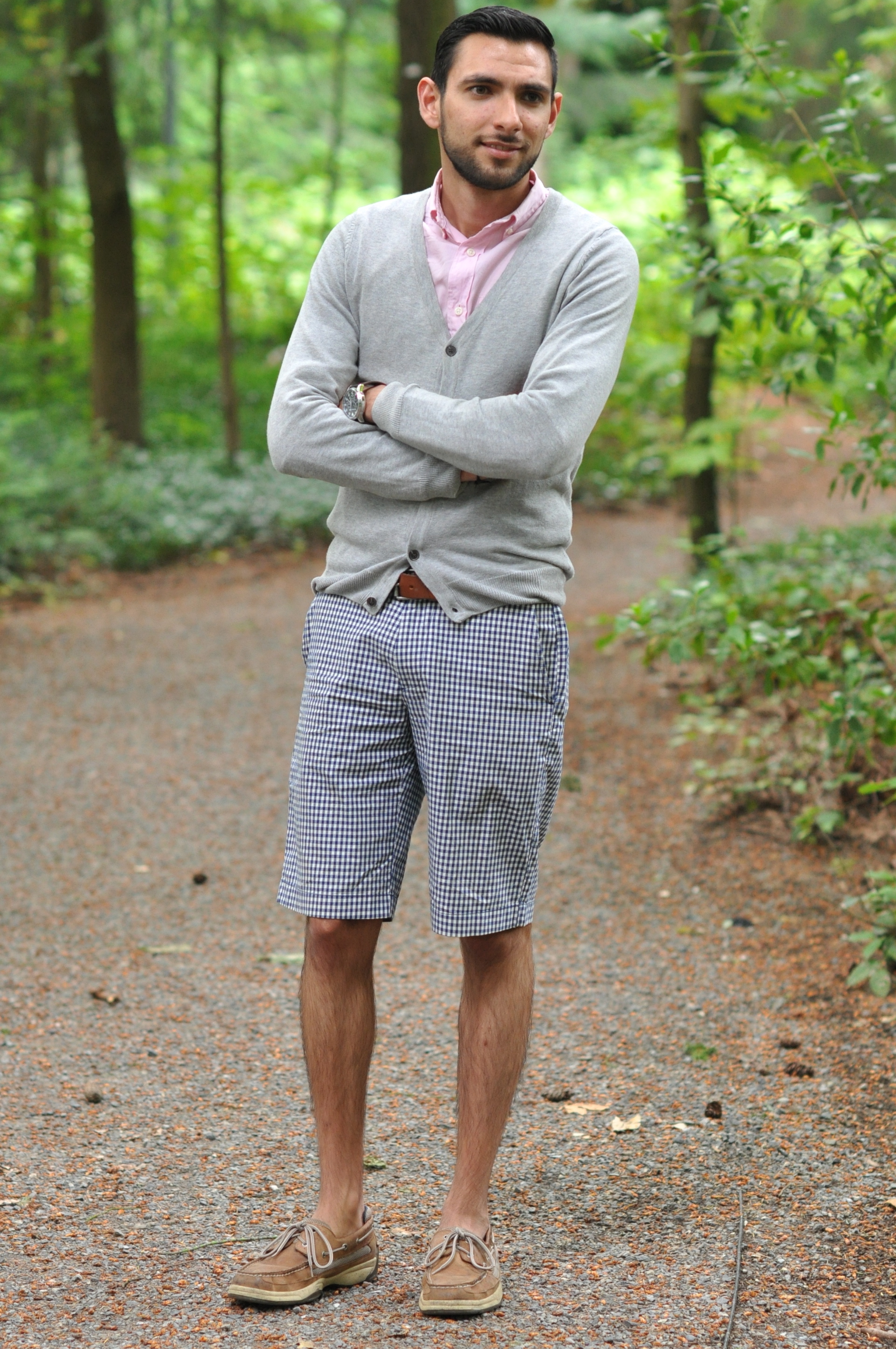 Pink button-down Club Monaco (Similar by Brooks Brothers), Checkered plaid Bermuda shorts J. Crew (Similar by E. Tautz), Light gray cardigan H&M (Similar by Aspesi), Belt Club Monaco, Boat shoes Sperry Topsider