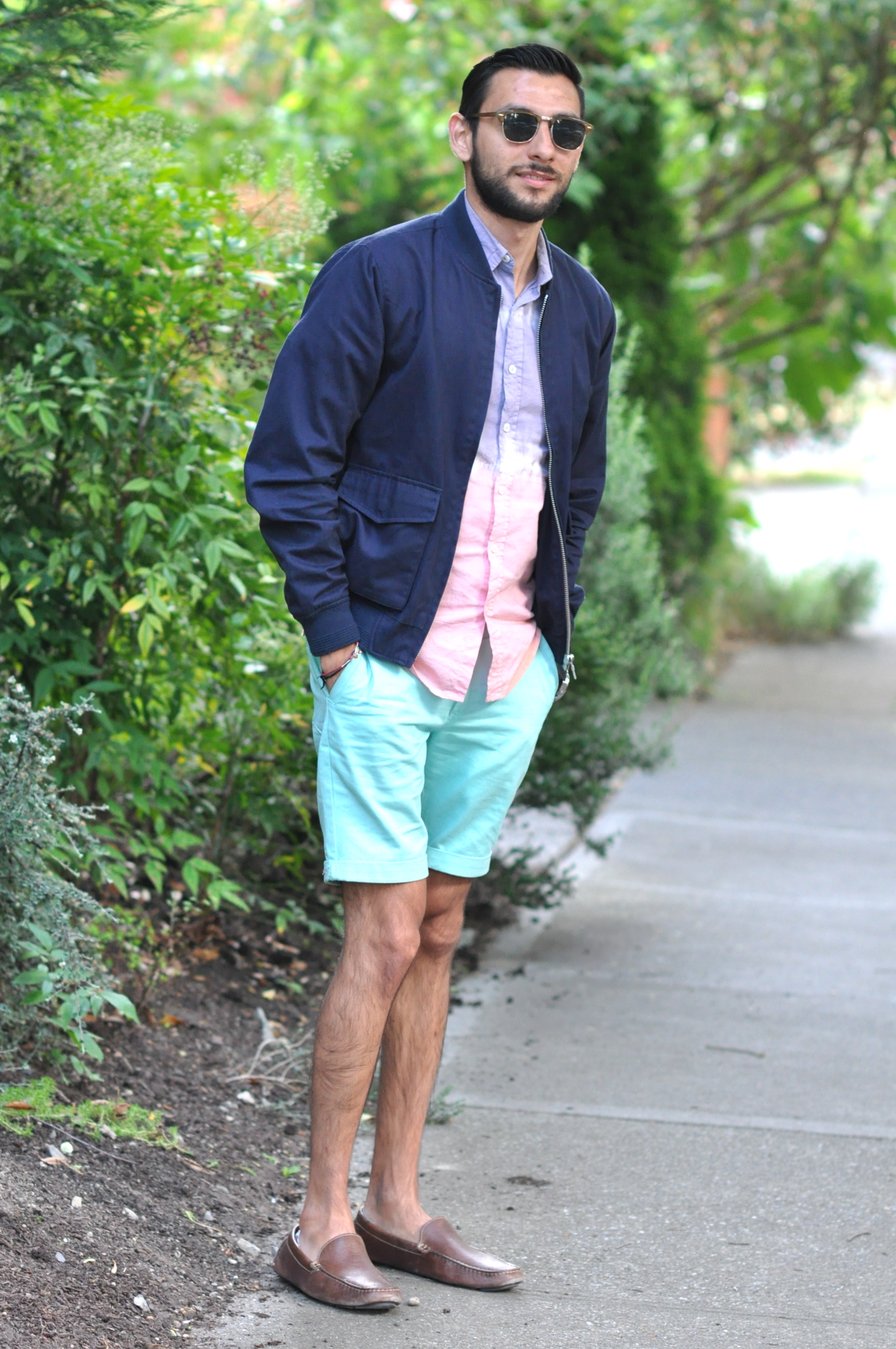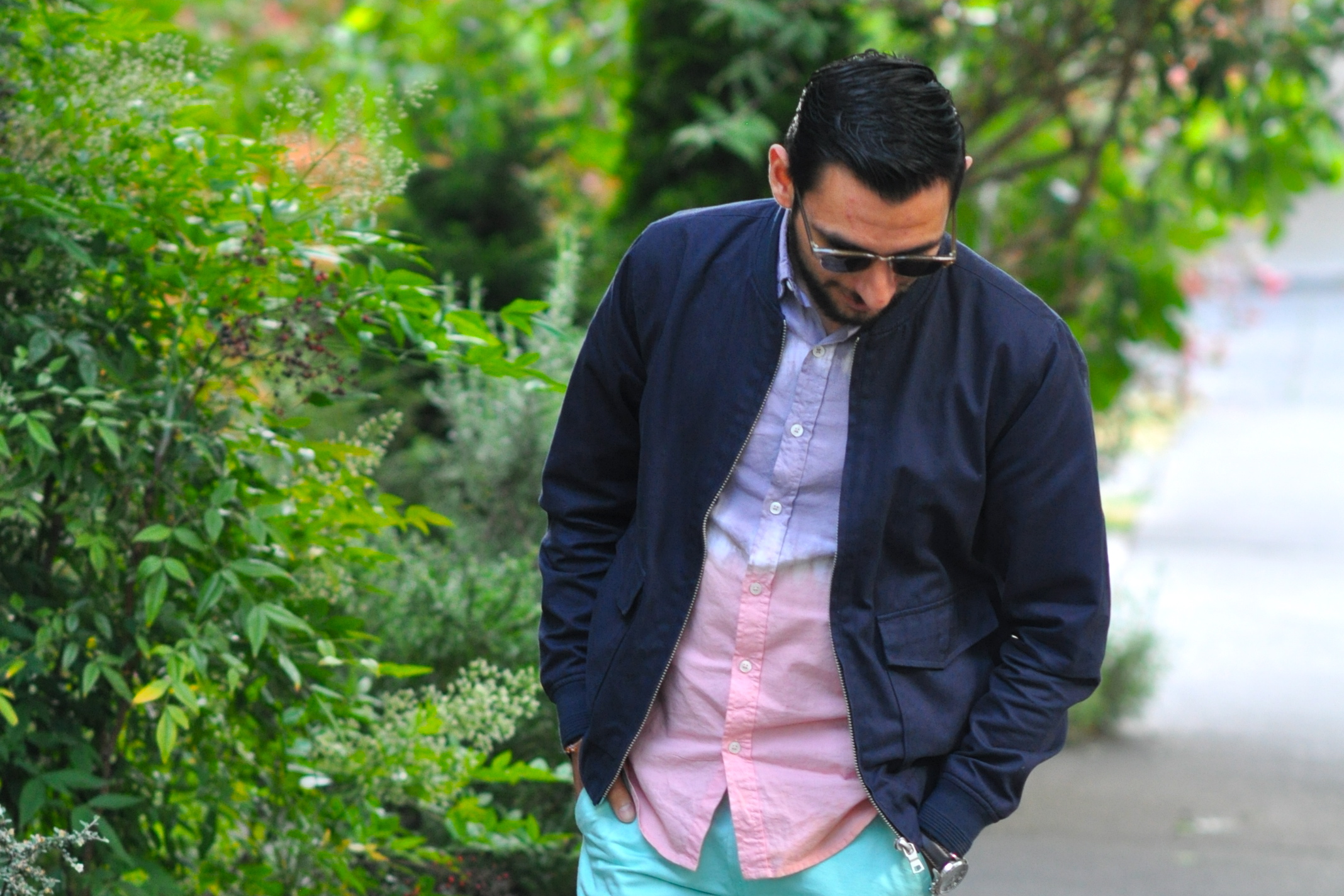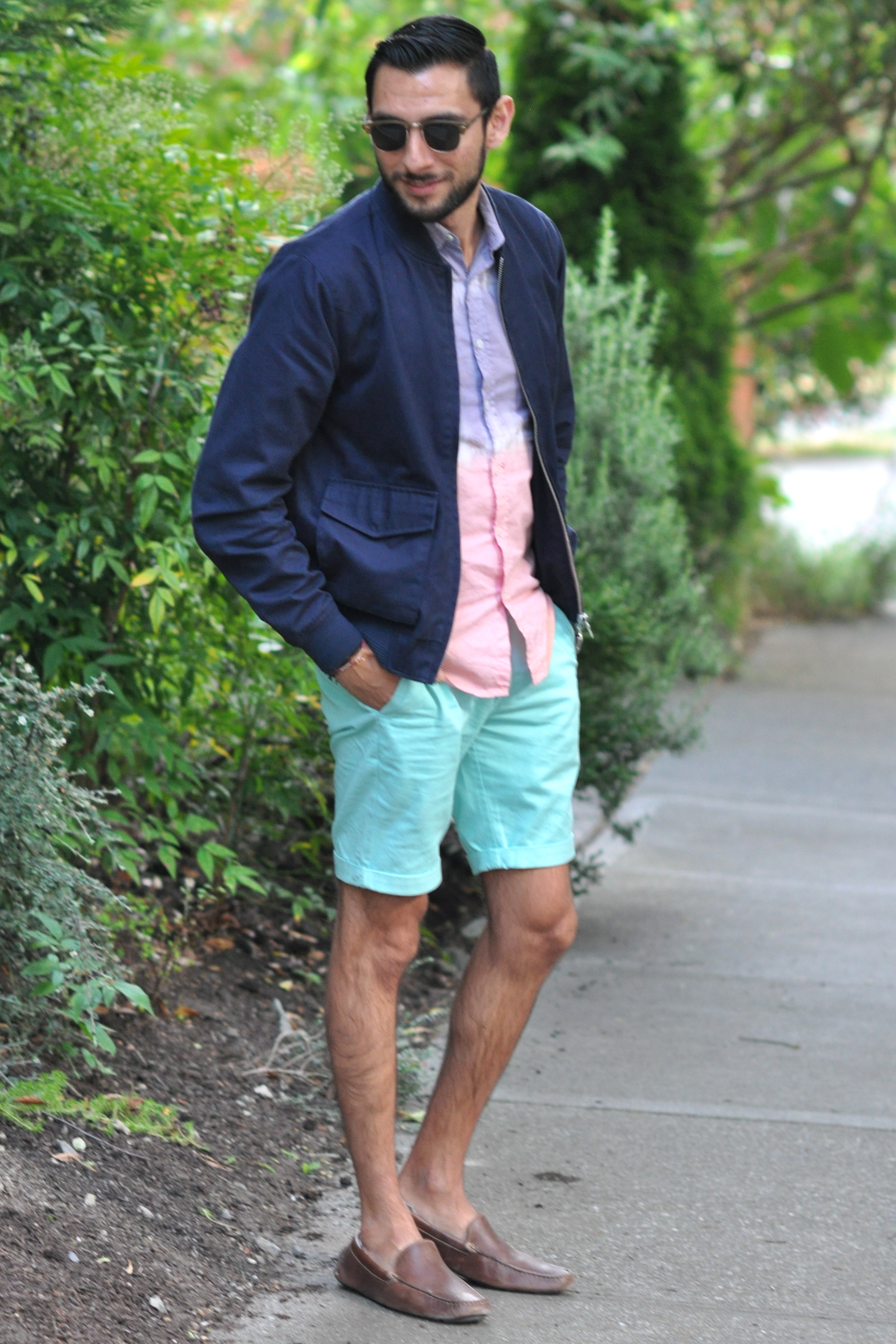 Navy blue bomber jacket Topman, Purple-to-pink watercolor shirt Topman (Similar by Vince Camuto), Mint shorts Topman, Leather Lugano loafers 1901 by Nordstrom, Shades Topman
