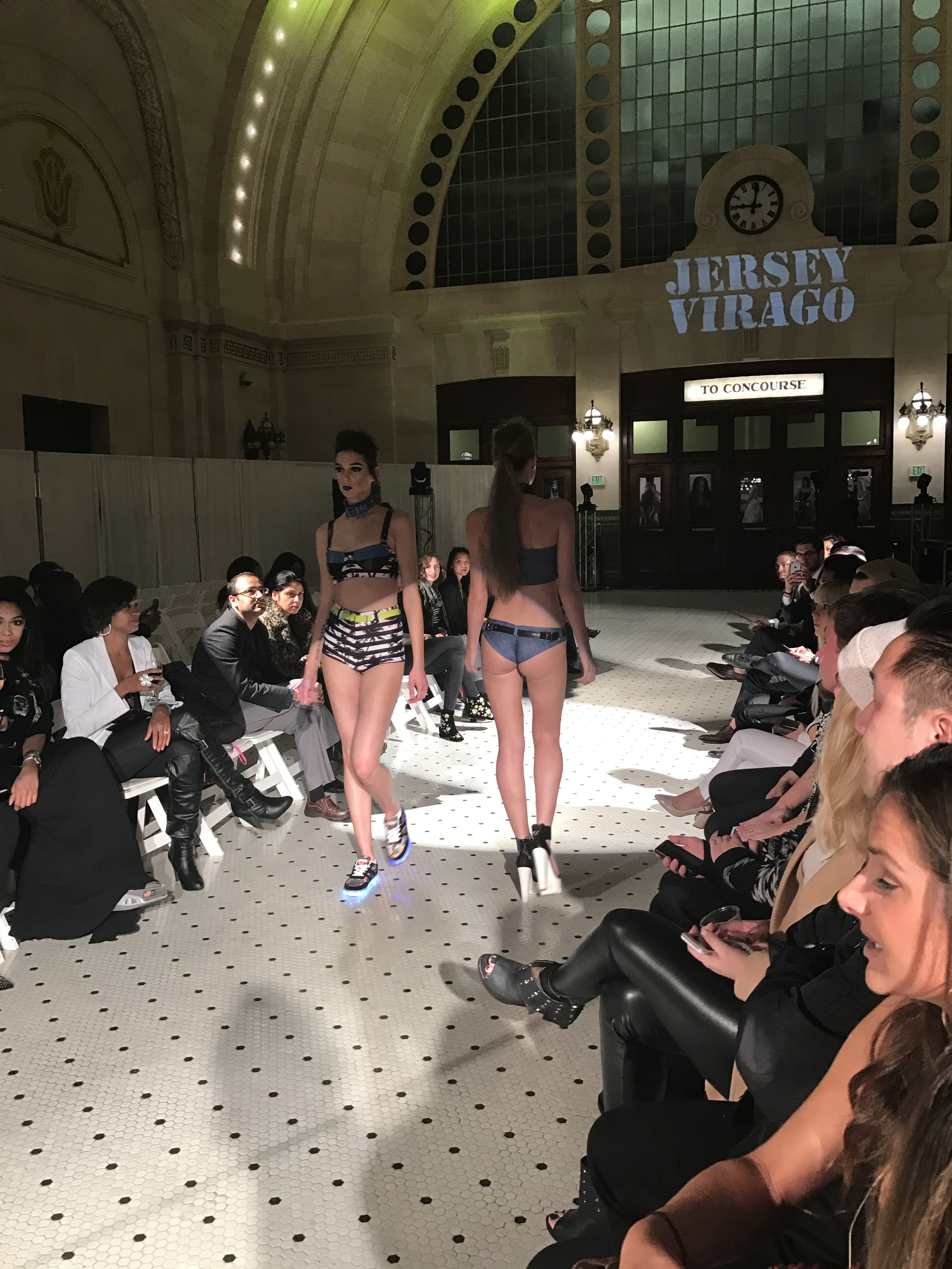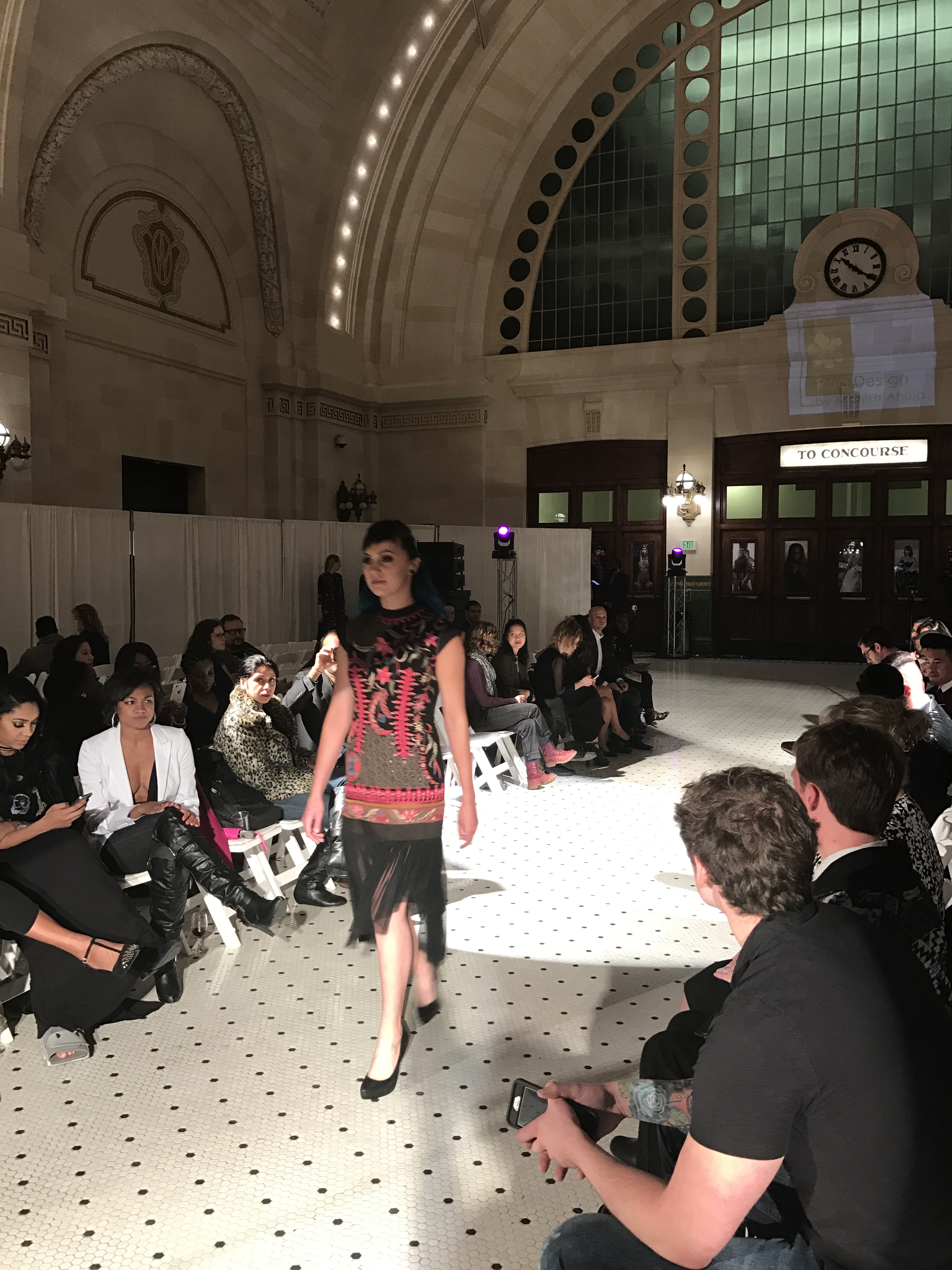 Todo comenzó la noche del viernes en la histórica central de trenes en Seattle, la cual fue convertida por completo en un lugar digno para un show de moda ready-to-wear. La artista local de Seattle Shaprice nos engalanó con un número musical salido directo de su nuevo disco, lo cual hizo que en ciertas partes pareciera más un concierto que un evento de moda. Después de tan impresionante entrada, el espectáculo más esperado de la noche comenzó con el primero de nueve diseñadores que presentarían su trabajo: Tristen Mickelson. El joven diseñador, a sus 17 años de edad, está revolucionando el mundo de la moda con su estética muy particular y sus diseños futuristas y arriesgados. Una blusa grande con hombreras puntiagudas en piel negra, sudaderas y camisetas al estilo Star Wars y camisetas largas y de gran tamaño junto con chamarras tipo camo son algunas de las piezas que el talentoso diseñador presentó. Esta fue una excelente forma de empezar el show y no puedo esperar por ver su más reciente trabajo próximamemnte. Después le siguió la aclamada diseñadora de ropa casual para mujer Nebulae, quien presentó figuras geométricas y tonos neutros en algunos de sus vestidos, junto con unos cortes asimétricos en estampados muy intersantes. Realmente me gustó su forma de manejar el espacio y la proporción con materiales tan interesantes, especialmente su uso del espacio negativo.