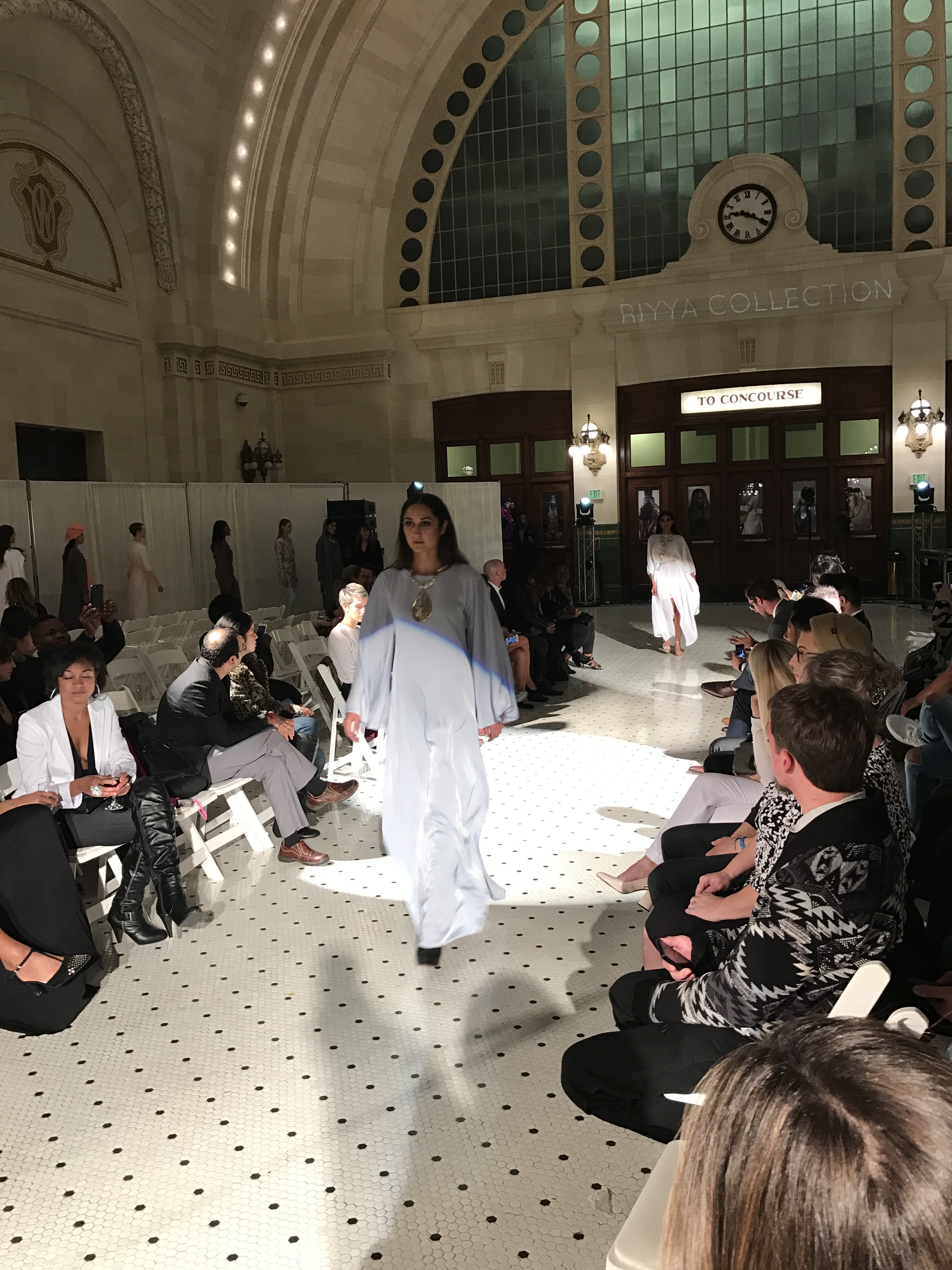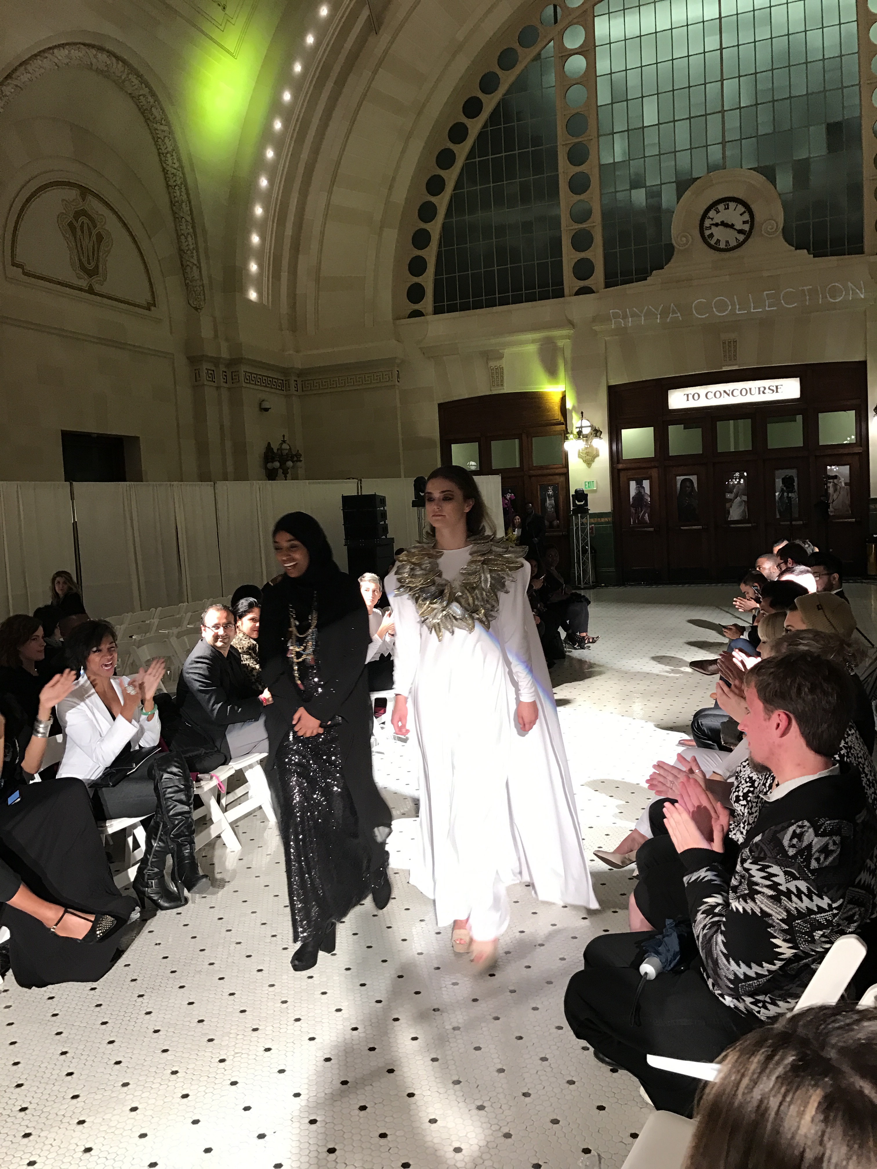 Followed by Nebulae, came Jersey Virago, whose fun and exotic take on women’s swimwear really made all the people in the crowd cheer and smile as her models walked down the runway. The styling here was incredible, with the jewelry, shoes, and accessories really highlighting the main pieces. Next we had Gustavo Apiti Couture present us his dapper, really polished menswear design, which included both suits and informal clothing. All of his work seemed to be very detail-oriented, which I love, and here once again we can see the use of accessories to raise the design to the next level. Last before the 30-minute intermission was Seattle-based Riyya Collection, whose mix of Middle Eastern culture with westernized, modern-looking gowns made us all gasp and cheer with applause as the young designer walked the runway next to her statement piece. I really like when designers try to break the boundaries of what’s commonly accepted in the world of fashion, and this designer achieved that goal really well.
