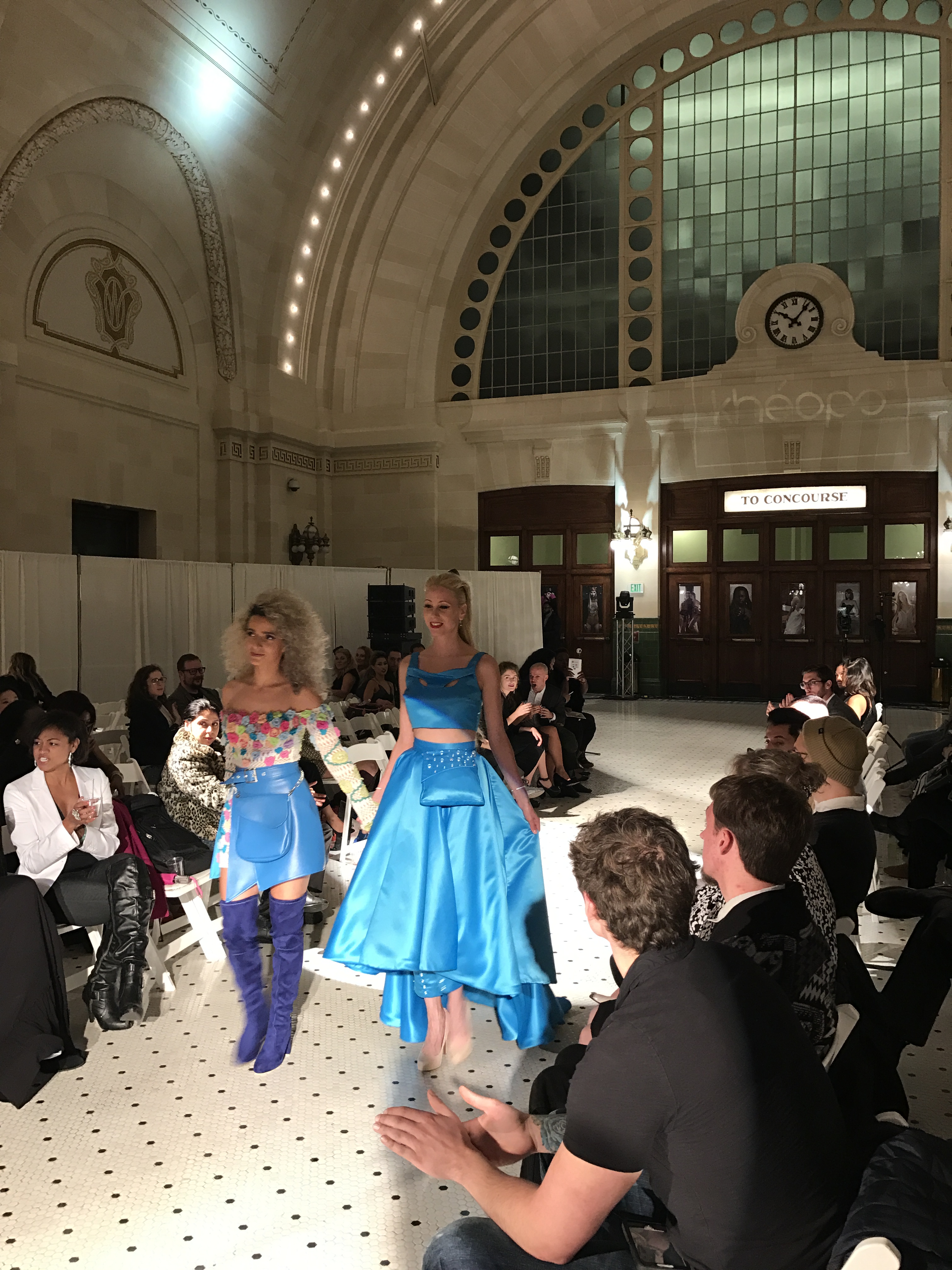 It all started Friday night in Seattle’s historic train station, which was completely revamped into a fashion venue to host a ready-to-wear runway show. Seattle local artist Shaprice shook the audience with a haunting performance of her latest new record, which at some point felt more like a concert than a fashion show. After the incredible opening, the show started off with the first of nine distinguished designers: Tristen Mickelson. This young designer, at just 17 years old, is renovating the world of fashion with his unique aesthetic and his bold, futuristic designs. A large, pointed sleeve blouse in black leather, Star Wars-like hoodies and shirts, and long, oversized tees and camo jackets, were some of the pieces the talented designer presented. This was a great way to start the show and I can’t wait to see more of his work later this year. Next came acclaimed women ready-to-wear designer Nebulae, who presented neutral tones with geometric designs on her dresses and some very interesting asymmetrical cuts in beautiful prints. I really liked her way of playing with space and proportion in such interesting materials, especially with the negative space.