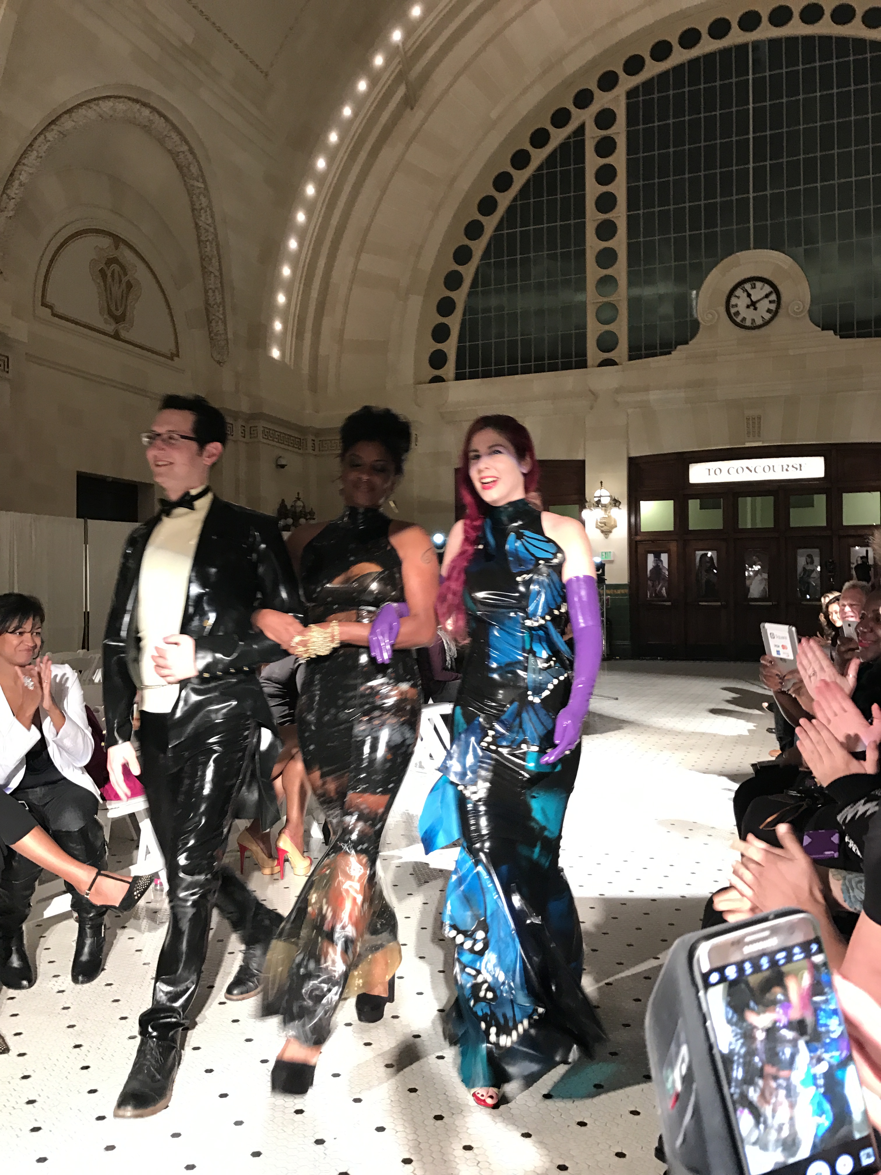 El siguiente en presentar fue el aclamado diseñador Daniel Hernández, ganador del premio al Diseñador del Año en New York Fashion Week, y compatriota latino presentando su colección homónima por primera vez en la ciudad de Seattle. Daniel es bien conocido por su diseño extremadamente sofisticado, su uso de piel negra, accesorios metálicos, y por empoderar a la mujer del día a día con sus eclécticos diseños, que bien podría utilizar para caminar por las calles de Nueva York o París. No me sorprendió que esta fuera mi colección favorita de la noche y culminó nada más ni nada menos que con la mismísima CEO Teresa Springer vistiendo una de las creaciones de Daniel, la cual llevaba portando durante toda la noche y fue una muy grata sorpresa para todos. Finalmente, tocó el turno a Dawnamatrix, de Dawn Mostow, quien nos mostró los más lujosos diseños en látex que podríamos imaginar. Dawn es muy conocida en el mundo de la moda porque uno de sus diseños fue utilizado por Kylie Jenner en uno de sus famosos photoshoots, y me enteré esa noche que ahorita se encuentra trabajando con Beyoncé. Creo que a Beyoncé le va a venir de maravilla uno de estos diseños. Su gabardina en color blanco con adornos en estampado de leopardo es una obra maestra que seguramente le serviría bien a cualquiera en el clima de Seattle en todo momento.
