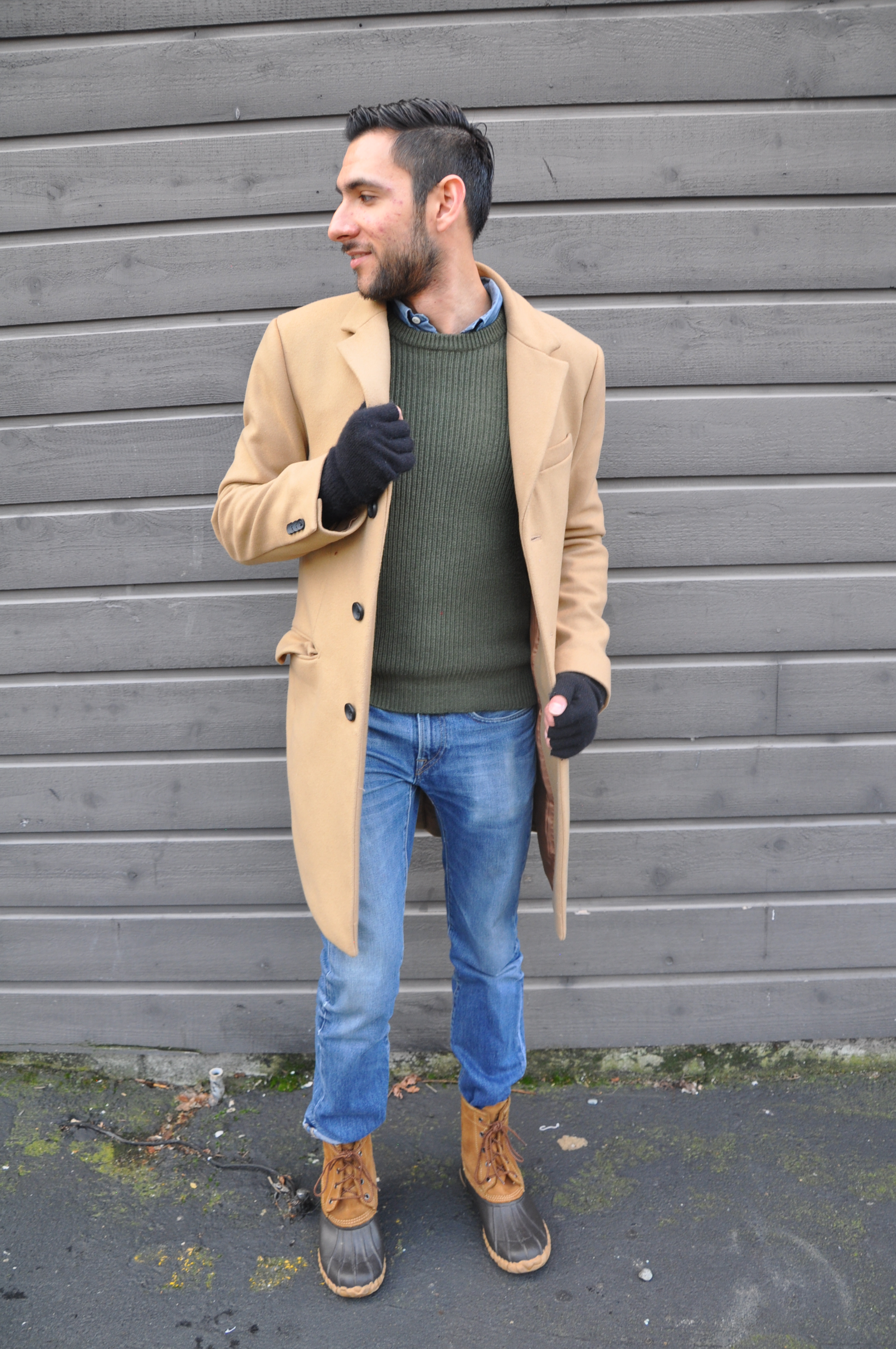 Camel coat Club Monaco, Denim shirt Club Monaco, Knit sweater J. Crew, Jeans Levi’s by Club Monaco, Fingerless cashmere gloves Club Monaco (Similar by Saks Fifth Avenue), Duck boots Sorel by J. Crew