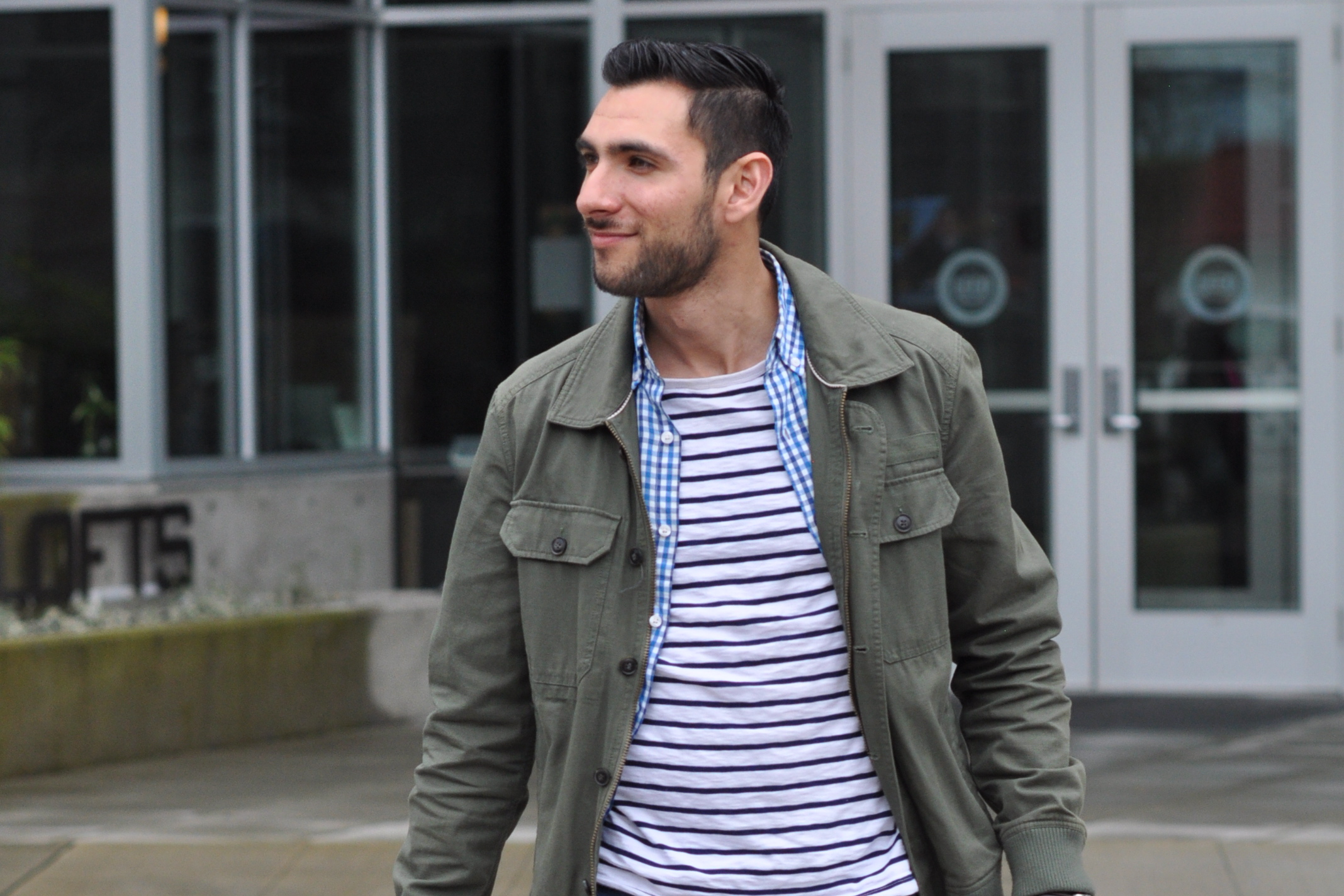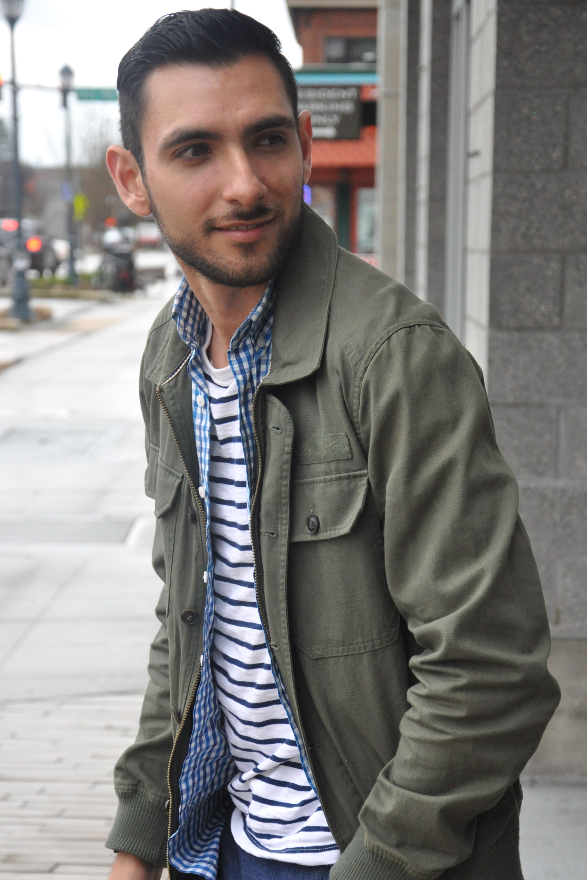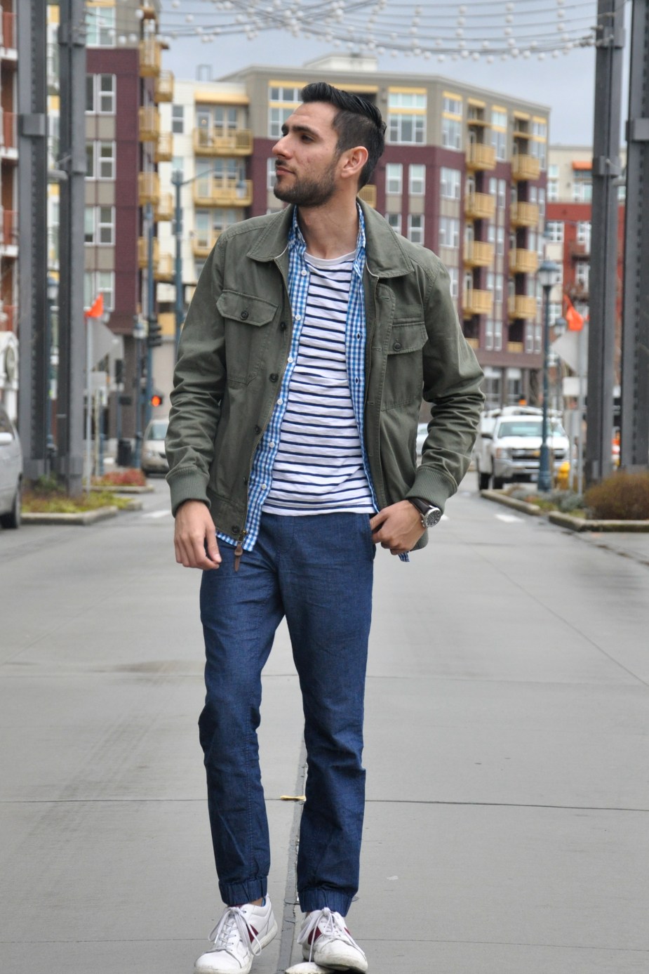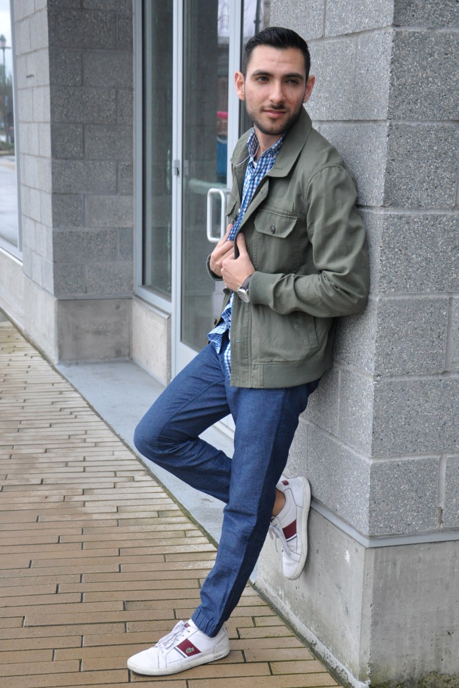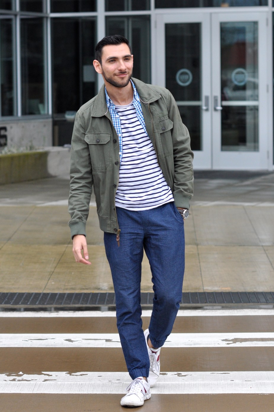 Olive green utility jacket 21 Men (Similar also by 21 Men), Baby blue gingham-square button-down J. Crew (Similar also by J. Crew), Cotton deck-striped t-shirt J. Crew, Denim joggers J. Crew (Similar by Zanerobe), Sneakers Lacoste (Similar also by Lacoste)