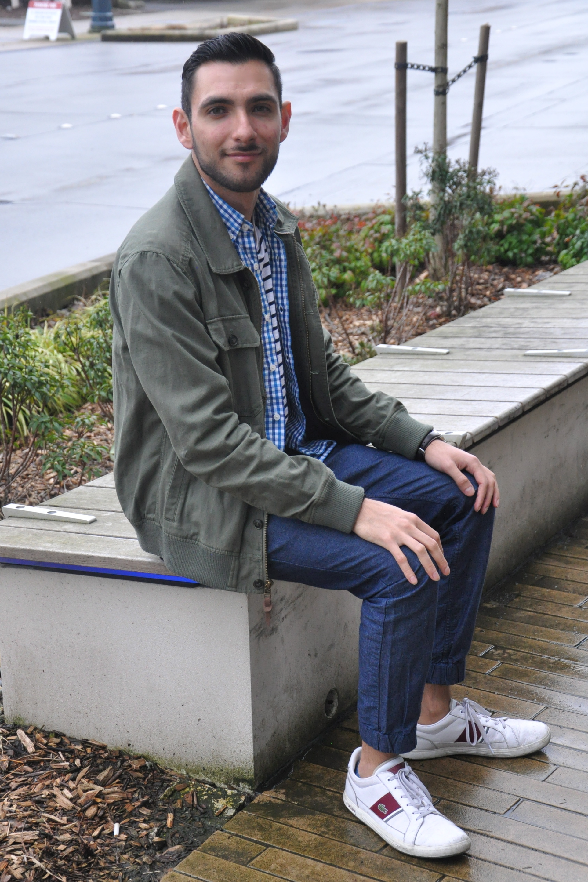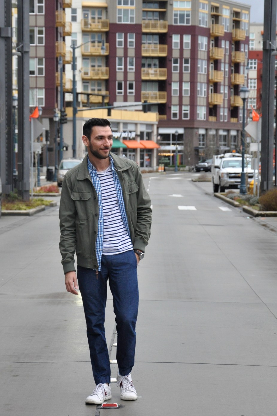 For my reunion with Kim, I decided to wear a very fresh, casual combination of denim joggers with a 3-layer mix of cotton deck-striped t-shirt, a gingham-square baby blue button-down, all of these from J. Crew, and an olive green utility jacket from 21 Men. I’m so happy that it feels like spring already because I could finally leave the coat back at home, and this outfit works perfectly for the balmy 50-degree weather that we’ve had as of lately. For the shoes, I decided to go for my white Lacoste sneakers, and we shot some pics while walking on the streets of Redmond Town Center. What do you guys think? Are you as ready as I am for starting to ditch those heavy coats and bring out the lighter clothing? I want to thank Kim for these amazing photos and for having such a blast with me. I love you girl!