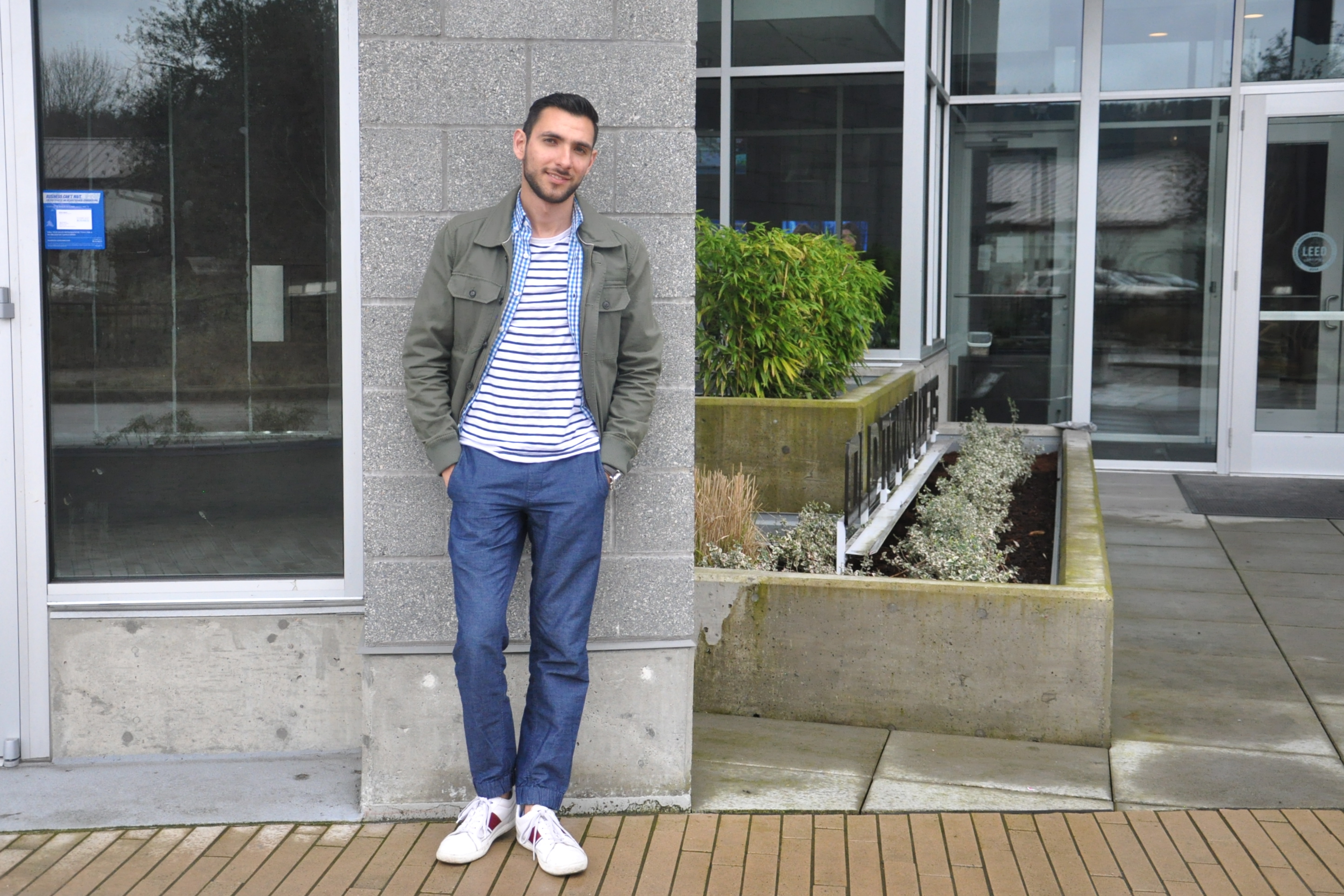 Para mi reunión con Kim, decidí ponerme una combinación muy casual y fresca de joggers de mezclilla con una mezcla de tres capas compuesta por una camiseta de marino en algodón, una camisa de cuadros celeste, todo esto de J. Crew, y una chamarra color verde de utilidad de 21 Men. Estoy muy contento de que ya se sienta como primavera porque al fin pude dejar el abrigo en la casa y siento que este outfit funciona a la perfección en el clima agradable de 10 grados que hemos tenido más recientemente. Para los zapatos, opté por usar mis tennis blancos Lacoste, y tomamos algunas fotos mientras caminaba por las calles de Redmond Town Center. ¿Qué opinan amigos? ¿Están tan listos como yo para dejar atrás las chamarras gruesas y los abrigos y sacar la ropa más ligera? Quisiera agradecerle a mi amiga Kim por estás increíbles fotos y por pasar un tiempo tan divertido conmigo. ¡Te quiero mucho!