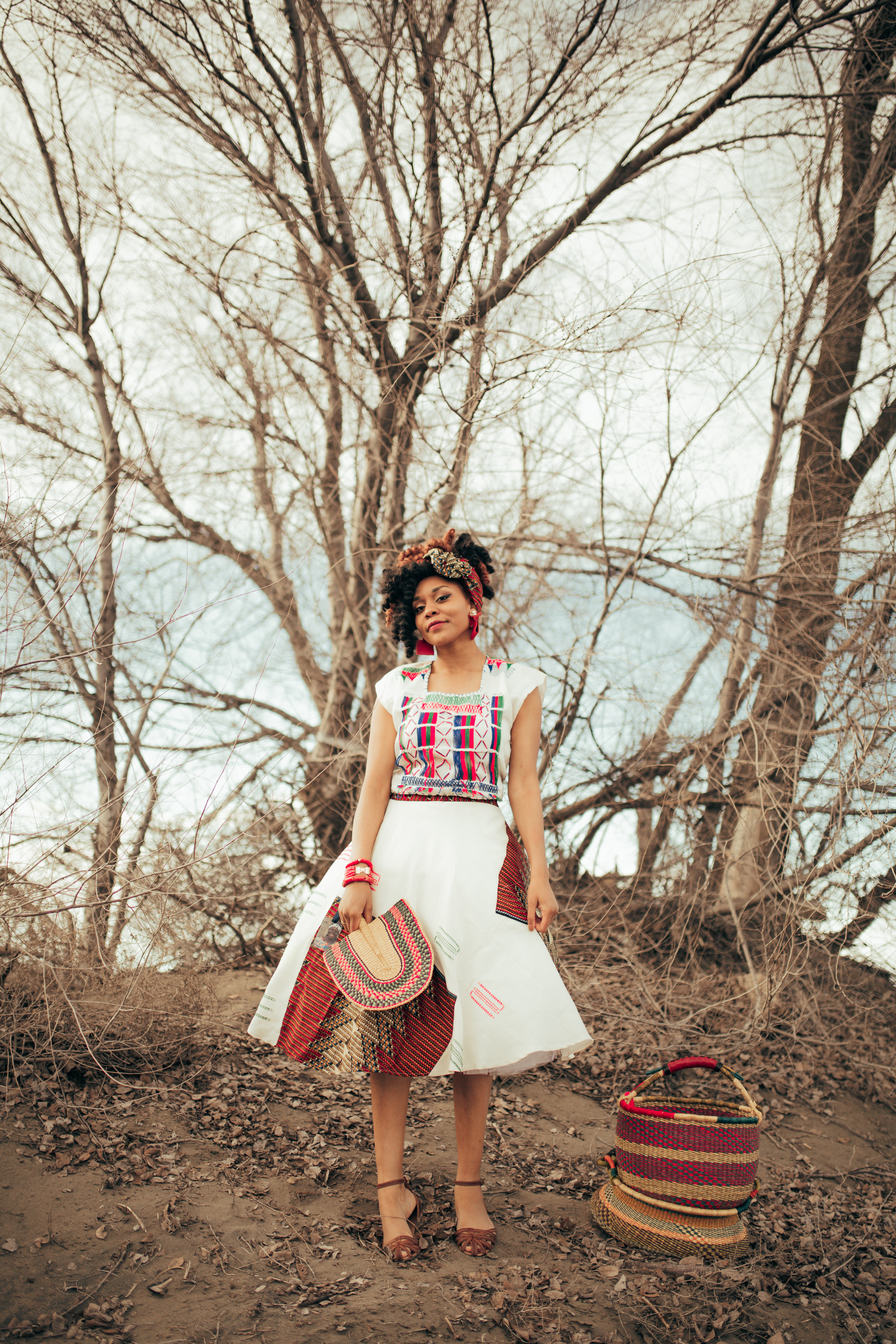 Hablemos ahora de los dos outfits diferentes que estamos presentando en este post. Aquí vemos a Nini vistiendo un top tradicional Fulani, con todos los colores que representan al bello arte Fulani. Para la parte de abajo, no me van a creer, pero la misma Nini creó esta falta que esta vistiendo con un poco de tela de Ankara y una base de tul. ¡Tenemos a una futura diseñadora! Además ella está dispuesta a compartir su trabajo, así que si se animan pueden pre-ordenar una de estas faldas llenando esta forma. Para completar el look, añadió unos brazaletes de piedra de otra cultura nigeriana, la de los habitantes del estado Edo, y se puso una magnífica tela en la cabeza para coronar sus rizos castaños. Estas telas son completamente auténticas y quedé anonadado al ver la falda que ella misma confeccionó. ¡Excelente trabajo Nini! Nini también eligió la gran mayoría de los artefactos que pueden ver decorando la escena en algunas de las fotos. Queríamos una paleta de colores que fuera similar pero que dieran un toque antiguo y, creo que esta decoración ayudó a transportarnos a una tierra lejana y en un período indeterminado.