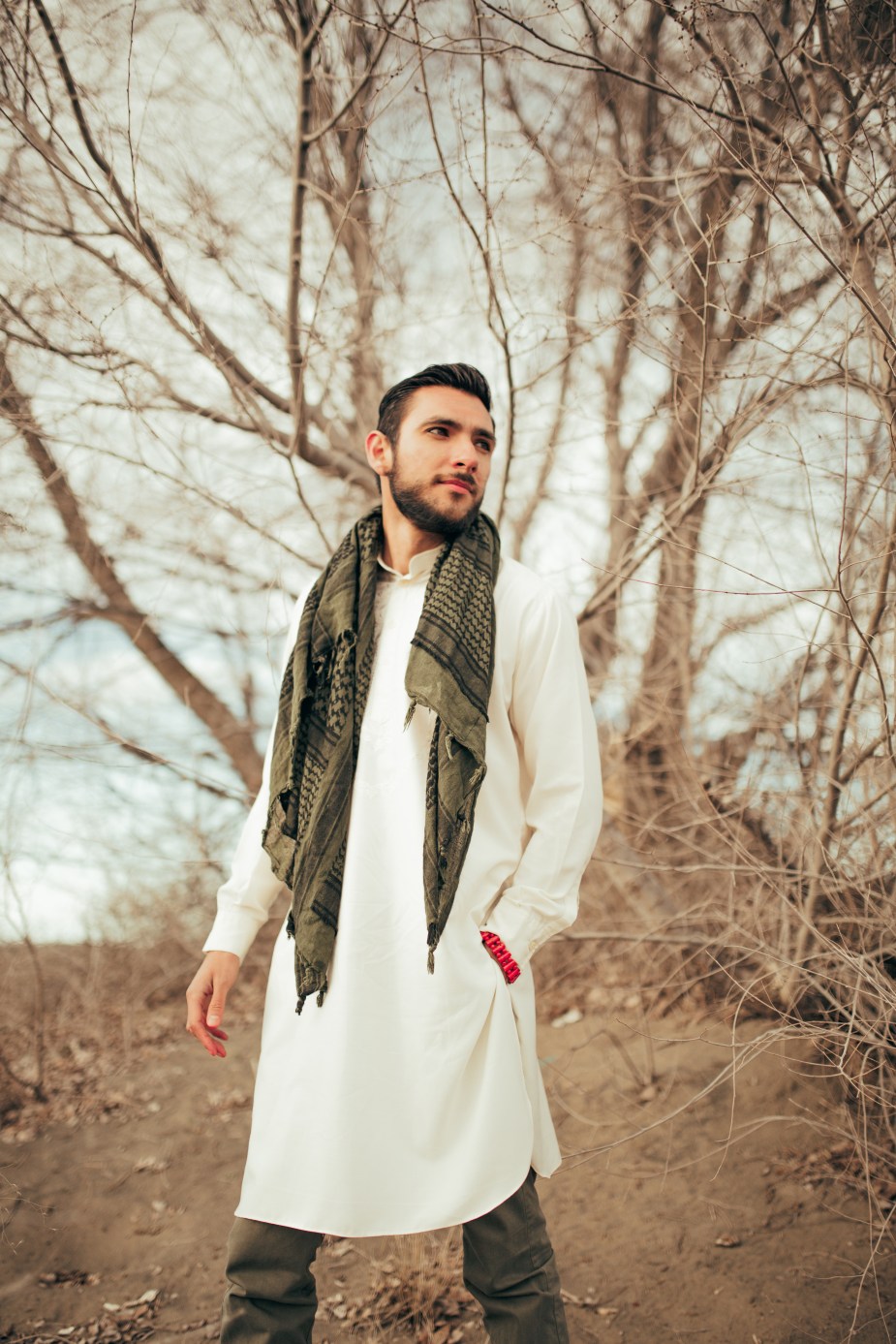 Hector – Kaftan Etsy (Similar by Helmut Lang), Olive green joggers The Rail by Nordstrom (Similar by Zanerobe), Boots Aldo (Similar also by Aldo), Jacket 21 Men, Accessories (scarf and bracelet) Goodwill