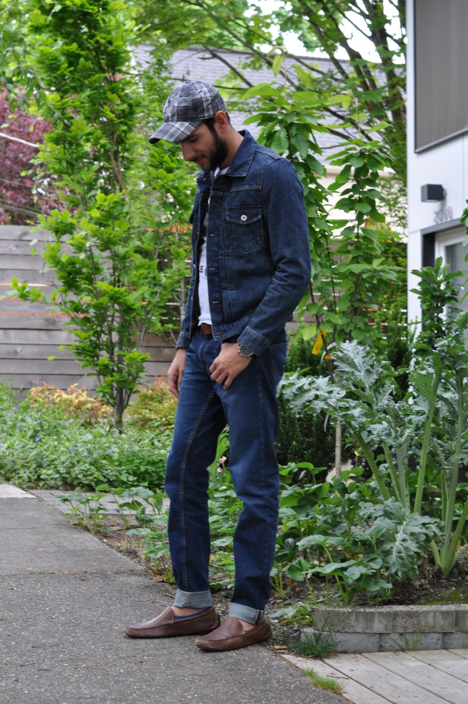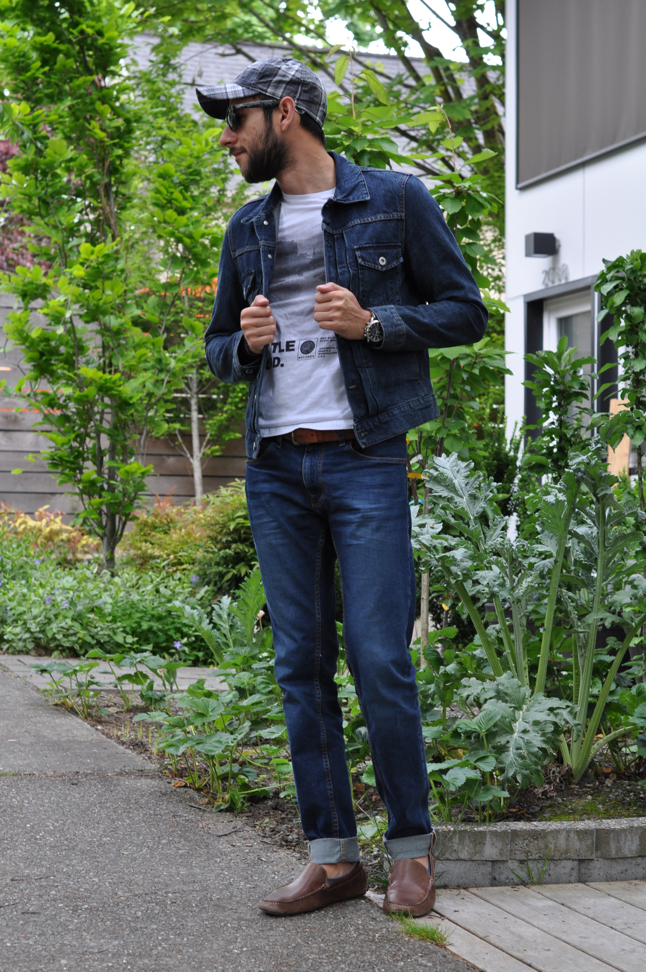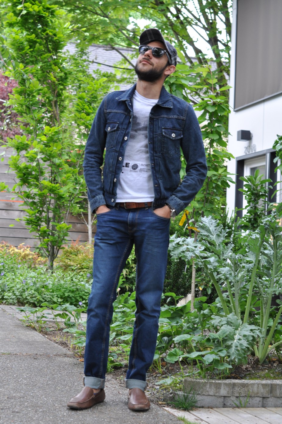 1975 slim fit denim jeans Zara, Raw denim jacket H&M (Similar also by H&M), Printed Seattle tee Topman (Similar also by Topman), Plaid dad hat American Eagle Outfitters (Similar also by American Eagle Outfitters), Brown moccasins 1501 from Nordstrom (Similar by G.H. Basse and Co. also from Nordstrom)