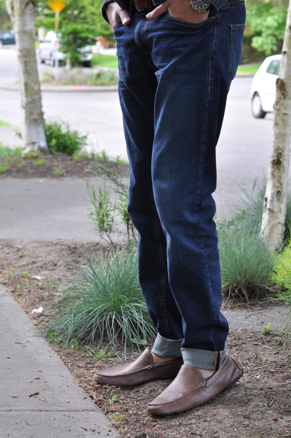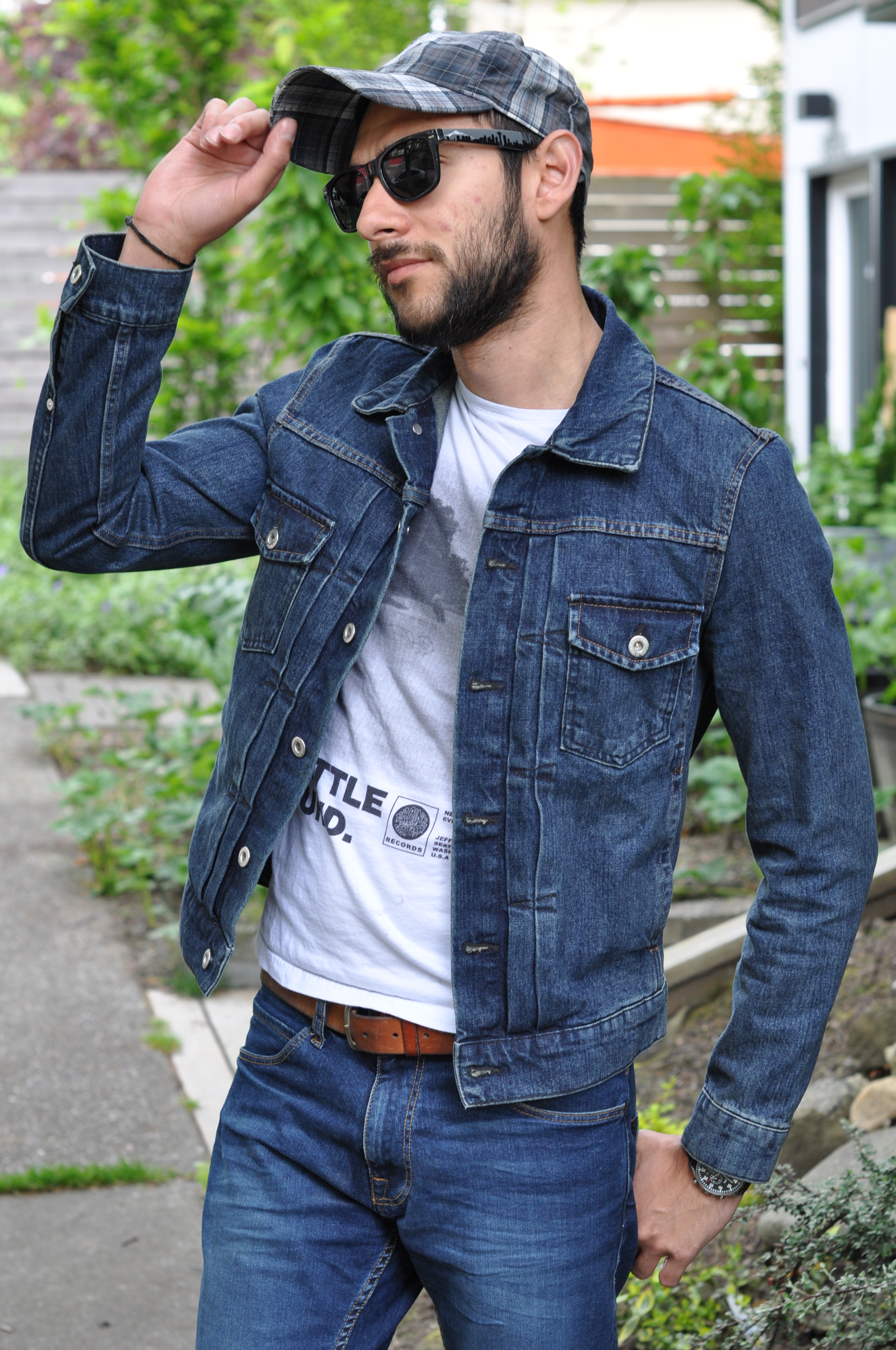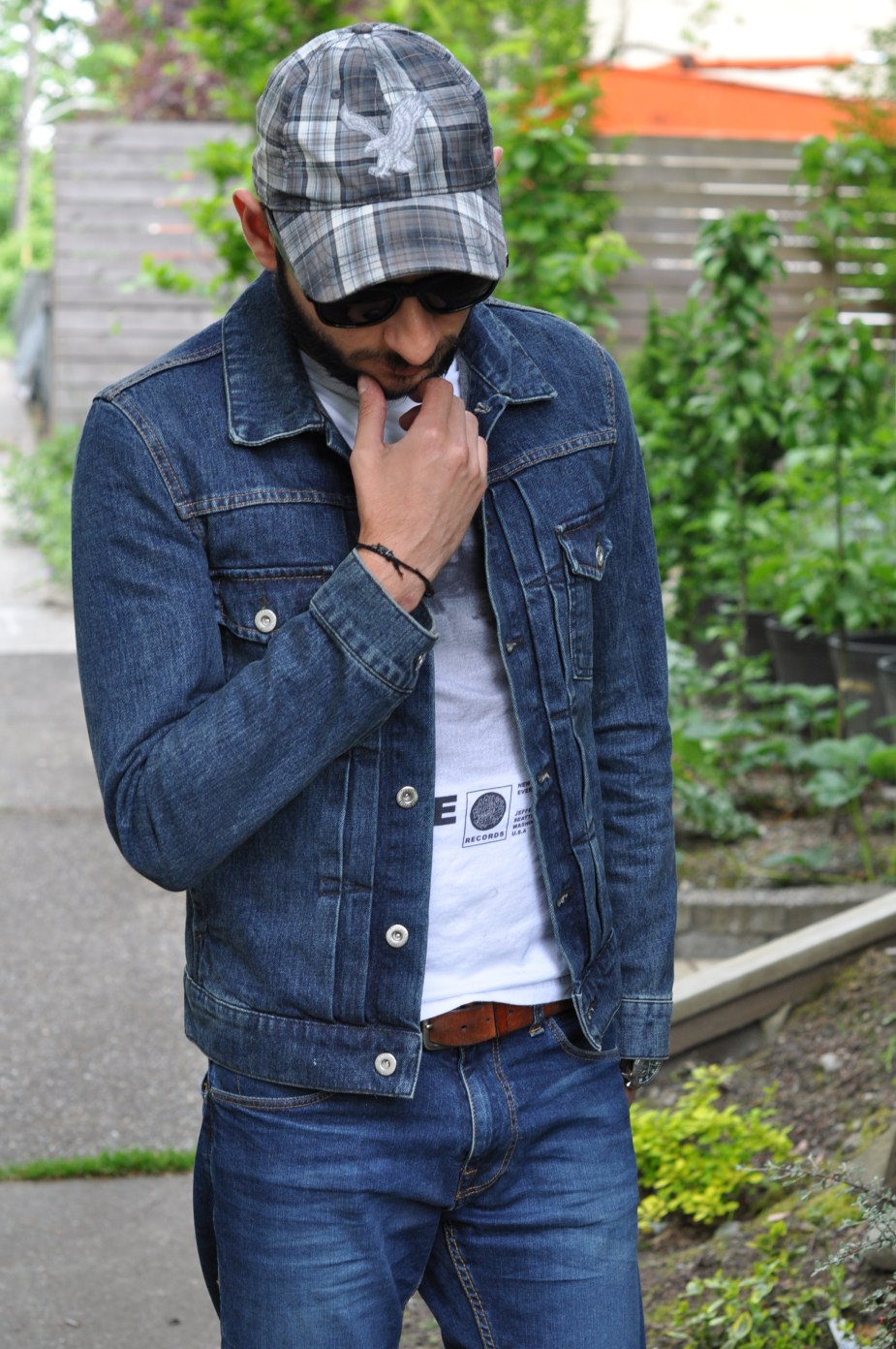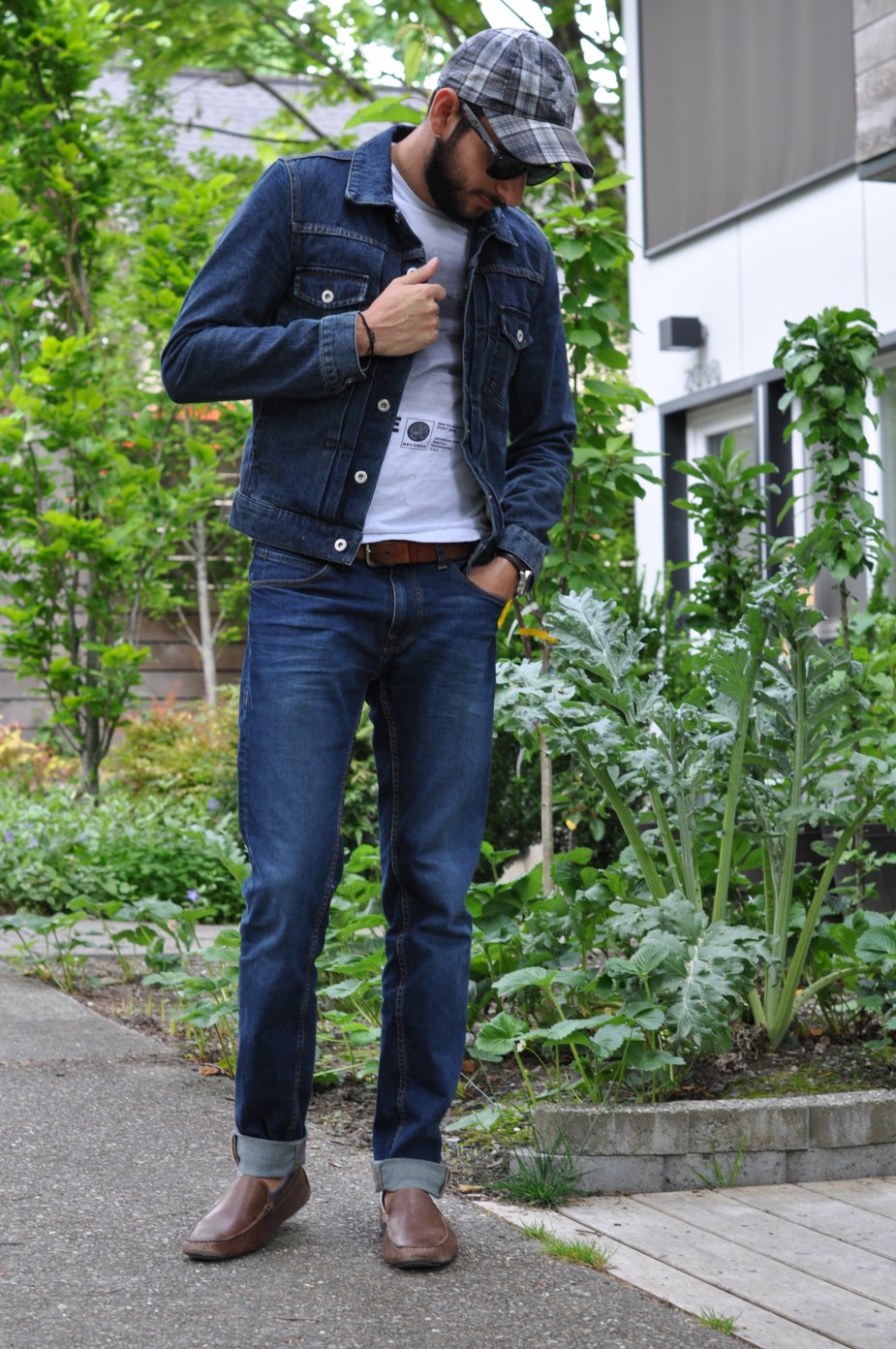 1975 slim fit denim jeans Zara, Raw denim jacket H&M (Similar also by H&M), Printed Seattle tee Topman (Similar also by Topman), Plaid dad hat American Eagle Outfitters (Similar also by American Eagle Outfitters), Brown moccasins 1501 from Nordstrom (Similar by G.H. Basse and Co. also from Nordstrom)