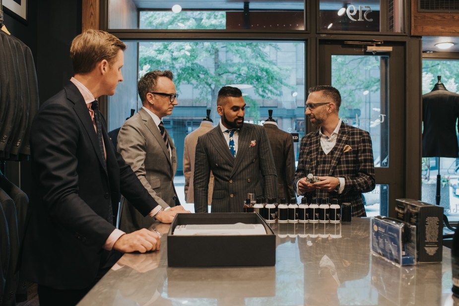 ¡Hola amigos! ¿Cómo están? La semana pasada, los Seattle Gents nos reunimos una vez más para una especial colaboración con Beckett & Robb, una tienda de trajes hechos a la medida que está revolucionando la forma en que la ropa formal de hombre se hace y diseña. Nos vimos en su tienda insignia en el centro de Seattle y, fuimos bienvenidos con una mezcla de bebidas, música y sobre todo, mucha moda. Tuvimos la oportunidad además de probar algunas muestras de The Art of Shaving. En mi caso, pude obtener muestras de sus ya conocidos aceites y acondicionadores para barba hechos con aceite de yerbabuena. Fue increíble el ver a la comunidad de la moda masculina tan involucrada para este evento; asistió bastante gente y en general nos la pasamos muy bien juntos.