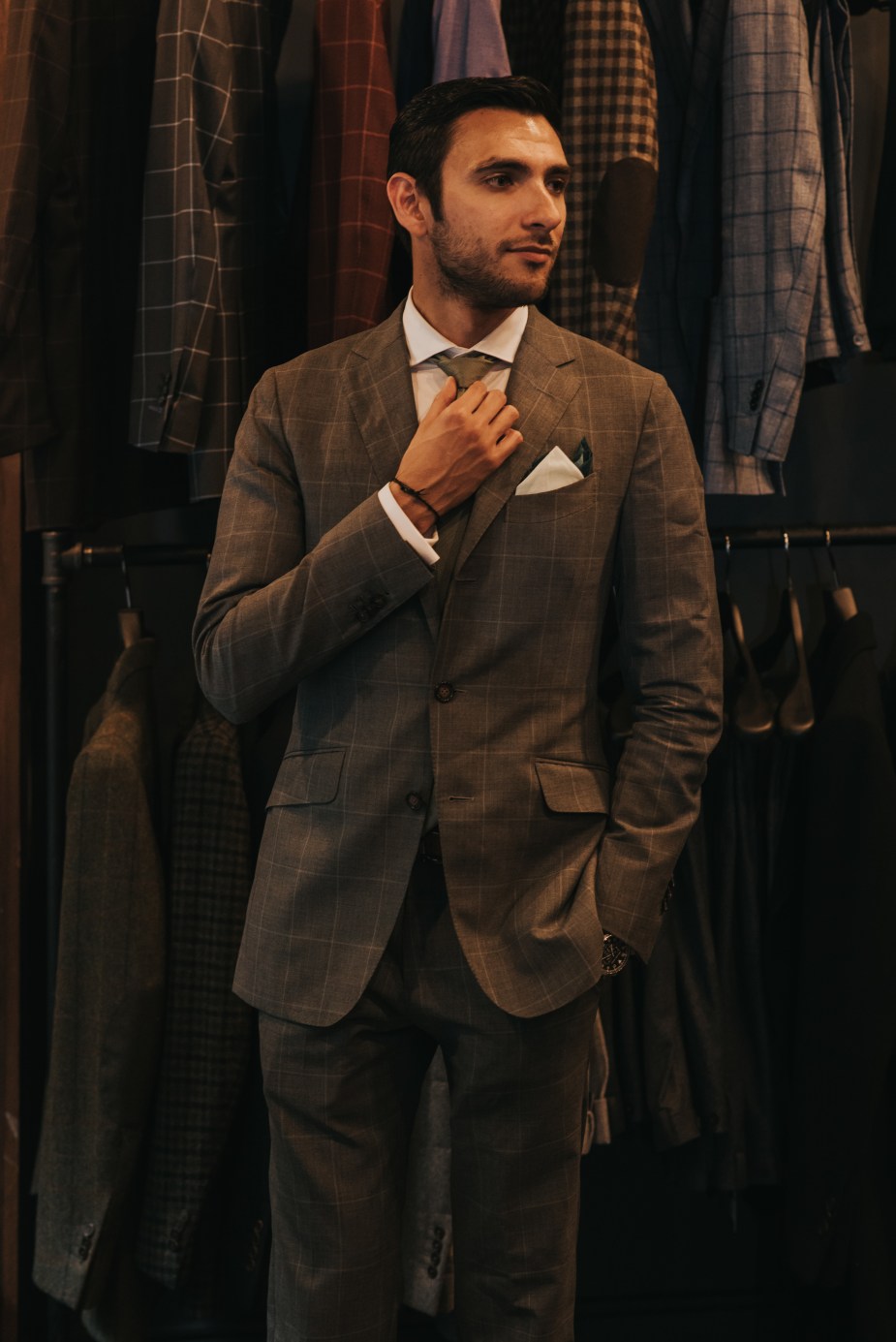 Para mi reunión con los Seattle Gents, decidí vestir precisamente este traje gris con patrón de cuadros de dos piezas que compré en Beckett & Robb hace algunas semanas. Todo empezó hace alrededor de mes y medio, cuando hice una cita en línea para asistir a la tienda del centro de Seattle para tomar mis medidas y diseñar un traje. Era mi primera vez comprando un traje hecho a la medida y Scott, quien administra la tienda de Seattle, se aseguró de que mi primera vez diseñando un traje fuera placentera y memorable. Desde elegir el tipo de tela, el estilo del traje, el número de botones, el tipo de solapa, de mancuernas, del forro interior, y otros pequeños detalles, Scott me guio por el proceso completo de diseñar un traje y, tras ser tomadas mis medidas, estas fueron enviadas a Europa para que el traje fuera cortado y armado en el viejo continente.