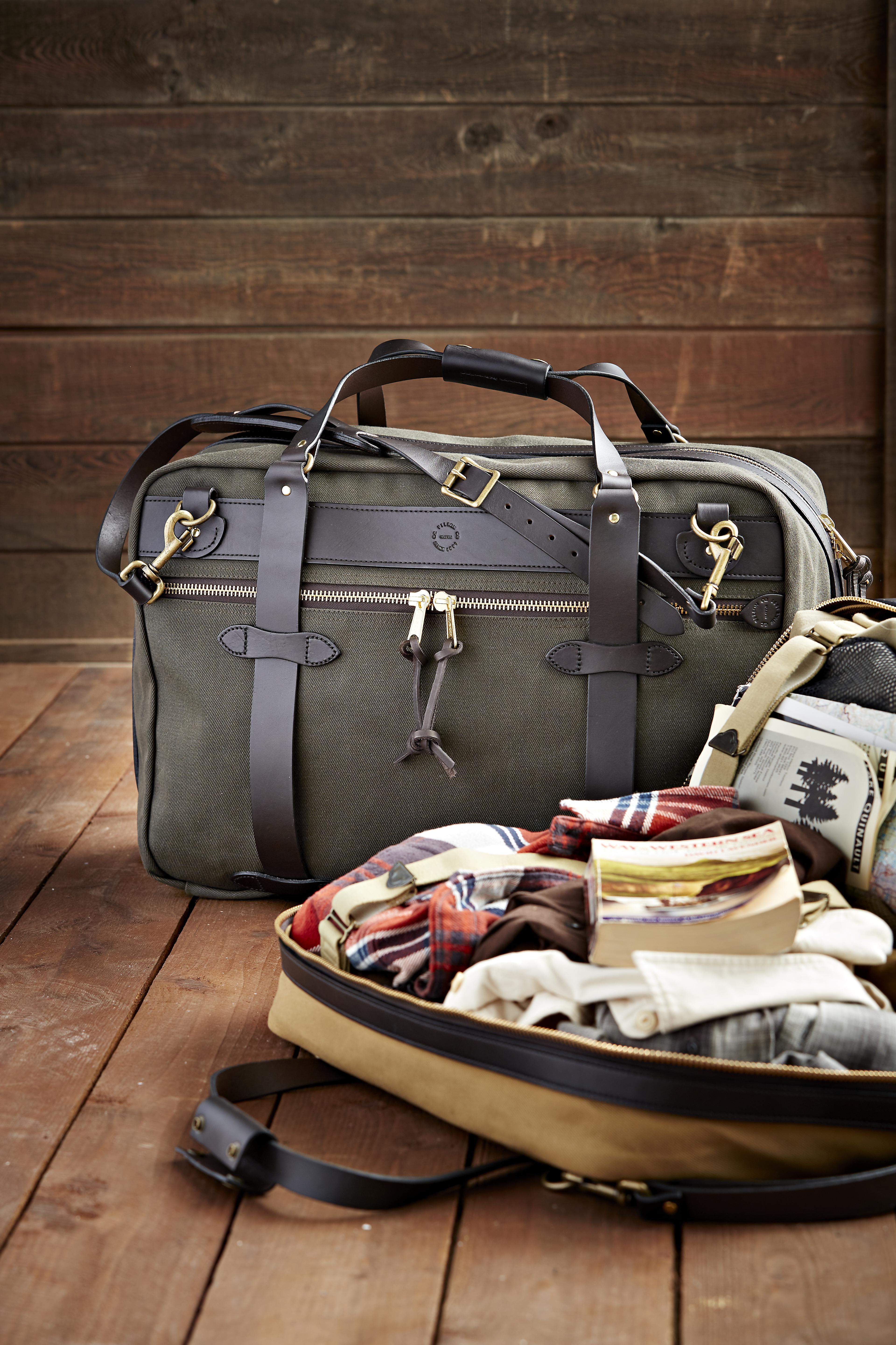 I’ve grouped my suggestions in three different categories: bags, clothes, and accessories. The first section is going to be about bags, because whether you’re going on a vacation, or a camping trip, or just for your every day work things, we as guys always need some stylish bags to put our stuff in, and Filson has got us covered. For instance, this all-purpose duffle pack is the perfect, two-in-one bag for either carrying your gym stuff or your soccer practice clothes as a duffle, and doubles up as a backpack for that camping trip or hike. The fabric it’s made of is lightweight, tear-resistant nylon, perfect to endure the elements of the weather no matter where dad takes it. It also has multiple pockets, which comes in handy when needing that extra space. The second bag I’m going to recommend is the small Pullman, which is designed to fit perfectly under that Pullman cart or under an airplane seat. It’s so spacious that it could be your only bag for a carry-on only flight, and features a removable leather strap for easy holding. Finally, the original briefcase is the perfect addition to your workbag inventory, with space for a 15″ laptop, eight pockets for organization, and an adjustable leather strap. Any of these three bags would definitely make dad feel super special!